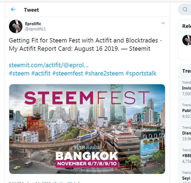 Welcome to this weeks review of the entries into the @actifit and @blocktrades sponsored Steem Fest 4 contest. If you don't know what Steem Fest is, check out everything about it in @roelandp's [official announcement here](https://busy.org/@roelandp/save-the-date-steemfest-bangkok-thailand-6-7-8-9-10-november-2019-let-s-go), you can also have a look at the [official web page](https://steemfest.com/). <center>  </center> -------------------- ## The Contest ## Just over two months ago, @anomadsoul [announced a contest](https://steemit.com/actifit/@anomadsoul/get-fit-with-actifit-and-blocktrades-and-win-a-steem-fest-ticket) in which the lucky winner will win a ticket to Steem Fest 4, and have their accommodation at the event paid for. The contest is open for everyone and anyone who uses @actifit, and @blocktrades and @actifit are joining efforts to gift a Steem Fest ticket + accommodation to one lucky Actifitter. Contestants have until October 13th to earn up to 2 entry tickets per week for the final raffle. All you have to do is use Actifit **during the weekend** and share your activity on Steem and you will receive one entry ticket; if you share that same activity in one of your other Social Media accounts, you will get an additional entry ticket for the final raffle. ### 1 Post each week and 1 share to social media is a total of 2 tickets ### 32 is the maximum number of raffle tickets that can be earned. ----------------------- ## Rules ## The following rules **must** be adhered to for the entry to be counted: - The activity posted on Steem must be made through the ACTIFIT application - The title for the post activity must be: Getting Fit for Steem Fest with Actifit and Blocktrades - The minimum activity (steps) to join this weekly contest is **15,000 steps**. Posts with less activity than 15k will not grant the user a raffle ticket - The user must include on their activity posts the tags **sfwithactifit** and **blocktradescontest** # For a full list of the rules and requirements, please read through the [contest announcement post](https://steemit.com/actifit/@anomadsoul/get-fit-with-actifit-and-blocktrades-and-win-a-steem-fest-ticket) by @anomadsoul. ### Please only post **one entry** from actifit **each week** with the **sfwithactifit** and **blocktradescontest** tags ### Multiple entries in the same week will be ignored and only the first entry each week will be counted ------------------------ ## Raffle Tickets Earned Thus Far ## By October 15th, each Steemian who joined this contest and followed the rules, will have between one and thirty two raffle entry tickets - One for the weekly post that adheres to the rules above, with a potential bonus ticket for sharing/promoting your post on other social media. #### Do this for 16 weeks and you can earn a total of 32 tickets for the raffle. #### The table below shows who has entered the contest, their total activity count, post count, promotion count, and the total number of tickets earned so far. The current maximum possible number of tickets so far is 16, made up of 8 posts with all 8 posts shared to social media. #### Account | Activity Total | Posts | Promotion | Tickets - | - | - | - | - actifit-peter | 150444 | 8 | 8 | 16 practicaleric | 241888 | 8 | 8 | 16 amico | 196692 | 8 | 8 | 16 flaxz | 145847 | 8 | 8 | 16 roger5120 | 293061 | 8 | 8 | 16 khimgoh | 154110 | 8 | 7 | 15 chireerocks | 106407 | 7 | 7 | 14 cryptospa | 150984 | 7 | 7 | 14 bluengel | 304780 | 8 | 5 | 13 jayna | 128557 | 7 | 5 | 12 kaerpediem | 112120 | 7 | 4 | 11 yousafharoonkhan | 97299 | 6 | 5 | 11 definethedollar | 98506 | 5 | 5 | 10 runridefly | 120959 | 7 | 2 | 9 ervin-lemark | 207843 | 8 | 0 | 8 browery | 185261 | 8 | 0 | 8 art4soul | 181692 | 8 | 0 | 8 homesteadlt | 160363 | 7 | 0 | 7 enormeanimal | 119862 | 6 | 0 | 6 wenchebakken | 109795 | 6 | 0 | 6 stupid | 79530 | 5 | 1 | 6 trayan | 53946 | 3 | 3 | 6 blind-spot | 47811 | 3 | 3 | 6 niallon11 | 53216 | 3 | 3 | 6 leeart | 85953 | 5 | 0 | 5 sumit71428 | 53383 | 3 | 2 | 5 steemflow | 61505 | 4 | 0 | 4 travoved | 73751 | 4 | 0 | 4 littlenewthings | 60222 | 4 | 0 | 4 moderndayhippie | 82952 | 4 | 0 | 4 fitnessgal | 62298 | 4 | 0 | 4 ciliegia | 53287 | 3 | 1 | 4 cryptof | 44443 | 2 | 2 | 4 abh12345.sports | 31136 | 2 | 2 | 4 vesytz | 53567 | 3 | 0 | 3 chuuuckie | 48055 | 3 | 0 | 3 jeronimorubio | 45977 | 3 | 0 | 3 priyanarc | 30775 | 2 | 1 | 3 thereikiforest | 44628 | 2 | 0 | 2 yhernanpalac | 36955 | 2 | 0 | 2 htliao | 35134 | 2 | 0 | 2 aaronli | 30460 | 2 | 0 | 2 farizal | 36810 | 2 | 0 | 2 dailyspam | 33606 | 2 | 0 | 2 chekohler | 33082 | 2 | 0 | 2 hungryanu | 30142 | 2 | 0 | 2 indianteam | 31262 | 2 | 0 | 2 eprolific | 18550 | 1 | 1 | 2 arrliinn | 15049 | 1 | 1 | 2 danielvehe | 20172 | 1 | 1 | 2 swedishdragon | 15042 | 1 | 1 | 2 uyobong | 16933 | 1 | 1 | 2 mariannewest | 15286 | 1 | 1 | 2 yogajill | 16825 | 1 | 1 | 2 crmilazz | 19319 | 1 | 1 | 2 rana2423 | 15082 | 1 | 1 | 2 gduran | 15090 | 1 | 0 | 1 xorb | 15080 | 1 | 0 | 1 enmy | 17059 | 1 | 0 | 1 casperbgd | 35125 | 1 | 0 | 1 minimining | 15432 | 1 | 0 | 1 jk6276 | 26336 | 1 | 0 | 1 onestopfacts | 16622 | 1 | 0 | 1 lologom | 22614 | 1 | 0 | 1 outlinez | 20842 | 1 | 0 | 1 mimismartypants | 17647 | 1 | 0 | 1 g10a | 21905 | 1 | 0 | 1 immarojas | 17281 | 1 | 0 | 1 hashzone91 | 15169 | 1 | 0 | 1 rmsbodybuilding | 21875 | 1 | 0 | 1 lawlees | 37657 | 1 | 0 | 1 aleksandra.mart | 17633 | 1 | 0 | 1 yena19 | 15322 | 1 | 0 | 1 sgbonus | 26240 | 1 | 0 | 1 stellastai | 27238 | 1 | 0 | 1 Grand Total | 5154781 | 251 | 114 | 365 # <sub><b>This data has been manually collected. If you feel there is an error then please let me know in the comments below and I will investigate.</b></sub> <sub><b>Data collected Friday 23rd August at 10 am CET. If you have posted today and do not think your entry has been included, don't worry, it will be added to the next post.</b></sub> ------------------------- ## Promote Steem and the Contest ## As well as earning you an additional ticket into 