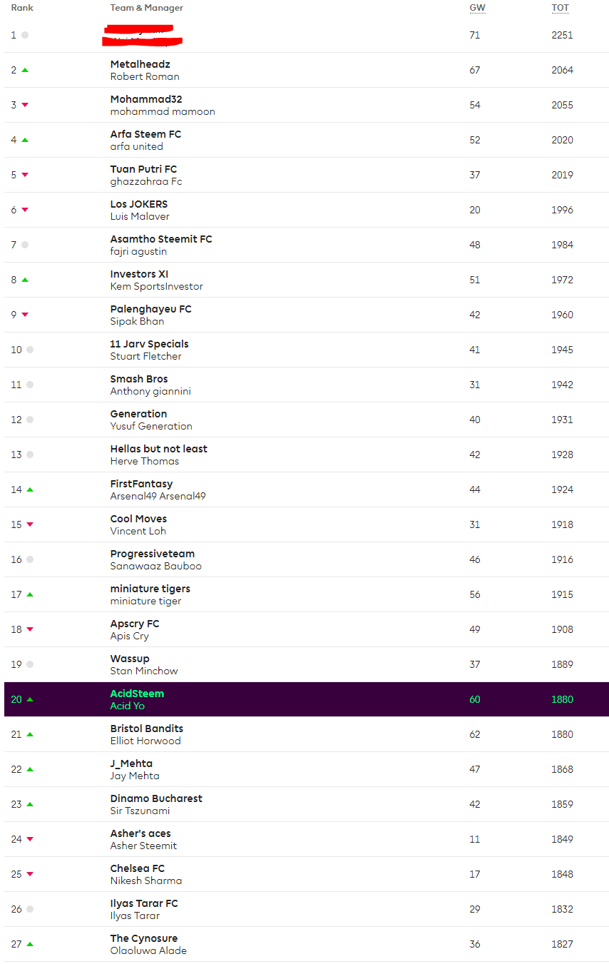 https://steemitimages.com/DQmfQC4jBGzemsNn26zyDjVLwRAgCJJgoNEiEdvZPHHu2H6/image.png ___ <center> The 34th week of the Premier League has been completed after West Ham United's game against Stoke City. Among the 10 games in the 34th week, the most notable game is the match Manchester United versus West Bromwich Albion at Old Trafford Stadium. Red Devils unexpectedly subdued from the team caretaker with a thin score 0-1 due to goals Jay Rodriguez in the 73rd minute. Because of this result, the Premier League title race competition "stalled" despite leaving five games. Manchester City came out as English Premier League champions because their achievement of 87 points is no longer possible overtaken other teams. Previously, Man City managed to beat host Tottenham Hotspur with a score of 3-1. In the closing match of the 34th week, West Ham United and Stoke City have to share points for a 1-1 draw at the London Stadium. ### Match Prediction Results with 9 out of 14 correct predictions, congratulations to @nova-nazirah, @steemwhalee and @fastold! with an amazing 10 out of 14 correct predictions, congratulations to @temitayo-pelumi! #### We are nearing the end of the season, with over 3000 Steem already collected for the League prize, it is getting very exciting in the Steem Fantasy League! Current Standings  </center> ___ https://steemitimages.com/0x0/https://media.discordapp.net/attachments/331165119612452894/353956387350380544/acidyo-posting-banner.gif