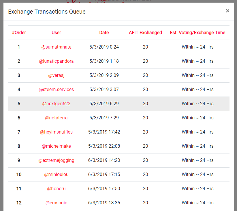 This update represents a compilation of the recent news, updates and projections about our Actifit project, including top actifitters for the preceding voting cycle, as well as updates on our account and delegations ! <center></center> #### Pending Exchange Queue & History Following our major release last week of the AFIT to STEEM upvotes exchange functionality, we are excited to present additional functionality that helps you track your current exchange/upvote completion. As of now, all users who properly verified their funds password, are able to view from the wallet screen two new links as below: <center></center> - **Exchange Queue**: This represents the current queue of users who made a transaction, and are pending receiving upvotes. <center></center> The list is sorted by date, and processed accordingly in a first in first out manner. You would see the user name, date, amount of AFIT tokens exchanged, and the estimated voting time. Keep in mind voting only occurs if at voting time you have a valid actifit report/post. If not, you will be moved to the next voting round. - **My History**: Which would display the transaction history you've had via exchanging AFIT tokens for STEEM upvotes. Any pending transactions will show here under status "In Progress" <center></center> We also adjusted the standard note to include relevant additional information <center></center> We believe this will help users better track when their next exchange vote is set to occur, particularly after the large community adoption of the AFIT exchange functionality, to which we are very thrilled and thankful, and which todate processed more than 7,000 AFIT token exchanges, and with a queue pending more than 160 exchanges. #### AFIT Token Stats & STEEM Payouts Sent During last week, our actifitters and delegators piled up more tokens. To date, Actifit has distributed over 26 Million AFIT tokens, to 40K+ token holders and 61K+ reported activity. <center></center> We also sent out today our weekly STEEM delegators share, which went out to 448 delegators, with a total amount of 133.335 STEEM and 35.276 SBD. P.S.: STEEM amount includes both SP and STEEM rewards for delegators, whereby each delegator receives liquid STEEM as a total for both amounts. --- Back to AFIT tokens. As per our weekly approach, you can check out our top 100 AFIT token holders below. _Keep in mind that you can check your AFIT token balance by visiting [actifit.io](https://actifit.io) or via our mobile app [Android](https://bit.ly/actifit-app) or [iOS](https://bit.ly/actifit-ios)._ #|Token Holder | AFIT Tokens Held | |---|---|---| 1|@freedom|2,433,480.349| 2|@julialee66|1,724,659.438| 3|@chairmanlee|1,623,741.335| 4|@humanearl|1,006,178.270| 5|@fitat40|805,696.588| 6|@trumpman|696,841.657| 7|@mobbs|669,819.522| 8|@selfvotejustice|653,253.080| 9|@rosatravels|635,471.681| 10|@fedesox|588,289.485| 11|@flauwy|549,277.529| 12|@cryptoeera|434,937.761| 13|@taskmaster4450|369,289.724| 14|@elfman2018|325,956.513| 15|@justtryme90|295,111.485| 16|@michelios|263,280.706| 17|@onetin84|245,031.977| 18|@toocurious|230,978.166| 19|@holbein81|225,839.357| 20|@j85063|215,313.752| 21|@onealfa|215,278.129| 22|@pault70|211,380.010| 23|@ruth-girl|205,776.761| 24|@parejan|192,101.414| 25|@wil.metcalfe|189,814.861| 26|@tangerinetravels|187,502.757| 27|@roknavy|178,851.818| 28|@buckydurddle|150,070.510| 29|@organduo|134,926.232| 30|@biophil|133,547.461| 31|@thing-2|124,492.153| 32|@ervin-lemark|119,829.707| 33|@michealb|117,252.058| 34|@kaylinart|112,520.263| 35|@davedickeyyall|112,382.994| 36|@extremejogging|111,880.061| 37|@shanibeer|111,083.518| 38|@beachready|96,301.036| 39|@egotheist|96,034.312| 40|@direwolf|95,103.306| 41|@elementm|93,654.151| 42|@forhappywomen|82,734.417| 43|@trevonjb|82,390.027| 44|@dandesign86|81,780.712| 45|@rhanna10km|81,480.136| 46|@astrophoto.kevin|81,302.084| 47|@axeman|80,419.675| 48|@shellyduncan|80,122.556| 49|@sunray|79,743.935| 50|@supersoju|78,347.843| 51|@dr-frankenstein|76,025.649| 52|@moderndayhippie|71,692.834| 53|@actifit-peter|71,029.824| 54|@myjourney|70,826.597| 55|@seareader1|69,065.308| 56|@edgarsart|69,018.679| 57|@jznsamuel|68,521.610| 58|@rehan12|66,667.746| 59|@acidzapps|65,435.795| 60|@neworleans|58,626.434| 61|@eftnow|57,552.298| 62|@syedubair|56,784.146| 63|@plokmi|56,758.878| 64|@abigail-dantes|54,738.940| 65|@sirknight|54,381.872| 66|@fotogruppemunich|53,933.228| 67|@drakos|53,266.649| 68|@arabsteem|52,678.695| 69|@amico|52,624.923| 70|@infidel1258|52,362.331| 71|@gattino|51,710.017| 72|@stats-generator|51,200.332| 73|@thereikiforest|50,499.942| 74|@ciuoto|50,364.885| 75|@birdbanter|49,652.425| 76|@lightsplasher|49,484.159| 77|@georgemales|49,429.495| 78|@dylanhobalart|47,585.214| 79|@wolf09|47,320.917| 80|@lordneroo|45,993.398| 81|@r2cornell|44,823.681| 82|@preparedwombat|44,477.300| 83|@kenny-crane|44,413.322| 84|@kokadi|44,284.632| 85|@favcau|40,151.928| 86|@runridefly|39,625.060| 87|@travelling-two|39,327.959| 88|@thebluewin|38,161.475| 89|@phelimint|37,930.131| 90|@niallon11|37,760.429| 91|@happy33|37,160.202| 92|@ticket4fun|37,073.531| 93|@movingman|37,003.430| 94|@giddyupngo|36,902.318| 95|@abh12345|36,517.558| 96|@browery|36,459.609| 97|@martusamak|36,454.130| 98|@newtechblog|35,109.552| 99|@elevator09|34,967.551| 100|@jaraumoses|34,183.239| ##### Witness Status In terms of our witness status, there hasn't been anything particular that requires attention. Our witness server continues to run smoothly. Below are some stats from last week: - We are ranked at position 41, both as actual and active rank. - We received votes from 689 steemians, compared to 659 last week. Thank you for the increased support! - No blocks were missed during the last week. Since our launch of the witness server, we have missed a single block. - We are witnessing an average of 23 blocks per day. To vote for our witness, use this [direct link](https://steemconnect.com/sign/account-witness-vote?witness=actifit&approve=1) Or visit [Steem