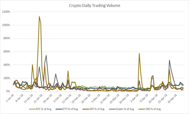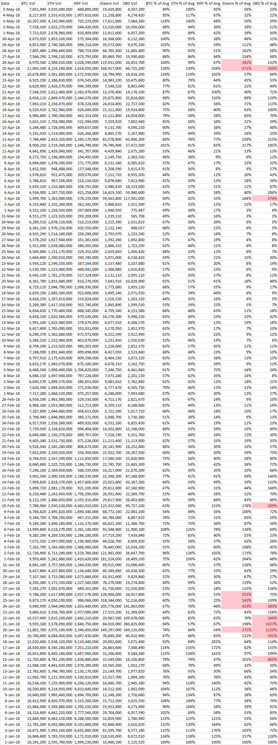 Index - https://steemit.com/tax/@alhofmeister/3ibscz-accounting-and-finance-blog-index <b>Introduction</b> With the latest spike in Steem/SBD, I thought it would be interesting to examine the trading volume of Steem, SBD and the largest cryptocurrencies. Although high trading volumes do not necessarily indicate market manipulation, the likelihood of organic trading at +3x the YTD average trading volumes in a single day are unlikely. In my analysis, days suspected of pump and dump schemes are identified by trading values over 3x the average daily value. As the market capitalization of SBD is significantly lower than Steem, it is more susceptible to manipulation. The most recent spike is, in my opinion, likely attributed to developing news on Steem exchange listings and not market manipulation. <b>Chart</b>  <b>Raw Data</b>  <b>References</b> https://coinmarketcap.com/currencies/bitcoin/historical-data/ https://coinmarketcap.com/currencies/ethereum/historical-data/ https://coinmarketcap.com/currencies/ripple/historical-data/ https://coinmarketcap.com/currencies/steem/historical-data/ https://coinmarketcap.com/currencies/steem-dollars/historical-data/