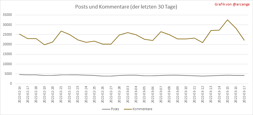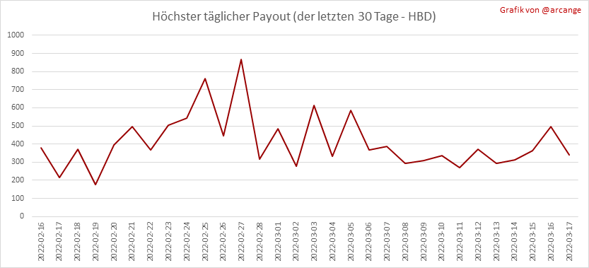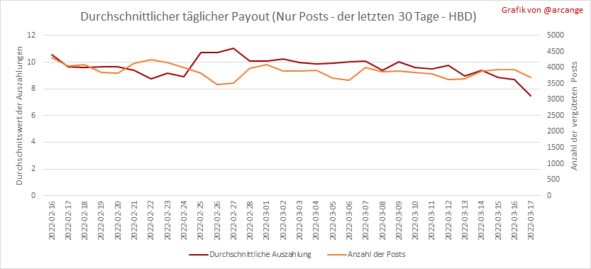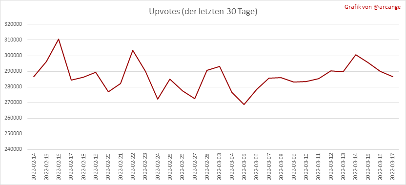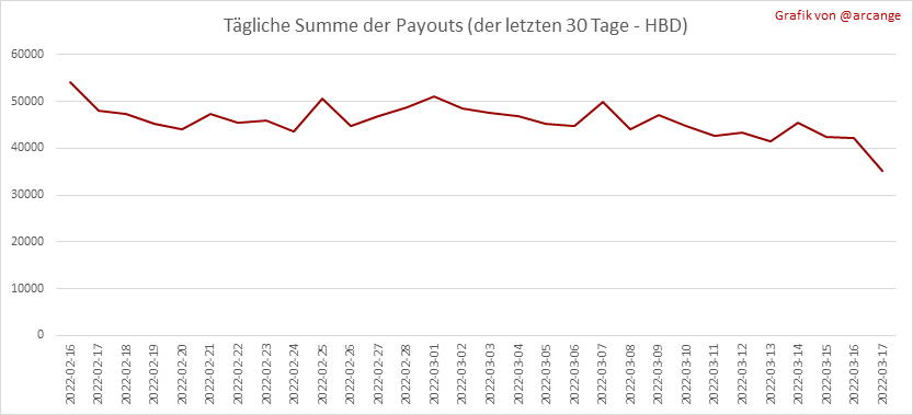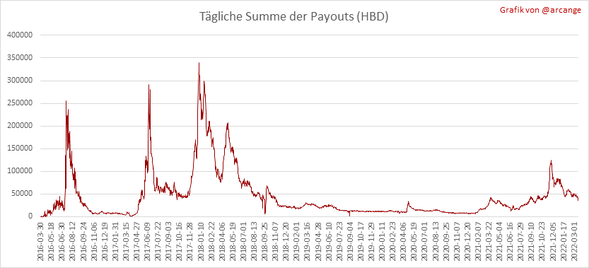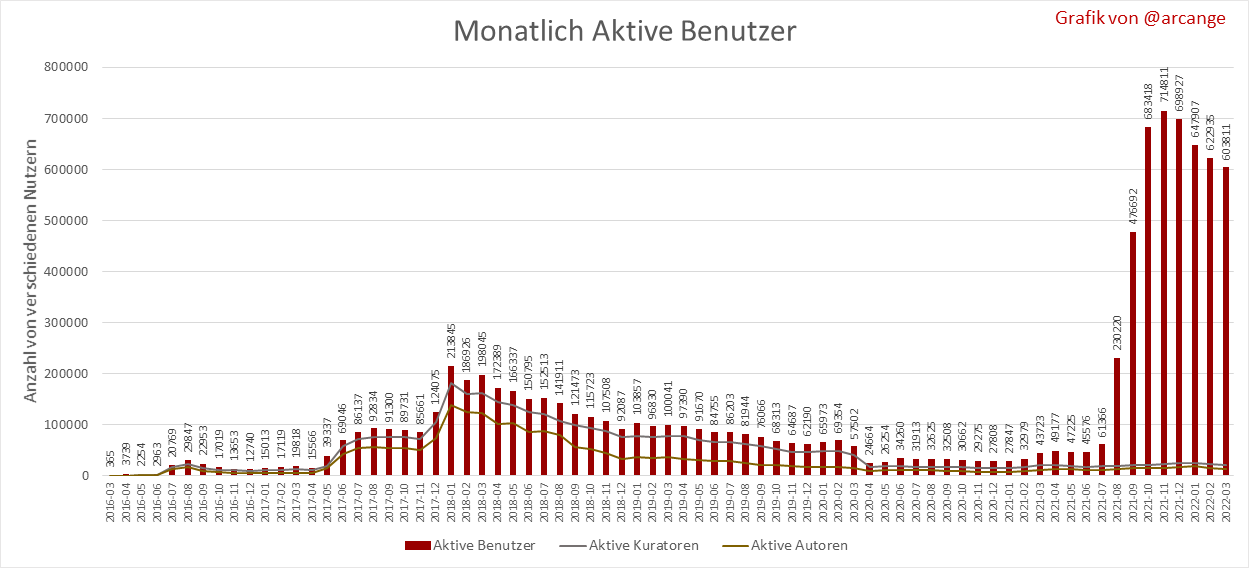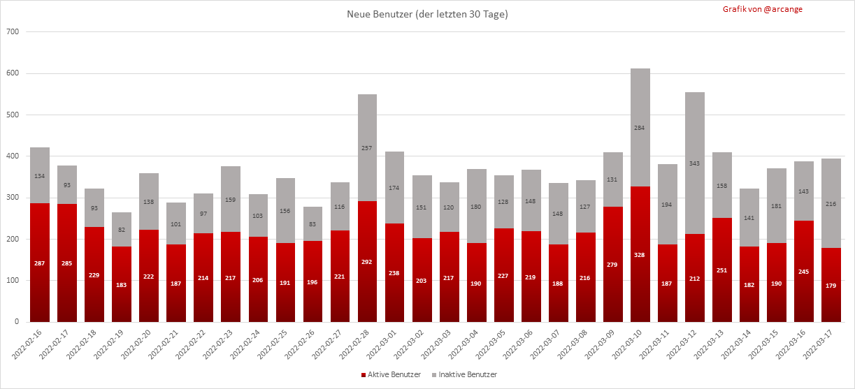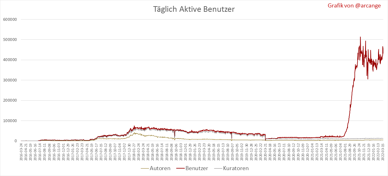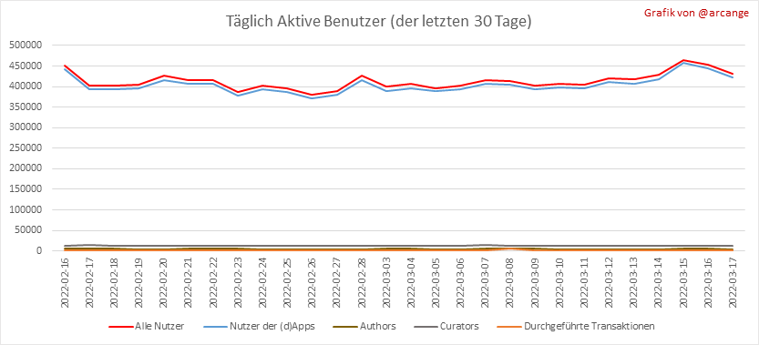 <center></center> ### Willkommen zum täglichen Analysebericht der Hive-Blockchain. Alle in diesem Bericht enthaltenen Informationen basieren auf den Daten, die auf der Blockchain bis 2022-03-17 Mitternacht UTC gesammelt wurden. Ziel dieses Berichts ist es, einen klaren Überblick über die Vorgänge auf der Hive-Blockchain zu verschaffen. <sub> This post is translated in English - [here](/@arcange/hive-statistics-20220317-en)</sub> <sub> Este post está traducido al español - [aquí](/@arcange-es/hive-statistics-20220317-es)</sub> <sub> Une version en français de ce post est disponible - [ici](/@arcange-fr/hive-statistics-20220317-fr)</sub> ### 1. Neue Nutzer  Diese Tabelle zeigt die Anzahl der neu registrierten Benutzer auf der Blockchain und wie viele von ihnen aktiv sind. Das Diagramm ist dynamisch! Ein Benutzer kann sich an einem Tag registrieren und erst ein paar Tage später aktiv werden. Daher kann sich die Anzahl der aktiven Benutzer an einem bestimmten Datum von Tag zu Tag ändern. ||| |-|-| ||| Diese beiden Grafiken zeigen, wer am letzten Tag neue Konten erstellt hat, und die Gesamtzahl der registrierten Konten. Die rote Linie zeigt an, wie viele der Konten mindestens einmal aktiv waren (aktiv bedeutet, einen Beitrag zu veröffentlichen, zu kommentieren oder zu voten). Sie zählen dazu, auch wenn sie später inaktiv werden. ### 2. Aktive Nutzer ||| |-|-| |||  Diese Grafiken zeigen die Aktivität der Benutzer über die Zeit und im Detail für die letzten 30 Tage. In diesen Diagrammen definiert man "aktive Nutzer" als diejenigen, die jede Art von Transaktion in der Blockchain ausführen. Das letzte Diagramm ist eine monatliche Zusammenfassung der aktiven Benutzer. Vorsicht beim interpretieren vom Wert der letzten Spalte, denn er kann viel niedriger sein, wenn das Monatsende noch nicht erreicht ist. ### 3. Apps & (d)Apps  Diese Grafik zeigt, welche Apps am häufigsten zum Veröffentlichen von Posts und Kommentaren verwendet werden. Man beachte dabei, dass ein und derselbe Benutzer mehrere verschiedene Apps verwenden kann.  Dieses Diagramm zeigt, welche Apps die meisten Aktivitäten (custom_json-Operationen) in der Blockchain generieren. ### 4. Posts und Kommentare ||| |-|-| ||| Diese Grafiken zeigen die Entwicklung von Posts und Kommentaren über die gesamte Blockchain-Lebensdauer und der letzten 30 Tage. ### 5. Kuration ||| |-|-| ||| Diese Grafiken zeigen die Entwicklung der Kuration (Upvotes) über die gesamte Blockchain-Lebensdauer und der letzten 30 Tage. ### 6. Tägliche Transaktionen  |||| |-|-|-| |||| Diese Grafiken zeigen die Anzahl der Transaktionen pro Tag, die höchste Anzahl an Transaktionen pro Block, die durchschnittliche Anzahl an Transaktionen pro Block und die Anzahl der Transaktionen pro Block in den letzten 48 Stunden. Hier bekommt man eine Vorstellung von der gesamten Aktivität auf der Blockchain.  Diese Grafik zeigt die Verteilung der 10 wichtigsten Transaktionstypen nach der Anzahl der in der Blockchain ausgeführten Vorgänge. ### 7. Communities und Tags  Diese Grafik zeigt die Communitys mit den meisten Abonnenten. ||| |-|-| ||| Diese Grafiken zeigen die aktivsten Communitys nach Anzahl der Beiträge (Über die gesamte Blockchain-Lebensdauer und am letzten Tag). ||| |-|-| ||| Diese Grafiken zeigen, welche Haupt-Tags für die Veröffentlichung von Posts über die gesamte Blockchain-Lebensdauer und am letzten Tag am häufigsten verwendet wurden. ### 8. Verteilung |||||| |:-:|:-:|:-:|:-:|:-:| |||||| |<sub>< ~544 HP</sub>|<sub>>= ~544 HP</sub>|<sub>>= ~5439 HP</sub>|<sub>>= ~54390 HP</sub>|<sub>>= ~543892 HP</sub>| ||| |-|-| ||| Diese Grafiken zeigen die Anzahl der Benutzer entsprechend ihrer Hive Power. Das linke Diagramm zeigt die Verteilung ohne Berücksichtigung von delegierter Hive Power, die von den Konten vorgenommen oder empfangen wurden. Das rechte Diagramm inkludiert die Delegierungen, fügt die empfangene HP-Delegierung hinzu und subtrahiert die abgegebene HP-Delegierung. Der graue Teil jeder Spalte gibt an, wie viele Konten inaktiv sind (all Diejenigen, die in den letzten 30 Tagen nicht gepostet, kommentiert oder gevotet haben). ||| |-|-| ||| Diese Grafik zeigt die Verteilung der Hive Power pro Kontolevel. Das linke Diagramm zeigt die Verteilung ohne Berücksichtigung von Delegierungen, die von den Konten vorgenommen oder empfangen wurden. Die rechten Diagramme berücksichtigen die Delegierung, fügen die empfangene HP-Delegierung hinzu und subtrahieren die abgegebene HP-Delegierung. Der graue Teil jeder Spalte zeigt nicht genutzte Hive Power durch inaktive Konten an (siehe oben die Definition von inaktiv). Unter jeder Spalte sieht man auch das Verhältnis zu der gesammten vorhandenen Hive Power. ### 9. Auszahlungen  Diese Grafik zeigt den jeweils höchsten Payout, der in den letzten 30 Tagen für einen Beitrag (oder Kommentar) gezahlt wurde. ||| |-|-| ||| Diese Grafiken zeigen die Summe der verteilten Auszahlungen (Beiträge und Kommentare) an jedem Tag. ||| |-|-| ||| Diese Grafiken zeigen den durchschnittlichen Medianwert des Payouts pro Post der letzten 30 Tage. --- Ich hoffe, ihr findet diese Statistiken nützlich. Solltet ihr noch zusätzliche Statistiken sehen wollen, könnt ihr mir gerne einen Kommentar schreiben. Feedback ist willkommen. Danke fürs Lesen. --- <center> ### Entdecken Sie meine Anwendungen und Dienste <a href="/hive/@hive.engage/stay-connected-with-your-hive-audience-and-catch-attention"><img src="https://i.imgur.com/GiNJqlm.png"></a><a href="/@hivebuzz"><img src="https://i.imgur.com/B4UTun2.png"></a><a href="/@hivesql"><img src="https://i.imgur.com/EPN8RW6.png"></a><a href="/hive/@arcange/introducing-hive-account-recovery"><img src="https://i.imgur.com/6TWeW7V.png"></a><a href="/@hive.autoclaim"><img src="https://i.imgur.com/ih2pEOw.png"></a></center> <center> ### [Vote für mein witness ](https://hivesigner.com/sign/account-witness-vote?witness=arcange&approve=1) </center>