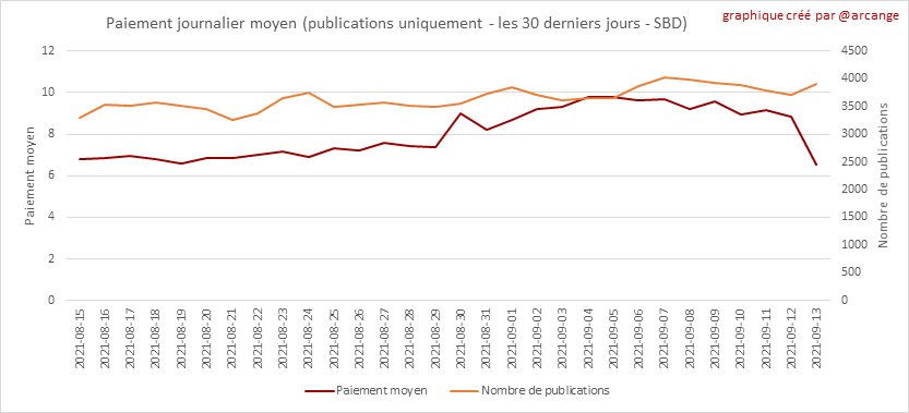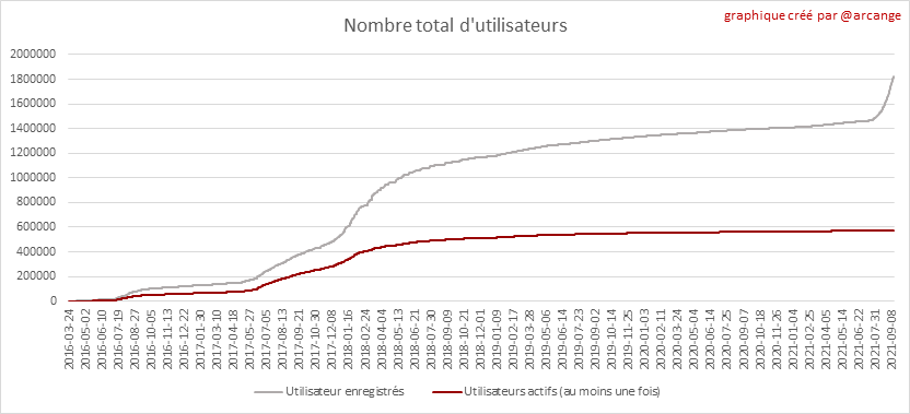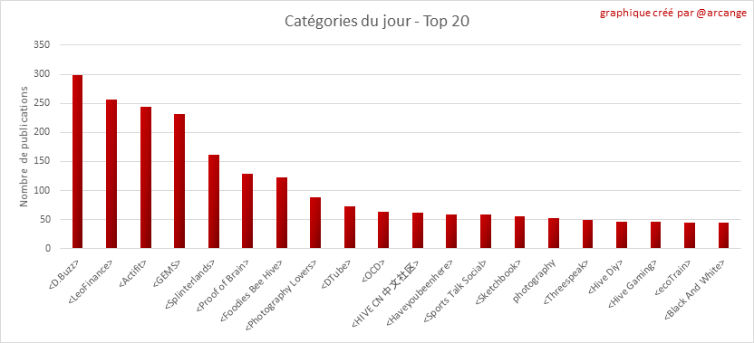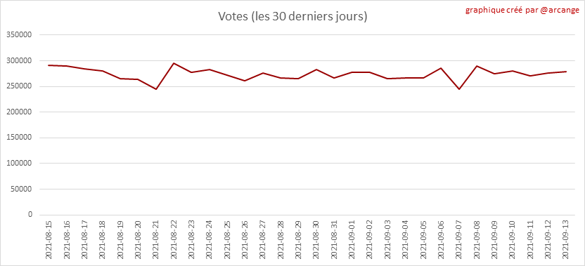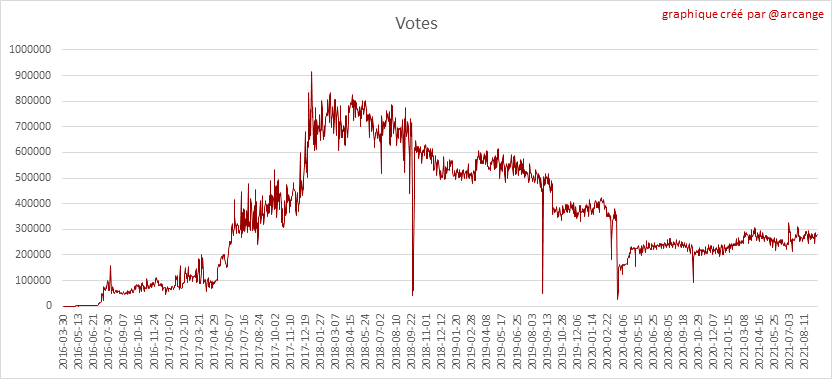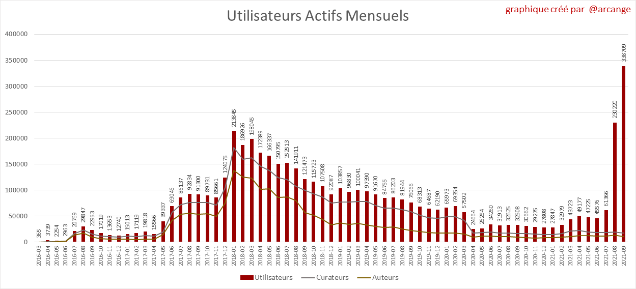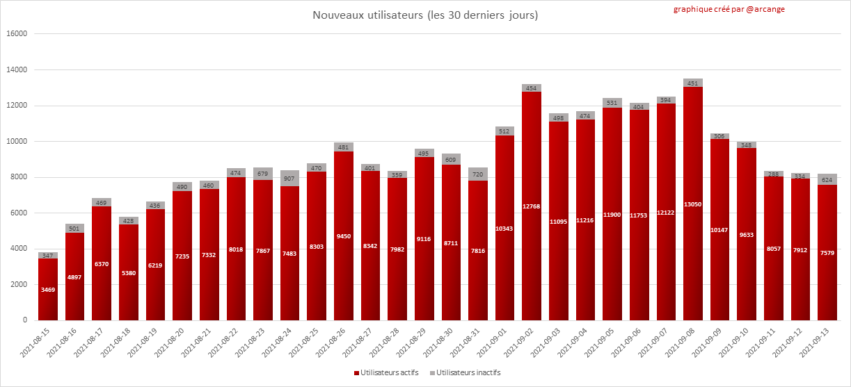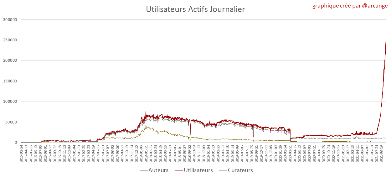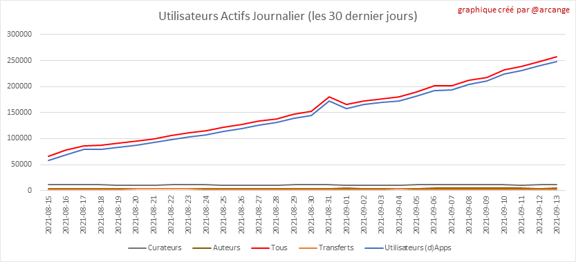 <center></center> ### Bienvenue dans le rapport d'analyse journalier de la blockchain Hive. Toutes les informations présentées dans ce rapport sont basées sur les données collectées dans la blockchain jusqu'au 13-09-2021 à minuit, heure UTC. L'objectif de ce rapport est de vous fournir une vision claire de ce qui se passe quotidiennement dans la blockchain Hive. <sub> This post is translated in English - [here](/statistics/@arcange/hive-statistics-20210913-en)</sub> <sub> Este post está traducido al español - [aquí](/statistics/@arcange-es/hive-statistics-20210913-es)</sub> <sub> Dieser Beitrag ist ins Deutsche übersetzt - [hier](/statistics/@arcange-de/hive-statistics-20210913-de)</sub> ### 1. Nouveaux utilisateurs  Ce graphique montre le nombre d'utilisateurs nouvellement inscrits sur la blockchain et combien d'entre eux sont devenus actifs. Nous voyons que beaucoup de comptes sont enregistrés, mais jamais utilisés. Ce graphique est un peu dynamique! Un utilisateur peut s'inscrire un jour et ne devenir actif que quelques jours plus tard. Par conséquent, le nombre d'utilisateurs actifs à une date donnée peut varier d'un jour à l'autre. ||| |-|-| ||| Ces deux graphiques montrent qui a créé de nouveaux comptes le dernier jour et le nombre total de comptes enregistrés. La ligne rouge indique combien d'entre eux ont été actifs au moins une fois (par utilisateurs actifs, j'entends ceux qui ont fait au moins une publication, un commentaire ou une vote). Ils sont inclus même s'ils deviennent inactifs plus tard. ### 2. Utilisateurs actifs ||| |-|-| |||  Ces graphiques montrent l'activité des utilisateurs dans le temps et de manière plus détaillée pour les 30 derniers jours. Dans ces graphiques, les "utilisateurs actifs" sont ceux qui ont effectué au moins une transaction sur la blockchain, quelque soit le type de transaction. Le dernier graphique est un résumé mensuel des utilisateurs actifs. Attention en interpretant la valeur de la dernière colonne qui peut être largement inférieure si la fin du mois n'a pas encore été atteinte. ### 3. Applications  Ce graphique montre quelles applications sont les plus utilisées pour publier des articles et des commentaires. Veuillez noter qu'un même utilisateur peut utiliser plusieurs applications différentes.  Ce graphique montre quelles sont les applications qui génèrent le plus d'activité (operations custom_json) sur la blockchain. ### 4. Publications et commentaires ||| |-|-| ||| Ces graphiques montrent l'évolution des publications et des commentaires pour toute la durée de vie de la blockchain et pour les 30 derniers jours. ### 5. Curation ||| |-|-| ||| Ces graphiques montrent l'évolution de la curation (votes positifs) depuis la création de la blockchain et pour les 30 derniers jours. ### 6. Transactions journalières  Ce graphique montre le nombre de transactions quotidiennes. Cela vous donne une idée de l’ensemble de l’activité sur la blockchain.  Ce graphique montre la répartition des 10 principaux types de transactions par nombre d'opérations effectuées sur la blockchain. ### 7. Communautés et catégories  Ce graphique montre les communautés avec le plus d'abonnés. ||| Ces graphiques montrent les communautés les plus actives en termes de publications depuis la leur création et pour le jour passé. ||| |-|-| ||| Ce graphique montre les catégories les plus utilisées pour les publications depuis la création de la blockchain et ce dernier jour. ### 8. Distribution ||| |-|-| ||| Ce graphique montre la répartition de la réputation entre les utilisateurs. Les comptes dont la réputation est inférieure à 25 ont été supprimés pour que le graphique reste lisible.  Ce graphique montre le nombre d'utilisateurs en fonction de leur Hive Power. Le graphique de gauche montre la répartition sans tenir compte des délégations données ou reçues. Le graphique de droite prend en compte la délégation en additionant les délégations reçues et en soustrayant les délégations données. La partie grise de chaque colonne indique le nombre de comptes inactifs (ceux qui n'ont plus publié, commenté ou voté depuis 30 jours). ||| |-|-| ||| Ce graphique montre la distribution de Hive Power cumulée par niveau de compte. Le graphique de gauche montre la répartition sans tenir compte des délégations données ou reçues. Le graphique de droite prend en compte la délégation en additionant les délégations reçues et en soustrayant les délégations données. La partie grise de chaque colonne indique le Hive Power inutilisé par les comptes inactifs (voir la définition d'inactif ci-dessus). Au-dessous de chaque colonne, vous verrez également le ratio par rapport au total de Hive Power existant. ### 9. Evolution des paiements  Ce graphique montrent la récompense maximale payée sur un message (ou un commentaire) au cours des 30 derniers jours. ||| |-|-| ||| Ces graphiques montrent le total des paiements distribués (publications et commentaires) pour chaque jour. ||| |-|-| ||| Ces graphiques montrent les paiements moyens et médians par publication au cours des 30 derniers jours. --- J'espère que vous trouverez ces statistiques utiles. Si vous souhaitez voir des statistiques différentes, n'hésitez pas à me laisser un commentaire. Vos remarques sont plus que bienvenues. --- <center> ### Découvrez mes applications et services <a href="/hive/@hive.engage/stay-connected-with-your-hive-audience-and-catch-attention"><img src="https://i.imgur.com/GiNJqlm.png"></a><a href="/@hivebuzz"><img src="https://i.imgur.com/B4UTun2.png"></a><a href="/@hivesql"><img src="https://i.imgur.com/EPN8RW6.png"></a><a href="/hive/@arcange/introducing-hive-account-recovery"><img src="https://i.imgur.com/6TWeW7V.png"></a><a href="/@hive.autoclaim"><img src="https://i.imgur.com/ih2pEOw.png"></a></center> <center> ### [Votez pour moi comme Witness ](https://hivesigner.com/sign/account-witness-vote?witness=arcange&approve=1)
