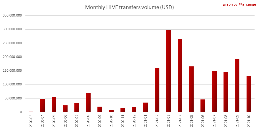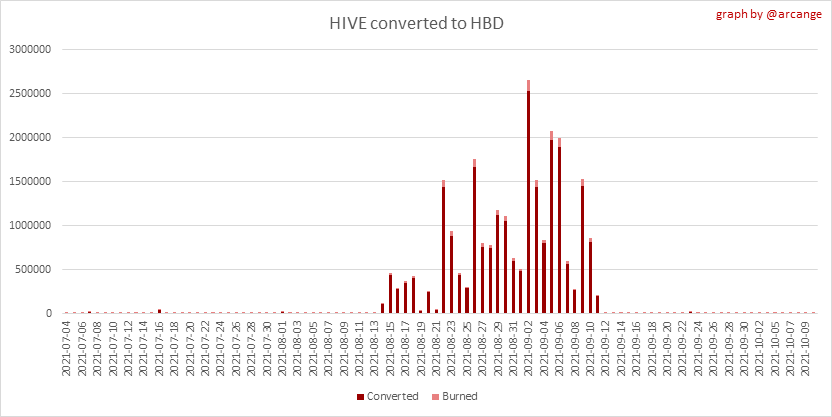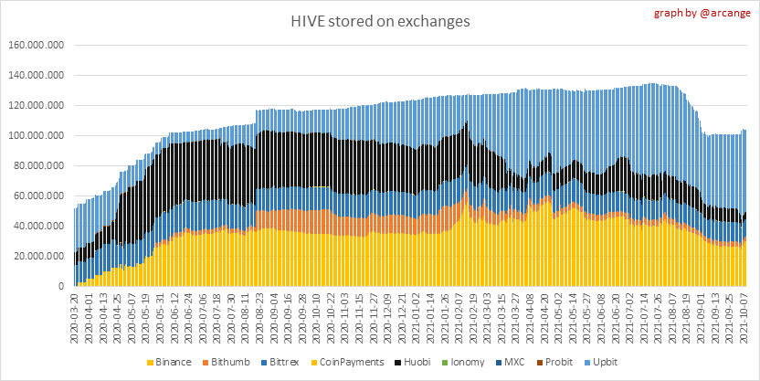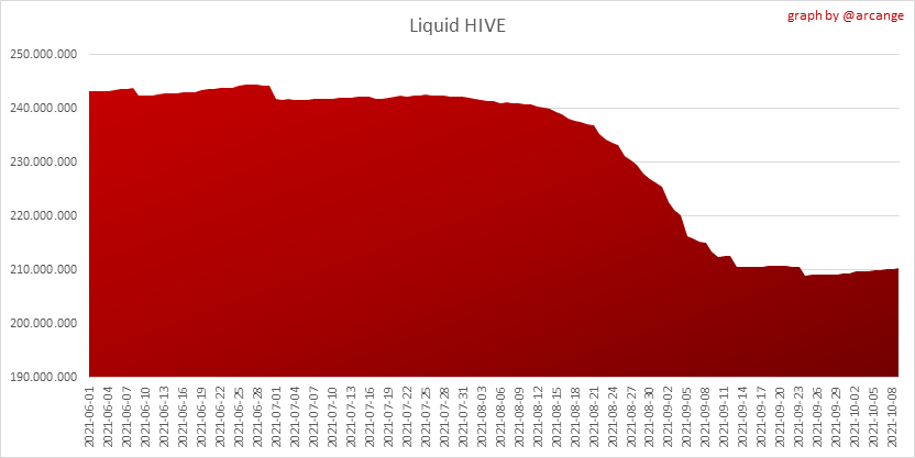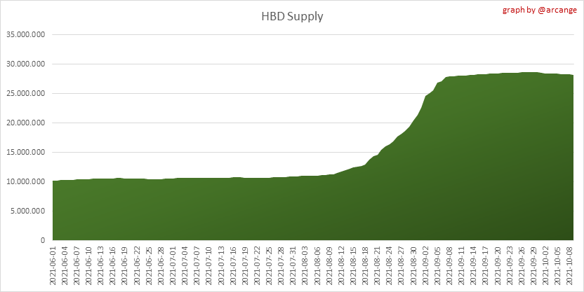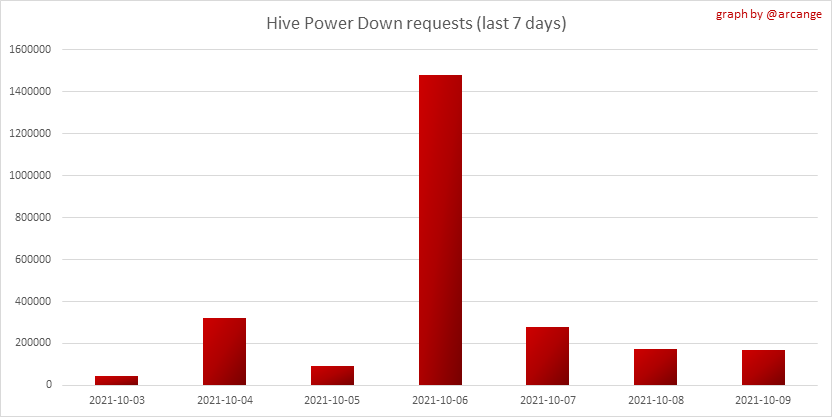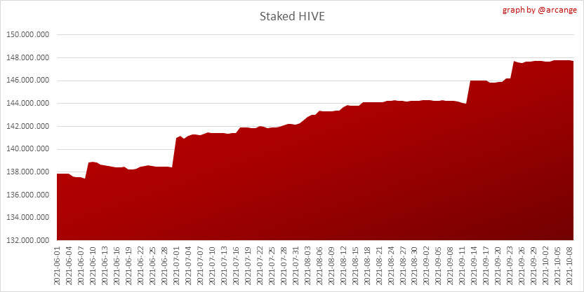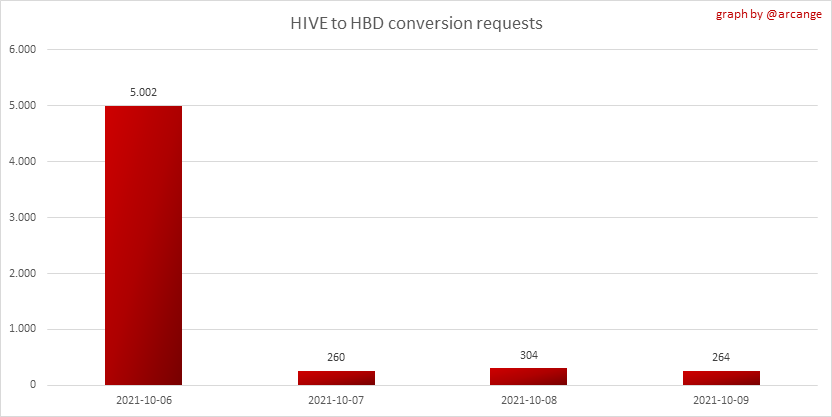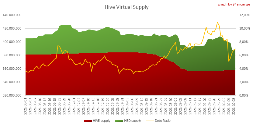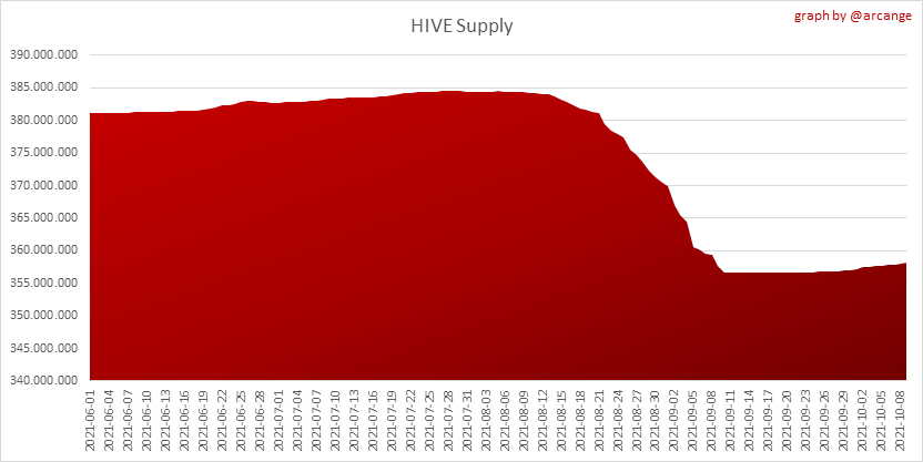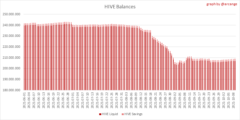 <center></center> ### Welcome to the daily financial report about the Hive blockchain. All the information presented in this report is based on the data collected from the blockchain until 2021-10-09 midnight UTC. This report aims to provide you with a clear view of what is happening on the Hive blockchain. <sub> Este post está traducido al español - [aquí](/@arcange-es/hive-finance-20211009-es)</sub> <sub> Dieser Beitrag ist ins Deutsche übersetzt - [hier](/@arcange-de/hive-finance-20211009-de)</sub> <sub> Une version en français de ce post est disponible - [ici](/@arcange-fr/hive-finance-20211009-fr)</sub> ### 1. Price ||| |-|-| ||| These graphs show the evolution of prices in USD for HIVE and HBD. ### 2. Supply  This graph shows the evolution of HIVE virtual Supply. The virtual supply is the sum of HIVE supply (liquid and staked HIVE) and HBD supply (converted into HIVE). The graph also displays the debt ratio (HBD supply / HIVE virtual supply). Keep in mind that since hardfork 24 funds in the treasury ([@hive.fund HBD balance](https://peakd.com/@hive.fund/wallet)) don't count towards the HBD debt ratio. ||| |-|-| ||| These graphs show the evolution of the HIVE Supply (both liquid and staked) and the HBD supply. ||| |-|-| || These charts show the evolution of the liquid HIVE and the staked HIVE (Hive Power).  This graph shows the overall Hive tokens distribution. ### 3. HBD Savings _<sub>**Note:** As of 2021-06-30 (HF25) interest is only paid for HBD which are stored in savings.</sub>_  |Account|Deposit|Account|Withdrawal| |-|-:|-|-:| |@leprechaun|1,440.209 HBD|@grot|40,340.063 HBD| |@eliel|1,052.170 HBD|@punt|30,295.948 HBD| |@knarf|551.728 HBD|@xmauron3|2,741.317 HBD| |@empoderat|501.000 HBD|@mango-juice|819.258 HBD| |@muenchen|443.275 HBD|@purepinay|546.060 HBD| |@sc-steemit|294.483 HBD|@jongcl|104.000 HBD| |@hamsterpoweriii|244.435 HBD|@m3ss|101.232 HBD| |@bambuka|140.000 HBD|@tejimundo|90.153 HBD| |@mproxima|110.000 HBD|@methus|89.261 HBD| |@m31|99.468 HBD|@kcwonders|50.000 HBD| This graph shows how much and how many accounts store HBD in savings. The table below shows the topmost HBD deposits and withdrawals of the day.  This chart shows the amount of interest paid each day for holding HBD and how many accounts received such interest.  This chart is the same as the previous one, but data are grouped by month. ### 4. Balances  This graph shows the number of HIVE, both liquid and in savings, held by all accounts.  This graph shows the number of HBD, both liquid and in savings, held by all accounts. ### 5. Conversions <sub>_**Note:** As a reminder, conversion requests are only finalized after 3 days. It is only then that it is known exactly how many HIVE were burned in return for the HBD received at the time of the conversion request._</sub>  This graph shows the number of HIVE collateralized due to requests to convert HIVE to HBD over the past few days. ||| |-|-| ||| These graphs show the number of HIVE effectively used by the conversion process (HIVE converted and 5% HIVE fee which is burned) each day and month when requests to convert HIVE to HBD have been finalized. ||| |-|-| ||| These graphs show the number of HBD burned, each day and each month, following requests to convert HBD to HIVE. ### 6. Powerup and Powerdown  |Date|Account|Amount| |-|-|-:| |2021-10-09 07:14:30|@ohanahealing|68,058.330 HIVE| |2021-10-09 09:47:36|@alexna|35,424.459 HIVE| |2021-10-09 12:33:57|@violetmed|12,001.348 HIVE| |2021-10-09 08:32:42|@maxuve|9,629.824 HIVE| |2021-10-09 02:55:18|@coinomite|7,877.397 HIVE| |2021-10-09 11:22:57|@fatimajunio|5,132.184 HIVE| |2021-10-09 02:10:06|@bckc-capital-llc|3,935.863 HIVE| |2021-10-09 02:10:09|@bckc-capital-llc|3,935.863 HIVE| |2021-10-09 11:23:21|@hiro-hive|3,417.122 HIVE| |2021-10-09 11:19:42|@binhtien|2,569.093 HIVE| This graph and table show the amount of powerdown initiated over the last 7 days, and the largest initiated on this day.  |Account|Powerup|Account|Powerdown| |-|-:|-|-:| |@coinomite|2,500.000 HIVE|@riverhead|74,807.309 HIVE| |@ele7|2,324.794 HIVE|@dhimmel|13,706.005 HIVE| |@steemitboard|1,177.778 HIVE|@buildawhale|5,817.028 HIVE| |@mmmmkkkk311|1,089.000 HIVE|@talentclub|4,003.152 HIVE| |@mituoshizhe|1,000.990 HIVE|@themonetaryfew|3,944.274 HIVE| |@fujifluz42|601.000 HIVE|@omonomo|3,820.905 HIVE| |@starjewel|499.939 HIVE|@bdvoter|3,556.199 HIVE| |@josehany|256.200 HIVE|@revisesociology|2,385.336 HIVE| |@cryptothesis|218.449 HIVE|@technological|2,191.523 HIVE| |@cy100|193.000 HIVE|@nonameslefttouse|2,005.845 HIVE| This graph shows the daily HIVE power-up, power-down, and the resulting variation over the last 30 days. The table shows the topmost power-ups and power-downs of the day.  This graph shows the monthly HIVE power-up, power-down and the resulting variation. **Values for the last 3 months** |Period|Powerup|Powerdown|Difference| |-|-:|-:|-:| |2021-10|233,795.000|810,393.000|<div class="phishy">-576,598.000</div>| |2021-09|4,552,777.000|2,892,984.000|1,659,793.000| |2021-08|3,212,814.000|3,144,598.000|68,216.000| ### 7. Transfers ||| |-|-| ||| These graphs show the volume (in USD) of HIVE and HBD transferred between accounts. ### 8. Exchanges ||| |-|-| ||| These graphs show the amount and distribution of HIVE and HBD stored on the exchanges where they are listed. ||| |-|-| ||| These graphs show the daily evolution of HIVE and HBD stored on the exchanges where they are listed. --- I hope you find those stats useful. If you would like to see additional stats, feel free to drop me a comment. Your feedback is than welcome. Thanks for reading. --- <center> ### Check out my apps and services <a href="/hive/@hive.engage/stay-connected-with-your-hive-audience-and-catch-attention"><img src="https://i.imgur.com/GiNJqlm.png"></a><a href="/@hivebuzz"><img src="https://i.imgur.com/B4UTun2.png"></a><a href="/@hivesql"><img src="https://i.imgur.com/EPN8RW6.png"></a><a href="/hive/@arcange/introducing-hive-account-recovery"><img src="https://i.imgur.com/6