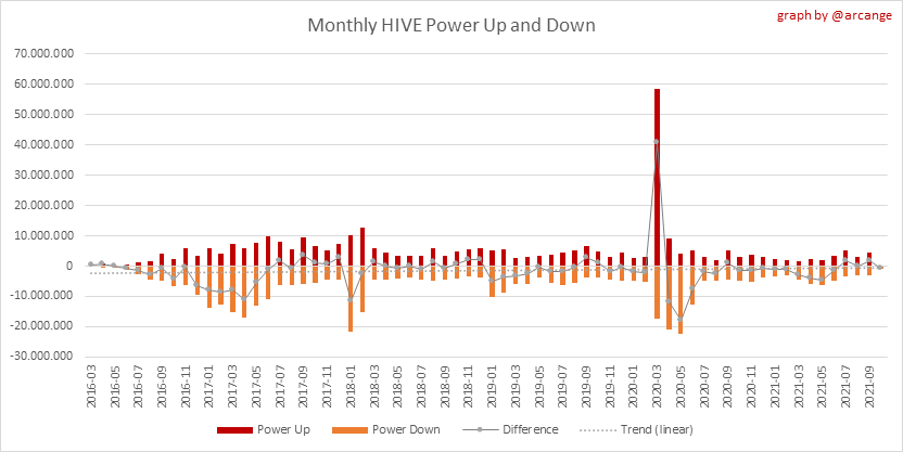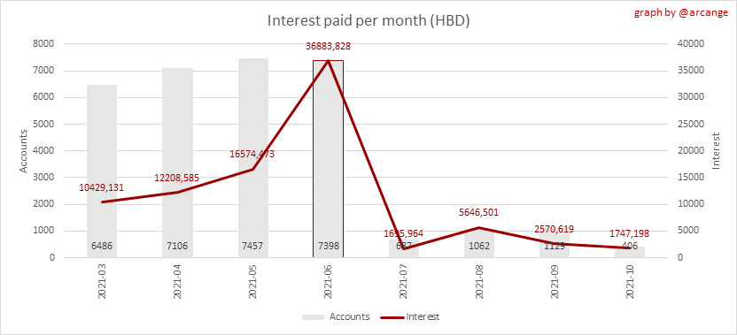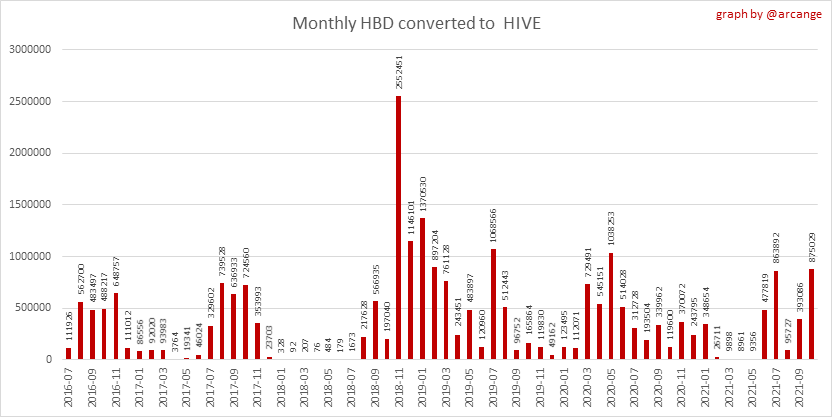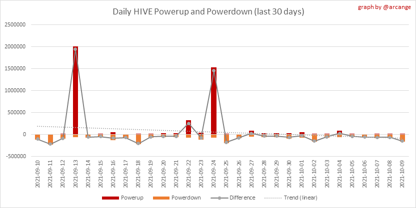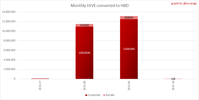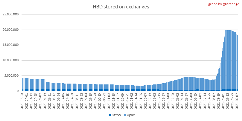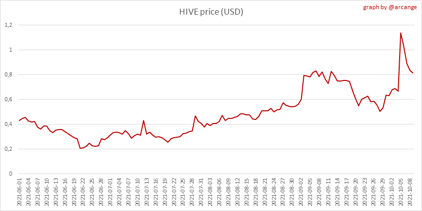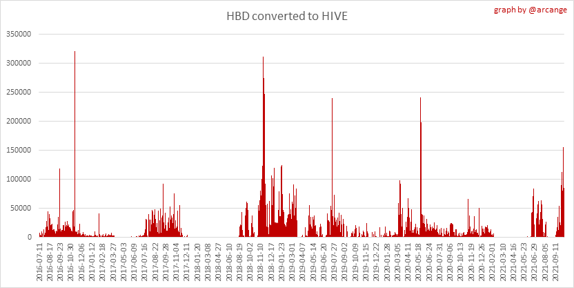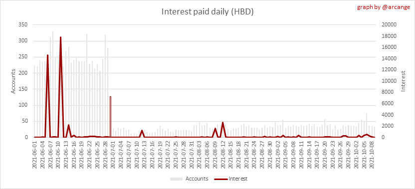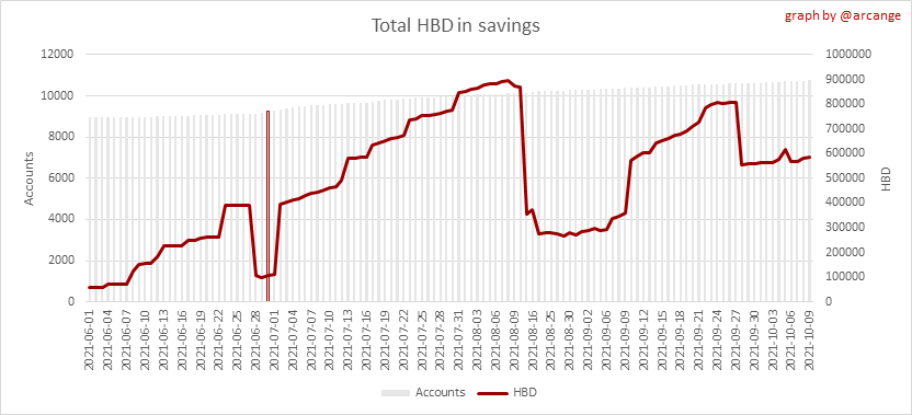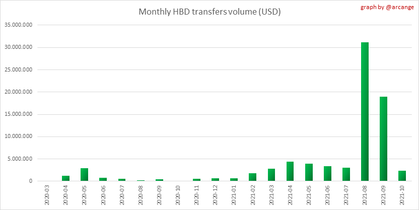 <center></center> ### Welcome to the daily financial report about the Hive blockchain. All the information presented in this report is based on the data collected from the blockchain until 2021-10-09 midnight UTC. This report aims to provide you with a clear view of what is happening on the Hive blockchain. <sub> Este post está traducido al español - [aquí](/@arcange-es/hive-finance-20211009-es)</sub> <sub> Dieser Beitrag ist ins Deutsche übersetzt - [hier](/@arcange-de/hive-finance-20211009-de)</sub> <sub> Une version en français de ce post est disponible - [ici](/@arcange-fr/hive-finance-20211009-fr)</sub> ### 1. Price ||| |-|-| ||| These graphs show the evolution of prices in USD for HIVE and HBD. ### 2. Supply  This graph shows the evolution of HIVE virtual Supply. The virtual supply is the sum of HIVE supply (liquid and staked HIVE) and HBD supply (converted into HIVE). The graph also displays the debt ratio (HBD supply / HIVE virtual supply). Keep in mind that since hardfork 24 funds in the treasury ([@hive.fund HBD balance](https://peakd.com/@hive.fund/wallet)) don't count towards the HBD debt ratio. ||| |-|-| ||| These graphs show the evolution of the HIVE Supply (both liquid and staked) and the HBD supply. ||| |-|-| || These charts show the evolution of the liquid HIVE and the staked HIVE (Hive Power).  This graph shows the overall Hive tokens distribution. ### 3. HBD Savings _<sub>**Note:** As of 2021-06-30 (HF25) interest is only paid for HBD which are stored in savings.</sub>_  |Account|Deposit|Account|Withdrawal| |-|-:|-|-:| |@leprechaun|1,440.209 HBD|@grot|40,340.063 HBD| |@eliel|1,052.170 HBD|@punt|30,295.948 HBD| |@knarf|551.728 HBD|@xmauron3|2,741.317 HBD| |@empoderat|501.000 HBD|@mango-juice|819.258 HBD| |@muenchen|443.275 HBD|@purepinay|546.060 HBD| |@sc-steemit|294.483 HBD|@jongcl|104.000 HBD| |@hamsterpoweriii|244.435 HBD|@m3ss|101.232 HBD| |@bambuka|140.000 HBD|@tejimundo|90.153 HBD| |@mproxima|110.000 HBD|@methus|89.261 HBD| |@m31|99.468 HBD|@kcwonders|50.000 HBD| This graph shows how much and how many accounts store HBD in savings. The table below shows the topmost HBD deposits and withdrawals of the day.  This chart shows the amount of interest paid each day for holding HBD and how many accounts received such interest.  This chart is the same as the previous one, but data are grouped by month. ### 4. Balances  This graph shows the number of HIVE, both liquid and in savings, held by all accounts.  This graph shows the number of HBD, both liquid and in savings, held by all accounts. ### 5. Conversions <sub>_**Note:** As a reminder, conversion requests are only finalized after 3 days. It is only then that it is known exactly how many HIVE were burned in return for the HBD received at the time of the conversion request._</sub>  This graph shows the number of HIVE collateralized due to requests to convert HIVE to HBD over the past few days. ||| |-|-| ||| These graphs show the number of HIVE effectively used by the conversion process (HIVE converted and 5% HIVE fee which is burned) each day and month when requests to convert HIVE to HBD have been finalized. ||| |-|-| ||| These graphs show the number of HBD burned, each day and each month, following requests to convert HBD to HIVE. ### 6. Powerup and Powerdown  |Date|Account|Amount| |-|-|-:| |2021-10-09 07:14:30|@ohanahealing|68,058.330 HIVE| |2021-10-09 09:47:36|@alexna|35,424.459 HIVE| |2021-10-09 12:33:57|@violetmed|12,001.348 HIVE| |2021-10-09 08:32:42|@maxuve|9,629.824 HIVE| |2021-10-09 02:55:18|@coinomite|7,877.397 HIVE| |2021-10-09 11:22:57|@fatimajunio|5,132.184 HIVE| |2021-10-09 02:10:06|@bckc-capital-llc|3,935.863 HIVE| |2021-10-09 02:10:09|@bckc-capital-llc|3,935.863 HIVE| |2021-10-09 11:23:21|@hiro-hive|3,417.122 HIVE| |2021-10-09 11:19:42|@binhtien|2,569.093 HIVE| This graph and table show the amount of powerdown initiated over the last 7 days, and the largest initiated on this day.  |Account|Powerup|Account|Powerdown| |-|-:|-|-:| |@coinomite|2,500.000 HIVE|@riverhead|74,807.309 HIVE| |@ele7|2,324.794 HIVE|@dhimmel|13,706.005 HIVE| |@steemitboard|1,177.778 HIVE|@buildawhale|5,817.028 HIVE| |@mmmmkkkk311|1,089.000 HIVE|@talentclub|4,003.152 HIVE| |@mituoshizhe|1,000.990 HIVE|@themonetaryfew|3,944.274 HIVE| |@fujifluz42|601.000 HIVE|@omonomo|3,820.905 HIVE| |@starjewel|499.939 HIVE|@bdvoter|3,556.199 HIVE| |@josehany|256.200 HIVE|@revisesociology|2,385.336 HIVE| |@cryptothesis|218.449 HIVE|@technological|2,191.523 HIVE| |@cy100|193.000 HIVE|@nonameslefttouse|2,005.845 HIVE| This graph shows the daily HIVE power-up, power-down, and the resulting variation over the last 30 days. The table shows the topmost power-ups and power-downs of the day.  This graph shows the monthly HIVE power-up, power-down and the resulting variation. **Values for the last 3 months** |Period|Powerup|Powerdown|Difference| |-|-:|-:|-:| |2021-10|233,795.000|810,393.000|<div class="phishy">-576,598.000</div>| |2021-09|4,552,777.000|2,892,984.000|1,659,793.000| |2021-08|3,212,814.000|3,144,598.000|68,216.000| ### 7. Transfers ||| |-|-| ||| These graphs show the volume (in USD) of HIVE and HBD transferred between accounts. ### 8. Exchanges ||| |-|-| ||| These graphs show the amount and distribution of HIVE and HBD stored on the exchanges where they are listed. ||| |-|-| ||| These graphs show the daily evolution of HIVE and HBD stored on the exchanges where they are listed. --- I hope you find those stats useful. If you would like to see additional stats, feel free to drop me a comment. Your feedback is than welcome. Thanks for reading. --- <center> ### Check out my apps and services <a href="/hive/@hive.engage/stay-connected-with-your-hive-audience-and-catch-attention"><img src="https://i.imgur.com/GiNJqlm.png"></a><a href="/@hivebuzz"><img src="https://i.imgur.com/B4UTun2.png"></a><a href="/@hivesql"><img src="https://i.imgur.com/EPN8RW6.png"></a><a href="/hive/@arcange/introducing-hive-account-recovery"><img src="https://i.imgur.com/6