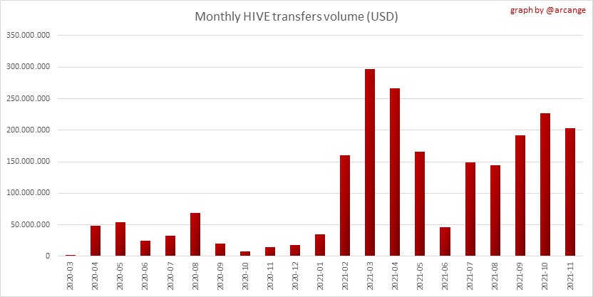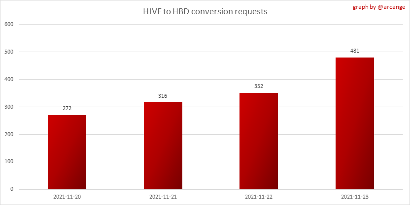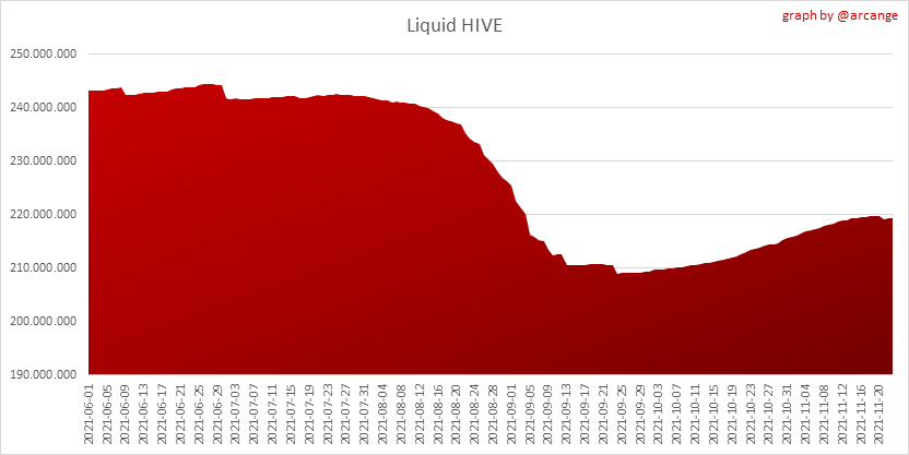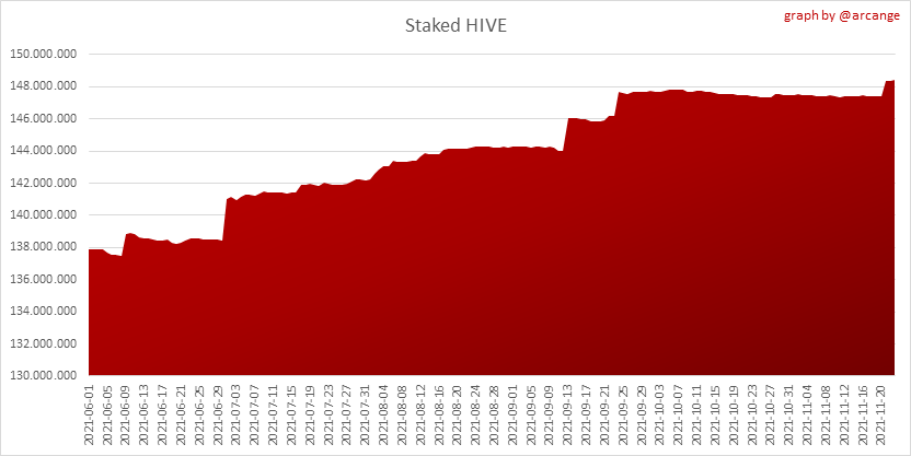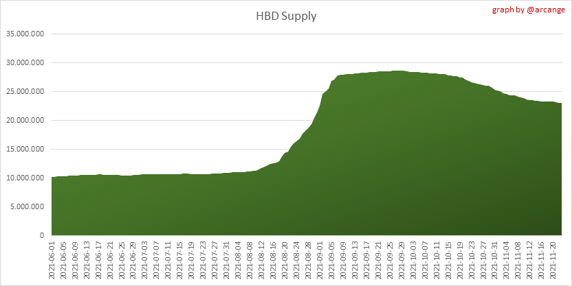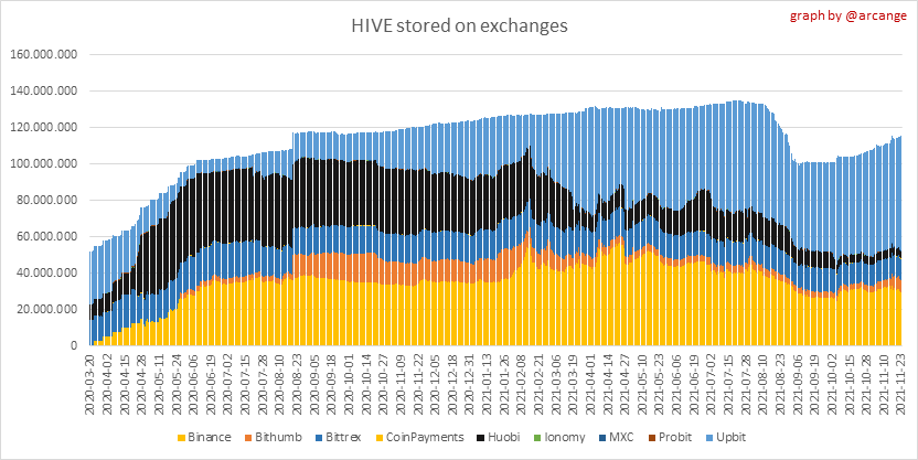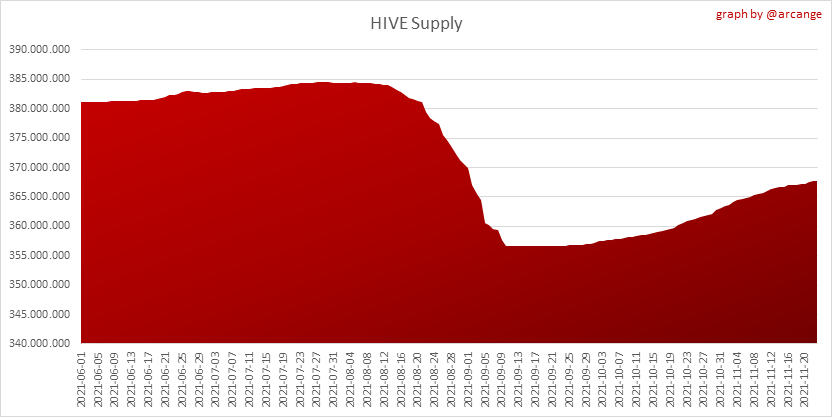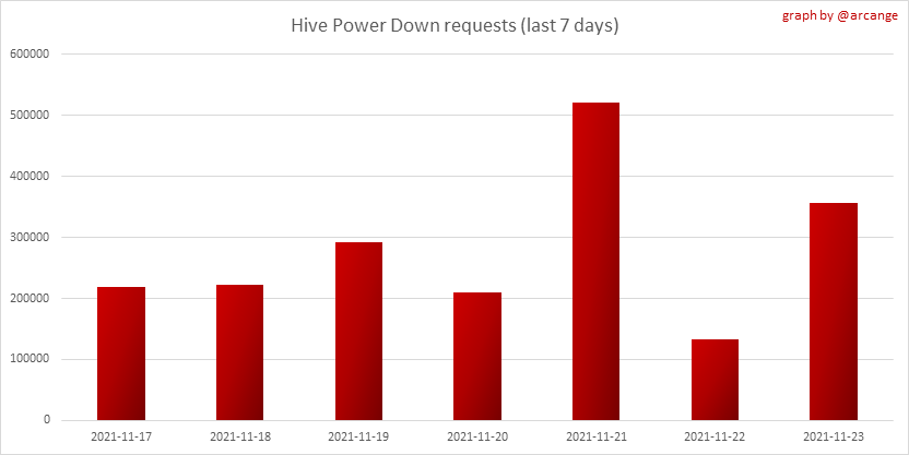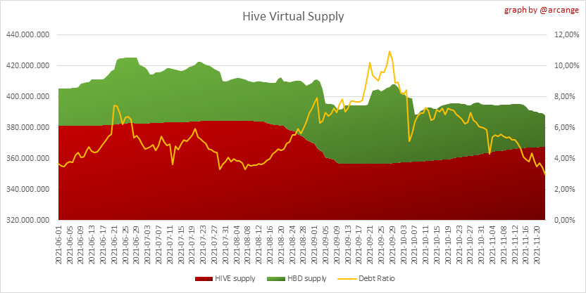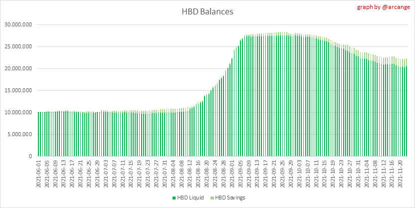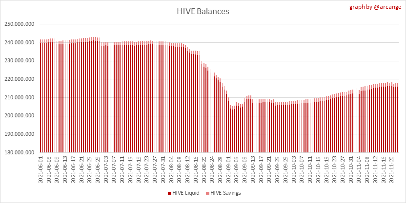 <center></center> ### Welcome to the daily financial report about the Hive blockchain. All the information presented in this report is based on the data collected from the blockchain until 2021-11-23 midnight UTC. This report aims to provide you with a clear view of what is happening on the Hive blockchain. <sub> Este post está traducido al español - [aquí](/@arcange-es/hive-finance-20211123-es)</sub> <sub> Dieser Beitrag ist ins Deutsche übersetzt - [hier](/@arcange-de/hive-finance-20211123-de)</sub> <sub> Une version en français de ce post est disponible - [ici](/@arcange-fr/hive-finance-20211123-fr)</sub> ### 1. Price ||| |-|-| ||| These graphs show the evolution of prices in USD for HIVE and HBD. ### 2. Supply  This graph shows the evolution of HIVE virtual Supply. The virtual supply is the sum of HIVE supply (liquid and staked HIVE) and HBD supply (converted into HIVE). The graph also displays the debt ratio (HBD supply / HIVE virtual supply). Keep in mind that since hardfork 24 funds in the treasury ([@hive.fund HBD balance](https://peakd.com/@hive.fund/wallet)) don't count towards the HBD debt ratio. ||| |-|-| ||| These graphs show the evolution of the HIVE Supply (both liquid and staked) and the HBD supply. ||| |-|-| || These charts show the evolution of the liquid HIVE and the staked HIVE (Hive Power).  This graph shows the overall Hive tokens distribution. ### 3. HBD Savings _<sub>**Note:** As of 2021-06-30 (HF25) interest is only paid for HBD which are stored in savings.</sub>_  |Account|Deposit|Account|Withdrawal| |-|-:|-|-:| |@brumest|1,726.650 HBD|@skenderbeu|1,400.000 HBD| |@skenderbeu|1,408.402 HBD|@empress-eremmy|150.000 HBD| |@ecoinstant|888.000 HBD|@jakim7|142.517 HBD| |@theycallmedan|877.381 HBD|@sazzad-sm|28.791 HBD| |@hiveauth|649.920 HBD|@picyoudyer|20.656 HBD| |@trumpman|455.000 HBD|@johannpiber|20.000 HBD| |@nftmart.wallet|414.958 HBD|@tropicarlos|13.191 HBD| |@buggedout|384.615 HBD|@azarmadr3|11.133 HBD| |@hivechain.app|329.385 HBD|@teukuboyhaqie|7.000 HBD| |@crimsonclad|300.000 HBD|@oadissin|3.584 HBD| This graph shows how much and how many accounts store HBD in savings. The table below shows the topmost HBD deposits and withdrawals of the day.  This chart shows the amount of interest paid each day for holding HBD and how many accounts received such interest.  This chart is the same as the previous one, but data are grouped by month. ### 4. Balances  This graph shows the number of HIVE, both liquid and in savings, held by all accounts.  This graph shows the number of HBD, both liquid and in savings, held by all accounts. ### 5. Conversions <sub>_**Note:** As a reminder, conversion requests are only finalized after 3 days. It is only then that it is known exactly how many HIVE were burned in return for the HBD received at the time of the conversion request._</sub>  This graph shows the number of HIVE collateralized due to requests to convert HIVE to HBD over the past few days. ||| |-|-| ||| These graphs show the number of HIVE effectively used by the conversion process (HIVE converted and 5% HIVE fee which is burned) each day and month when requests to convert HIVE to HBD have been finalized. ||| |-|-| ||| These graphs show the number of HBD burned, each day and each month, following requests to convert HBD to HIVE. ### 6. Powerup and Powerdown  |Date|Account|Amount| |-|-|-:| |2021-11-23 11:48:39|@cervantes|111,554.509 HIVE| |2021-11-23 08:07:15|@roelandp|66,669.737 HIVE| |2021-11-23 08:24:15|@pgarcgo|56,290.865 HIVE| |2021-11-23 06:53:09|@maks.molotskyy|20,393.192 HIVE| |2021-11-23 03:48:54|@tazi|10,894.113 HIVE| |2021-11-23 09:27:51|@dmilliz|7,469.607 HIVE| |2021-11-23 06:02:06|@melip|7,241.982 HIVE| |2021-11-23 06:02:00|@melip|7,241.982 HIVE| |2021-11-23 01:59:24|@txmek|5,567.265 HIVE| |2021-11-23 09:53:57|@shaka|5,422.376 HIVE| This graph and table show the amount of powerdown initiated over the last 7 days, and the largest initiated on this day.  |Account|Powerup|Account|Powerdown| |-|-:|-|-:| |@trasto|36,902.990 HIVE|@emrebeyler|4,025.338 HIVE| |@gigel2|10,321.000 HIVE|@adalger|2,709.444 HIVE| |@steemik|8,500.000 HIVE|@itchyfeetdonica|2,004.556 HIVE| |@otage|1,546.290 HIVE|@wilhb81|1,944.953 HIVE| |@peakmonsters|1,000.000 HIVE|@runicar|1,660.047 HIVE| |@olga.maslievich|1,000.000 HIVE|@ausbitbank|1,551.322 HIVE| |@aljif7|766.260 HIVE|@jelly13|1,373.396 HIVE| |@daniacea|700.000 HIVE|@edicted|1,000.559 HIVE| |@evilwhiskaz|553.212 HIVE|@cervantes|931.235 HIVE| |@hive.pizza|477.884 HIVE|@cervantes|931.235 HIVE| This graph shows the daily HIVE power-up, power-down, and the resulting variation over the last 30 days. The table shows the topmost power-ups and power-downs of the day.  This graph shows the monthly HIVE power-up, power-down and the resulting variation. **Values for the last 3 months** |Period|Powerup|Powerdown|Difference| |-|-:|-:|-:| |2021-11|1,704,818.000|2,116,513.000|<div class="phishy">-411,695.000</div>| |2021-10|951,900.000|3,051,364.000|<div class="phishy">-2,099,464.000</div>| |2021-09|4,552,777.000|2,892,984.000|1,659,793.000| ### 7. Transfers ||| |-|-| ||| These graphs show the volume (in USD) of HIVE and HBD transferred between accounts. ### 8. Exchanges ||| |-|-| ||| These graphs show the amount and distribution of HIVE and HBD stored on the exchanges where they are listed. ||| |-|-| ||| These graphs show the daily evolution of HIVE and HBD stored on the exchanges where they are listed. --- I hope you find those stats useful. If you would like to see additional stats, feel free to drop me a comment. Your feedback is than welcome. Thanks for reading. --- <center> ### Check out my apps and services <a href="/hive/@hive.engage/stay-connected-with-your-hive-audience-and-catch-attention"><img src="https://i.imgur.com/GiNJqlm.png"></a><a href="/@hivebuzz"><img src="https://i.imgur.com/B4UTun2.png"></a><a href="/@hivesql"><img src="https://i.imgur.com/EPN8RW6.png"></a><a href="/hive/@arcange/introducing-hive-account-recovery"><img src="http