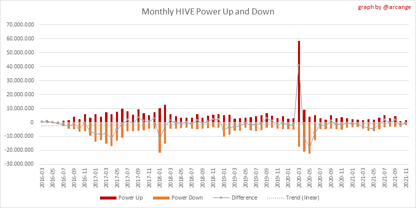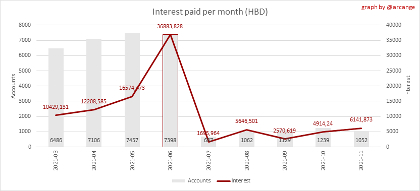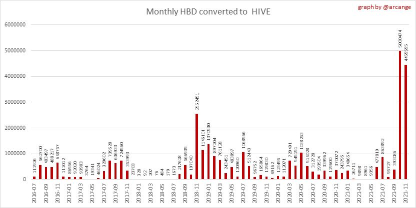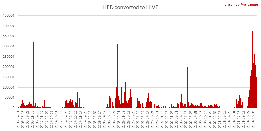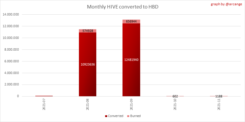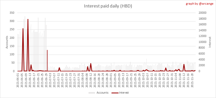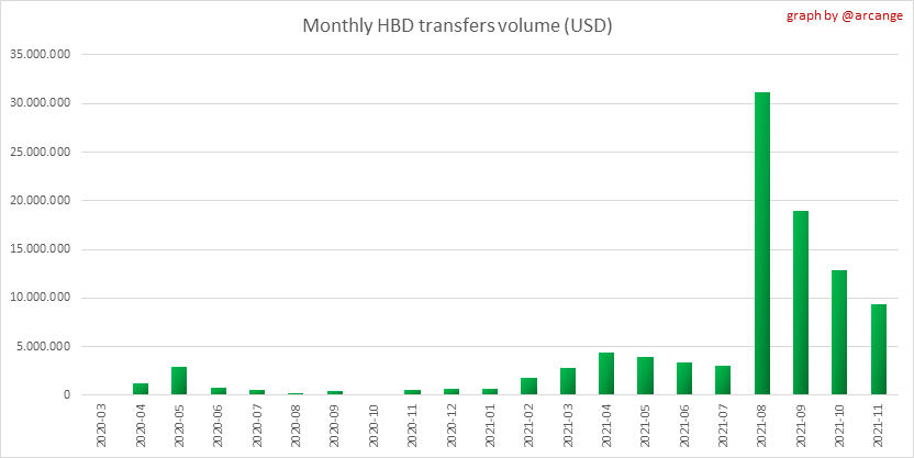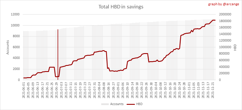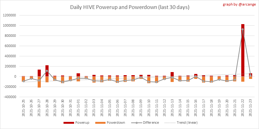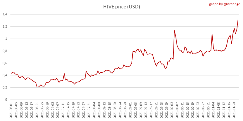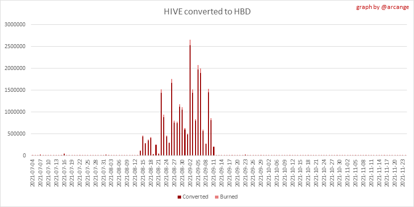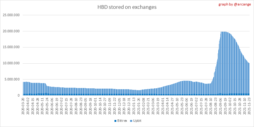 <center></center> ### Welcome to the daily financial report about the Hive blockchain. All the information presented in this report is based on the data collected from the blockchain until 2021-11-23 midnight UTC. This report aims to provide you with a clear view of what is happening on the Hive blockchain. <sub> Este post está traducido al español - [aquí](/@arcange-es/hive-finance-20211123-es)</sub> <sub> Dieser Beitrag ist ins Deutsche übersetzt - [hier](/@arcange-de/hive-finance-20211123-de)</sub> <sub> Une version en français de ce post est disponible - [ici](/@arcange-fr/hive-finance-20211123-fr)</sub> ### 1. Price ||| |-|-| ||| These graphs show the evolution of prices in USD for HIVE and HBD. ### 2. Supply  This graph shows the evolution of HIVE virtual Supply. The virtual supply is the sum of HIVE supply (liquid and staked HIVE) and HBD supply (converted into HIVE). The graph also displays the debt ratio (HBD supply / HIVE virtual supply). Keep in mind that since hardfork 24 funds in the treasury ([@hive.fund HBD balance](https://peakd.com/@hive.fund/wallet)) don't count towards the HBD debt ratio. ||| |-|-| ||| These graphs show the evolution of the HIVE Supply (both liquid and staked) and the HBD supply. ||| |-|-| || These charts show the evolution of the liquid HIVE and the staked HIVE (Hive Power).  This graph shows the overall Hive tokens distribution. ### 3. HBD Savings _<sub>**Note:** As of 2021-06-30 (HF25) interest is only paid for HBD which are stored in savings.</sub>_  |Account|Deposit|Account|Withdrawal| |-|-:|-|-:| |@brumest|1,726.650 HBD|@skenderbeu|1,400.000 HBD| |@skenderbeu|1,408.402 HBD|@empress-eremmy|150.000 HBD| |@ecoinstant|888.000 HBD|@jakim7|142.517 HBD| |@theycallmedan|877.381 HBD|@sazzad-sm|28.791 HBD| |@hiveauth|649.920 HBD|@picyoudyer|20.656 HBD| |@trumpman|455.000 HBD|@johannpiber|20.000 HBD| |@nftmart.wallet|414.958 HBD|@tropicarlos|13.191 HBD| |@buggedout|384.615 HBD|@azarmadr3|11.133 HBD| |@hivechain.app|329.385 HBD|@teukuboyhaqie|7.000 HBD| |@crimsonclad|300.000 HBD|@oadissin|3.584 HBD| This graph shows how much and how many accounts store HBD in savings. The table below shows the topmost HBD deposits and withdrawals of the day.  This chart shows the amount of interest paid each day for holding HBD and how many accounts received such interest.  This chart is the same as the previous one, but data are grouped by month. ### 4. Balances  This graph shows the number of HIVE, both liquid and in savings, held by all accounts.  This graph shows the number of HBD, both liquid and in savings, held by all accounts. ### 5. Conversions <sub>_**Note:** As a reminder, conversion requests are only finalized after 3 days. It is only then that it is known exactly how many HIVE were burned in return for the HBD received at the time of the conversion request._</sub>  This graph shows the number of HIVE collateralized due to requests to convert HIVE to HBD over the past few days. ||| |-|-| ||| These graphs show the number of HIVE effectively used by the conversion process (HIVE converted and 5% HIVE fee which is burned) each day and month when requests to convert HIVE to HBD have been finalized. ||| |-|-| ||| These graphs show the number of HBD burned, each day and each month, following requests to convert HBD to HIVE. ### 6. Powerup and Powerdown  |Date|Account|Amount| |-|-|-:| |2021-11-23 11:48:39|@cervantes|111,554.509 HIVE| |2021-11-23 08:07:15|@roelandp|66,669.737 HIVE| |2021-11-23 08:24:15|@pgarcgo|56,290.865 HIVE| |2021-11-23 06:53:09|@maks.molotskyy|20,393.192 HIVE| |2021-11-23 03:48:54|@tazi|10,894.113 HIVE| |2021-11-23 09:27:51|@dmilliz|7,469.607 HIVE| |2021-11-23 06:02:06|@melip|7,241.982 HIVE| |2021-11-23 06:02:00|@melip|7,241.982 HIVE| |2021-11-23 01:59:24|@txmek|5,567.265 HIVE| |2021-11-23 09:53:57|@shaka|5,422.376 HIVE| This graph and table show the amount of powerdown initiated over the last 7 days, and the largest initiated on this day.  |Account|Powerup|Account|Powerdown| |-|-:|-|-:| |@trasto|36,902.990 HIVE|@emrebeyler|4,025.338 HIVE| |@gigel2|10,321.000 HIVE|@adalger|2,709.444 HIVE| |@steemik|8,500.000 HIVE|@itchyfeetdonica|2,004.556 HIVE| |@otage|1,546.290 HIVE|@wilhb81|1,944.953 HIVE| |@peakmonsters|1,000.000 HIVE|@runicar|1,660.047 HIVE| |@olga.maslievich|1,000.000 HIVE|@ausbitbank|1,551.322 HIVE| |@aljif7|766.260 HIVE|@jelly13|1,373.396 HIVE| |@daniacea|700.000 HIVE|@edicted|1,000.559 HIVE| |@evilwhiskaz|553.212 HIVE|@cervantes|931.235 HIVE| |@hive.pizza|477.884 HIVE|@cervantes|931.235 HIVE| This graph shows the daily HIVE power-up, power-down, and the resulting variation over the last 30 days. The table shows the topmost power-ups and power-downs of the day.  This graph shows the monthly HIVE power-up, power-down and the resulting variation. **Values for the last 3 months** |Period|Powerup|Powerdown|Difference| |-|-:|-:|-:| |2021-11|1,704,818.000|2,116,513.000|<div class="phishy">-411,695.000</div>| |2021-10|951,900.000|3,051,364.000|<div class="phishy">-2,099,464.000</div>| |2021-09|4,552,777.000|2,892,984.000|1,659,793.000| ### 7. Transfers ||| |-|-| ||| These graphs show the volume (in USD) of HIVE and HBD transferred between accounts. ### 8. Exchanges ||| |-|-| ||| These graphs show the amount and distribution of HIVE and HBD stored on the exchanges where they are listed. ||| |-|-| ||| These graphs show the daily evolution of HIVE and HBD stored on the exchanges where they are listed. --- I hope you find those stats useful. If you would like to see additional stats, feel free to drop me a comment. Your feedback is than welcome. Thanks for reading. --- <center> ### Check out my apps and services <a href="/hive/@hive.engage/stay-connected-with-your-hive-audience-and-catch-attention"><img src="https://i.imgur.com/GiNJqlm.png"></a><a href="/@hivebuzz"><img src="https://i.imgur.com/B4UTun2.png"></a><a href="/@hivesql"><img src="https://i.imgur.com/EPN8RW6.png"></a><a href="/hive/@arcange/introducing-hive-account-recovery"><img src="http
