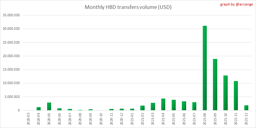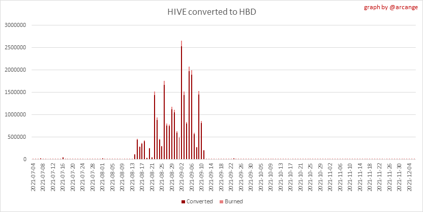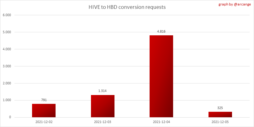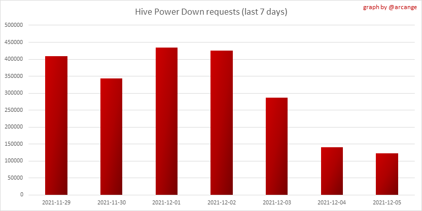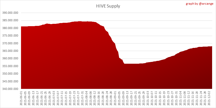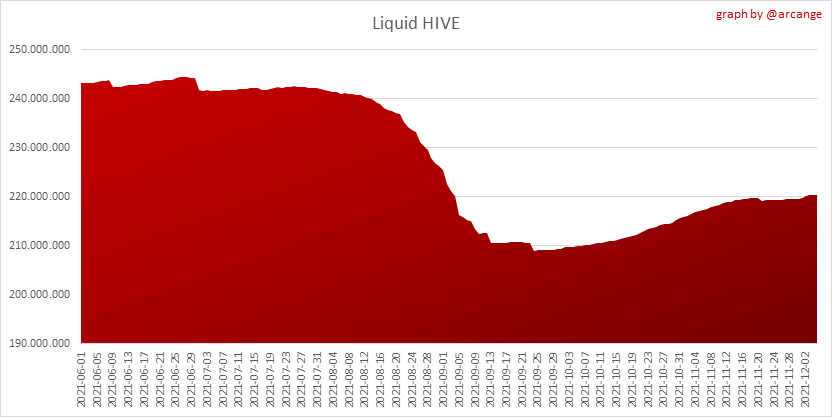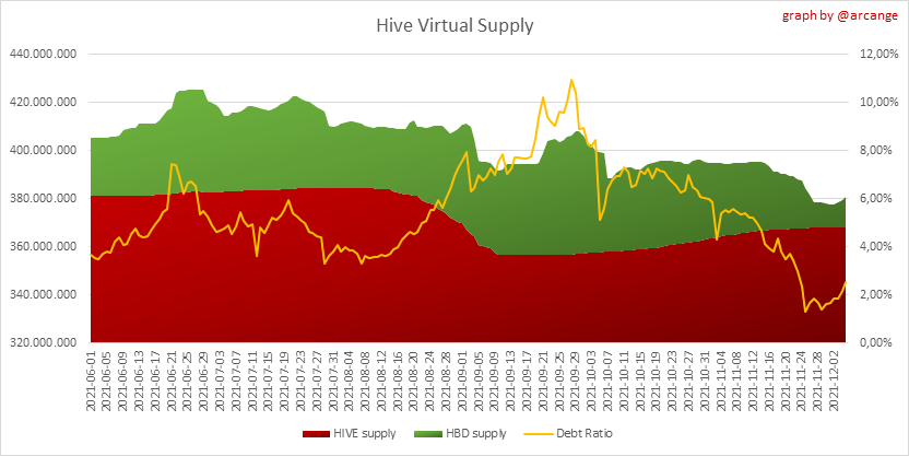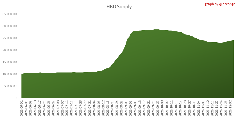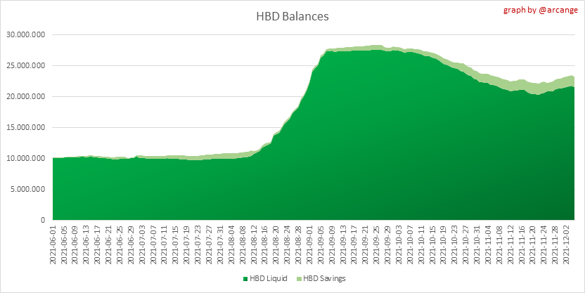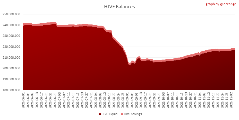 <center></center> ### Welcome to the daily financial report about the Hive blockchain. All the information presented in this report is based on the data collected from the blockchain until 2021-12-05 midnight UTC. This report aims to provide you with a clear view of what is happening on the Hive blockchain. <sub> Este post está traducido al español - [aquí](/@arcange-es/hive-finance-20211205-es)</sub> <sub> Dieser Beitrag ist ins Deutsche übersetzt - [hier](/@arcange-de/hive-finance-20211205-de)</sub> <sub> Une version en français de ce post est disponible - [ici](/@arcange-fr/hive-finance-20211205-fr)</sub> ### 1. Price ||| |-|-| ||| These graphs show the evolution of prices in USD for HIVE and HBD. ### 2. Supply  This graph shows the evolution of HIVE virtual Supply. The virtual supply is the sum of HIVE supply (liquid and staked HIVE) and HBD supply (converted into HIVE). The graph also displays the debt ratio (HBD supply / HIVE virtual supply). Keep in mind that since hardfork 24 funds in the treasury ([@hive.fund HBD balance](https://peakd.com/@hive.fund/wallet)) don't count towards the HBD debt ratio. ||| |-|-| ||| These graphs show the evolution of the HIVE Supply (both liquid and staked) and the HBD supply. ||| |-|-| || These charts show the evolution of the liquid HIVE and the staked HIVE (Hive Power).  This graph shows the overall Hive tokens distribution. ### 3. HBD Savings _<sub>**Note:** As of 2021-06-30 (HF25) interest is only paid for HBD which are stored in savings.</sub>_  |Account|Deposit|Account|Withdrawal| |-|-:|-|-:| |@eonwarped|4,932.586 HBD|@adya|1,000.000 HBD| |@muenchen|1,000.000 HBD|@igormuba|63.084 HBD| |@achim03|749.244 HBD|@mutedgeek|61.000 HBD| |@singhcapital|739.921 HBD|@alexicp|57.669 HBD| |@hivechain.app|735.625 HBD|@rachaeldwatson|40.000 HBD| |@anthony2019|500.001 HBD|@thelunaciandaily|37.285 HBD| |@zo3d|212.831 HBD|@freidimar18|31.163 HBD| |@aleister|211.369 HBD|@michelmake|22.963 HBD| |@uwelang|200.000 HBD|@blockchainyouth|10.000 HBD| |@deeanndmathews|154.007 HBD|@quinnertronics|7.000 HBD| This graph shows how much and how many accounts store HBD in savings. The table below shows the topmost HBD deposits and withdrawals of the day.  This chart shows the amount of interest paid each day for holding HBD and how many accounts received such interest.  This chart is the same as the previous one, but data are grouped by month. ### 4. Balances  This graph shows the number of HIVE, both liquid and in savings, held by all accounts.  This graph shows the number of HBD, both liquid and in savings, held by all accounts. ### 5. Conversions <sub>_**Note:** As a reminder, conversion requests are only finalized after 3 days. It is only then that it is known exactly how many HIVE were burned in return for the HBD received at the time of the conversion request._</sub>  This graph shows the number of HIVE collateralized due to requests to convert HIVE to HBD over the past few days. ||| |-|-| ||| These graphs show the number of HIVE effectively used by the conversion process (HIVE converted and 5% HIVE fee which is burned) each day and month when requests to convert HIVE to HBD have been finalized. ||| |-|-| ||| These graphs show the number of HBD burned, each day and each month, following requests to convert HBD to HIVE. ### 6. Powerup and Powerdown  |Date|Account|Amount| |-|-|-:| |2021-12-05 05:37:09|@khaleelkazi|15,967.169 HIVE| |2021-12-05 09:49:57|@okotsteemit|12,670.719 HIVE| |2021-12-05 09:26:39|@spt-skillup|11,700.937 HIVE| |2021-12-05 08:19:51|@lordnigel|10,040.510 HIVE| |2021-12-05 02:48:12|@sm-silva|9,712.609 HIVE| |2021-12-05 02:48:30|@sm-silva|9,500.595 HIVE| |2021-12-05 08:59:48|@urun|6,145.262 HIVE| |2021-12-05 01:36:09|@airbnb-kr|5,347.251 HIVE| |2021-12-05 12:30:33|@project.hope|2,637.878 HIVE| |2021-12-05 08:25:03|@ahmetay|2,600.217 HIVE| This graph and table show the amount of powerdown initiated over the last 7 days, and the largest initiated on this day.  |Account|Powerup|Account|Powerdown| |-|-:|-|-:| |@yeouido.park|4,192.379 HIVE|@appreciator|21,304.981 HIVE| |@schlees|3,000.000 HIVE|@dustindivitto|12,079.816 HIVE| |@onealfa|1,500.000 HIVE|@sepracore|9,198.565 HIVE| |@cryptothesis|326.172 HIVE|@wagginston|9,154.050 HIVE| |@hyun-soo|301.688 HIVE|@galenkp|7,926.641 HIVE| |@protosphere|255.967 HIVE|@schlees|6,006.555 HIVE| |@mcoms1|220.769 HIVE|@oflyhigh|4,002.162 HIVE| |@tookta|200.423 HIVE|@someguy123|3,629.643 HIVE| |@jablessjobs|197.628 HIVE|@smallearth|3,388.306 HIVE| |@cryptoplanetbg|158.018 HIVE|@bdvoter|3,223.528 HIVE| This graph shows the daily HIVE power-up, power-down, and the resulting variation over the last 30 days. The table shows the topmost power-ups and power-downs of the day.  This graph shows the monthly HIVE power-up, power-down and the resulting variation. **Values for the last 3 months** |Period|Powerup|Powerdown|Difference| |-|-:|-:|-:| |2021-12|125,623.000|1,067,755.000|<div class="phishy">-942,132.000</div>| |2021-11|1,857,545.000|2,848,894.000|<div class="phishy">-991,349.000</div>| |2021-10|951,900.000|3,051,364.000|<div class="phishy">-2,099,464.000</div>| ### 7. Transfers ||| |-|-| ||| These graphs show the volume (in USD) of HIVE and HBD transferred between accounts. ### 8. Exchanges ||| |-|-| ||| These graphs show the amount and distribution of HIVE and HBD stored on the exchanges where they are listed. ||| |-|-| ||| These graphs show the daily evolution of HIVE and HBD stored on the exchanges where they are listed. --- I hope you find those stats useful. If you would like to see additional stats, feel free to drop me a comment. Your feedback is than welcome. Thanks for reading. --- <center> ### Check out my apps and services <a href="/hive/@hive.engage/stay-connected-with-your-hive-audience-and-catch-attention"><img src="https://i.imgur.com/GiNJqlm.png"></a><a href="/@hivebuzz"><img src="https://i.imgur.com/B4UTun2.png"></a><a href="/@hivesql"><img src="https://i.imgur.com/EPN8RW6.png"></a><a href="/hive/@arcange/i