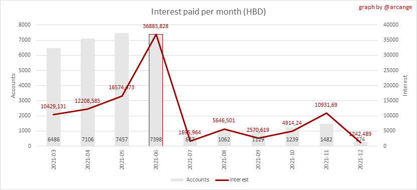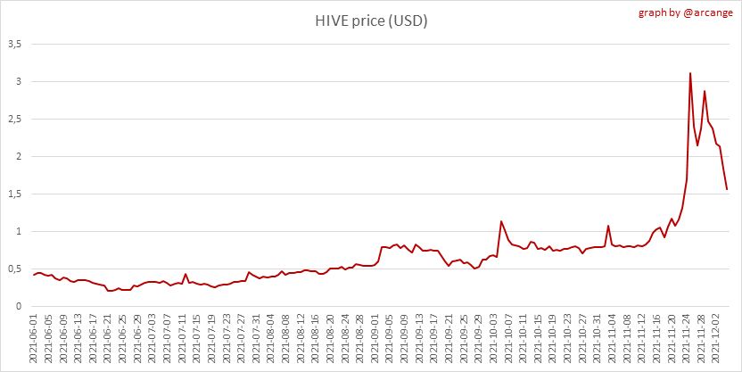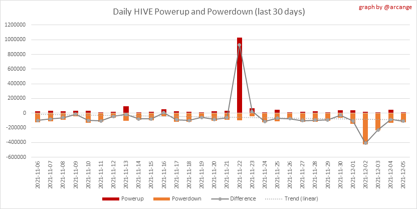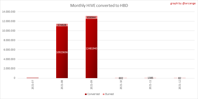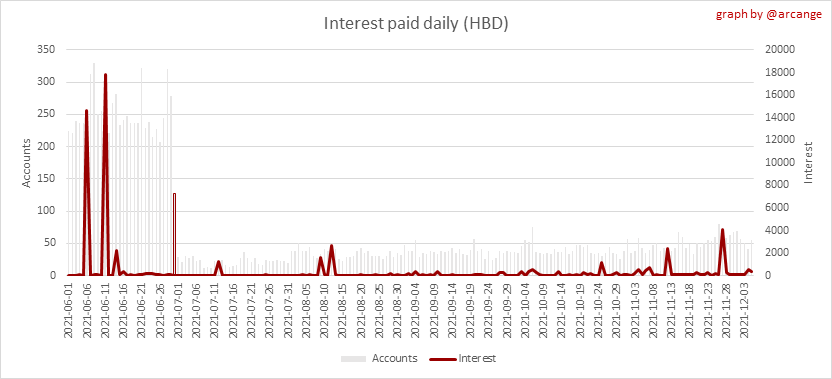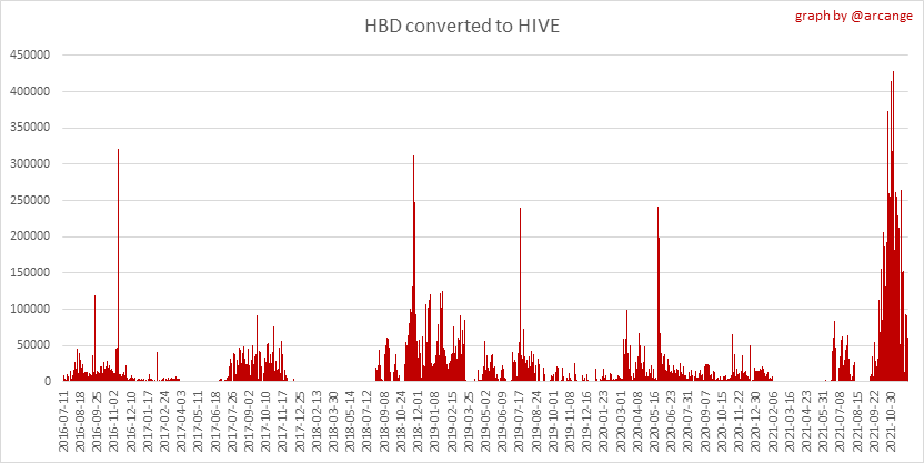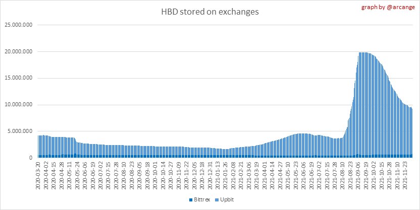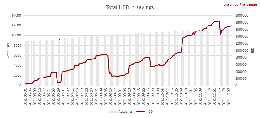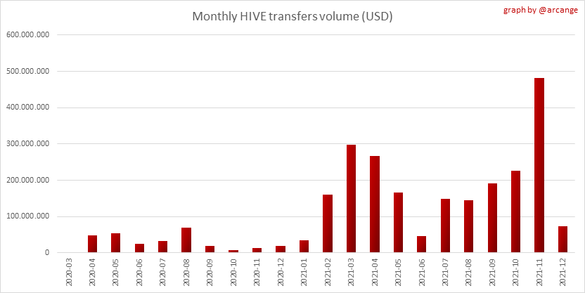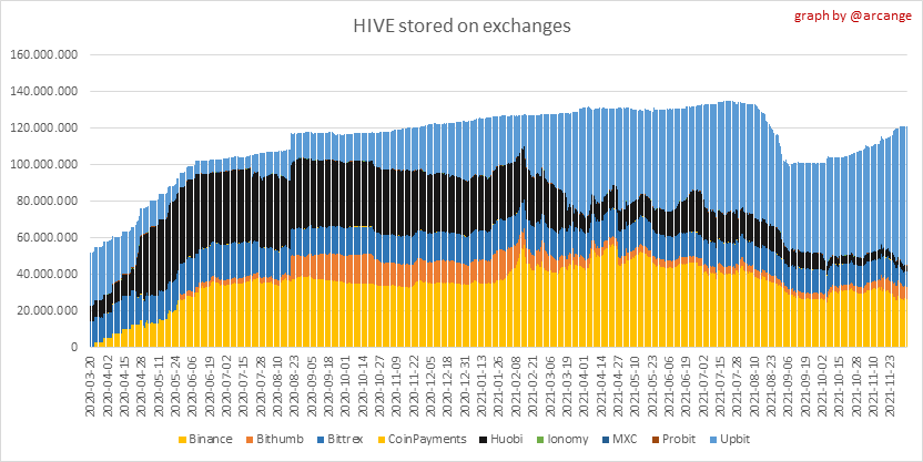 <center></center> ### Welcome to the daily financial report about the Hive blockchain. All the information presented in this report is based on the data collected from the blockchain until 2021-12-05 midnight UTC. This report aims to provide you with a clear view of what is happening on the Hive blockchain. <sub> Este post está traducido al español - [aquí](/@arcange-es/hive-finance-20211205-es)</sub> <sub> Dieser Beitrag ist ins Deutsche übersetzt - [hier](/@arcange-de/hive-finance-20211205-de)</sub> <sub> Une version en français de ce post est disponible - [ici](/@arcange-fr/hive-finance-20211205-fr)</sub> ### 1. Price ||| |-|-| ||| These graphs show the evolution of prices in USD for HIVE and HBD. ### 2. Supply  This graph shows the evolution of HIVE virtual Supply. The virtual supply is the sum of HIVE supply (liquid and staked HIVE) and HBD supply (converted into HIVE). The graph also displays the debt ratio (HBD supply / HIVE virtual supply). Keep in mind that since hardfork 24 funds in the treasury ([@hive.fund HBD balance](https://peakd.com/@hive.fund/wallet)) don't count towards the HBD debt ratio. ||| |-|-| ||| These graphs show the evolution of the HIVE Supply (both liquid and staked) and the HBD supply. ||| |-|-| || These charts show the evolution of the liquid HIVE and the staked HIVE (Hive Power).  This graph shows the overall Hive tokens distribution. ### 3. HBD Savings _<sub>**Note:** As of 2021-06-30 (HF25) interest is only paid for HBD which are stored in savings.</sub>_  |Account|Deposit|Account|Withdrawal| |-|-:|-|-:| |@eonwarped|4,932.586 HBD|@adya|1,000.000 HBD| |@muenchen|1,000.000 HBD|@igormuba|63.084 HBD| |@achim03|749.244 HBD|@mutedgeek|61.000 HBD| |@singhcapital|739.921 HBD|@alexicp|57.669 HBD| |@hivechain.app|735.625 HBD|@rachaeldwatson|40.000 HBD| |@anthony2019|500.001 HBD|@thelunaciandaily|37.285 HBD| |@zo3d|212.831 HBD|@freidimar18|31.163 HBD| |@aleister|211.369 HBD|@michelmake|22.963 HBD| |@uwelang|200.000 HBD|@blockchainyouth|10.000 HBD| |@deeanndmathews|154.007 HBD|@quinnertronics|7.000 HBD| This graph shows how much and how many accounts store HBD in savings. The table below shows the topmost HBD deposits and withdrawals of the day.  This chart shows the amount of interest paid each day for holding HBD and how many accounts received such interest.  This chart is the same as the previous one, but data are grouped by month. ### 4. Balances  This graph shows the number of HIVE, both liquid and in savings, held by all accounts.  This graph shows the number of HBD, both liquid and in savings, held by all accounts. ### 5. Conversions <sub>_**Note:** As a reminder, conversion requests are only finalized after 3 days. It is only then that it is known exactly how many HIVE were burned in return for the HBD received at the time of the conversion request._</sub>  This graph shows the number of HIVE collateralized due to requests to convert HIVE to HBD over the past few days. ||| |-|-| ||| These graphs show the number of HIVE effectively used by the conversion process (HIVE converted and 5% HIVE fee which is burned) each day and month when requests to convert HIVE to HBD have been finalized. ||| |-|-| ||| These graphs show the number of HBD burned, each day and each month, following requests to convert HBD to HIVE. ### 6. Powerup and Powerdown  |Date|Account|Amount| |-|-|-:| |2021-12-05 05:37:09|@khaleelkazi|15,967.169 HIVE| |2021-12-05 09:49:57|@okotsteemit|12,670.719 HIVE| |2021-12-05 09:26:39|@spt-skillup|11,700.937 HIVE| |2021-12-05 08:19:51|@lordnigel|10,040.510 HIVE| |2021-12-05 02:48:12|@sm-silva|9,712.609 HIVE| |2021-12-05 02:48:30|@sm-silva|9,500.595 HIVE| |2021-12-05 08:59:48|@urun|6,145.262 HIVE| |2021-12-05 01:36:09|@airbnb-kr|5,347.251 HIVE| |2021-12-05 12:30:33|@project.hope|2,637.878 HIVE| |2021-12-05 08:25:03|@ahmetay|2,600.217 HIVE| This graph and table show the amount of powerdown initiated over the last 7 days, and the largest initiated on this day.  |Account|Powerup|Account|Powerdown| |-|-:|-|-:| |@yeouido.park|4,192.379 HIVE|@appreciator|21,304.981 HIVE| |@schlees|3,000.000 HIVE|@dustindivitto|12,079.816 HIVE| |@onealfa|1,500.000 HIVE|@sepracore|9,198.565 HIVE| |@cryptothesis|326.172 HIVE|@wagginston|9,154.050 HIVE| |@hyun-soo|301.688 HIVE|@galenkp|7,926.641 HIVE| |@protosphere|255.967 HIVE|@schlees|6,006.555 HIVE| |@mcoms1|220.769 HIVE|@oflyhigh|4,002.162 HIVE| |@tookta|200.423 HIVE|@someguy123|3,629.643 HIVE| |@jablessjobs|197.628 HIVE|@smallearth|3,388.306 HIVE| |@cryptoplanetbg|158.018 HIVE|@bdvoter|3,223.528 HIVE| This graph shows the daily HIVE power-up, power-down, and the resulting variation over the last 30 days. The table shows the topmost power-ups and power-downs of the day.  This graph shows the monthly HIVE power-up, power-down and the resulting variation. **Values for the last 3 months** |Period|Powerup|Powerdown|Difference| |-|-:|-:|-:| |2021-12|125,623.000|1,067,755.000|<div class="phishy">-942,132.000</div>| |2021-11|1,857,545.000|2,848,894.000|<div class="phishy">-991,349.000</div>| |2021-10|951,900.000|3,051,364.000|<div class="phishy">-2,099,464.000</div>| ### 7. Transfers ||| |-|-| ||| These graphs show the volume (in USD) of HIVE and HBD transferred between accounts. ### 8. Exchanges ||| |-|-| ||| These graphs show the amount and distribution of HIVE and HBD stored on the exchanges where they are listed. ||| |-|-| ||| These graphs show the daily evolution of HIVE and HBD stored on the exchanges where they are listed. --- I hope you find those stats useful. If you would like to see additional stats, feel free to drop me a comment. Your feedback is than welcome. Thanks for reading. --- <center> ### Check out my apps and services <a href="/hive/@hive.engage/stay-connected-with-your-hive-audience-and-catch-attention"><img src="https://i.imgur.com/GiNJqlm.png"></a><a href="/@hivebuzz"><img src="https://i.imgur.com/B4UTun2.png"></a><a href="/@hivesql"><img src="https://i.imgur.com/EPN8RW6.png"></a><a href="/hive/@arcange/i