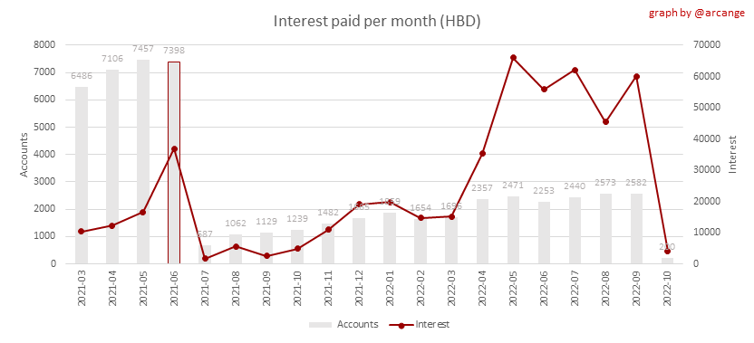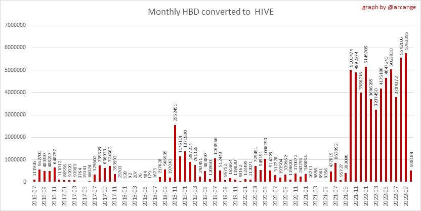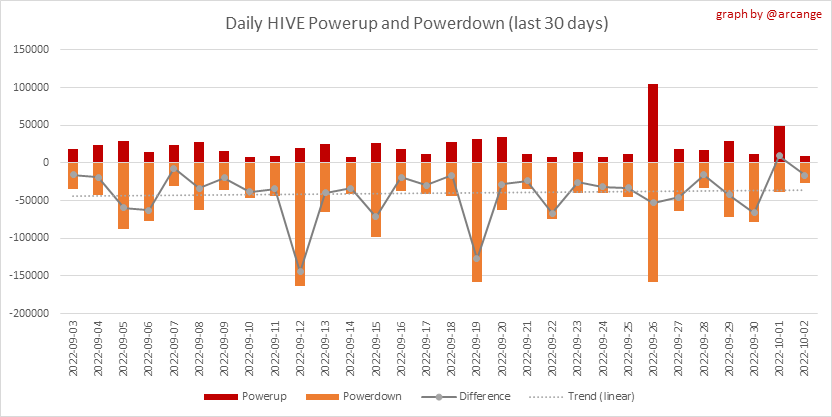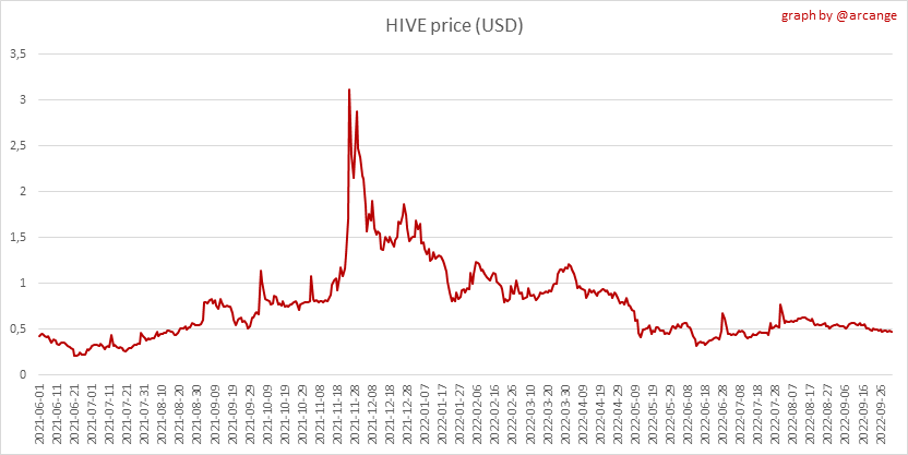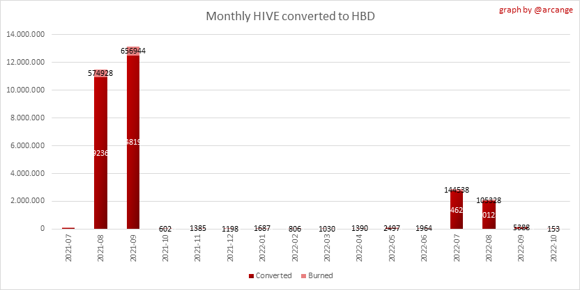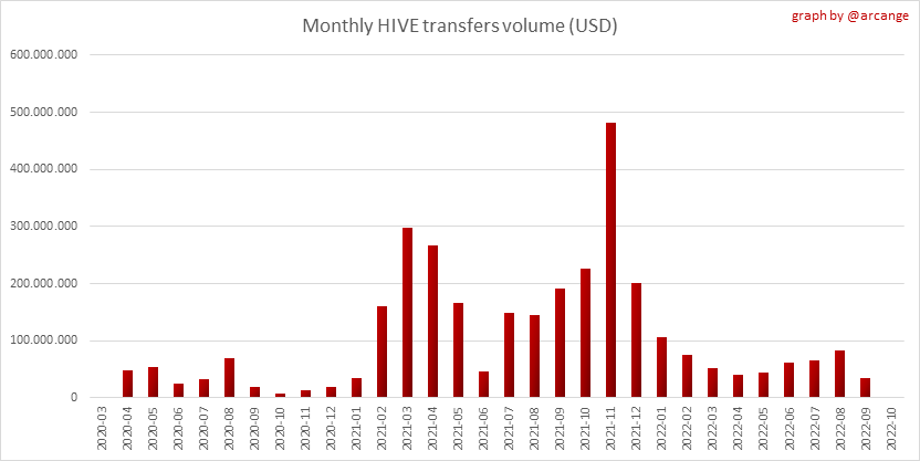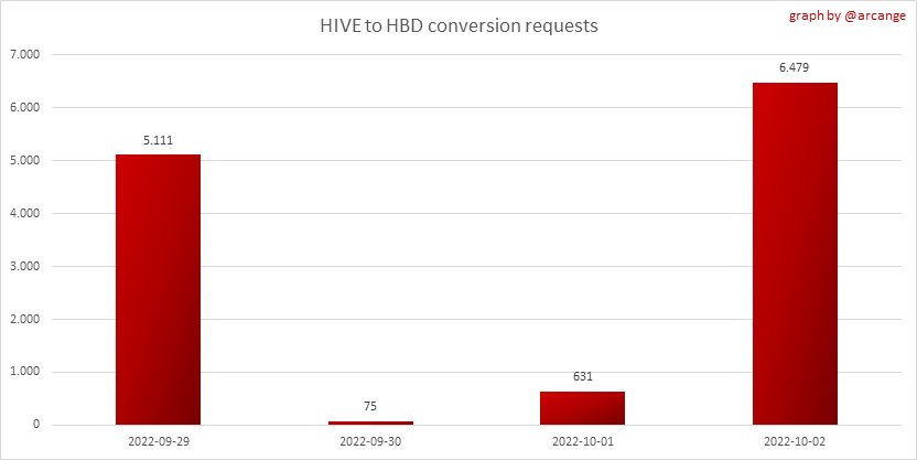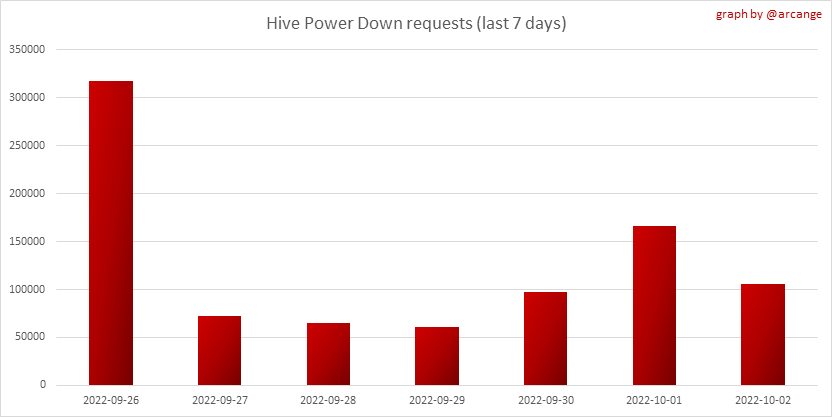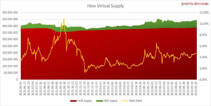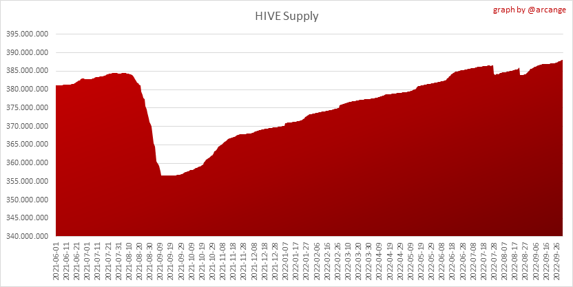 <center></center> ### Welcome to the daily financial report about the Hive blockchain. All the information presented in this report is based on the data collected from the blockchain until 2022-10-02 midnight UTC. This report aims to provide you with a clear view of what is happening on the Hive blockchain. <sub> Este post está traducido al español - [aquí](/@arcange-es/hive-finance-20221002-es)</sub> <sub> Dieser Beitrag ist ins Deutsche übersetzt - [hier](/@arcange-de/hive-finance-20221002-de)</sub> <sub> Une version en français de ce post est disponible - [ici](/@arcange-fr/hive-finance-20221002-fr)</sub> ### 1. Price ||| |-|-| ||| These graphs show the evolution of prices in USD for HIVE and HBD. ### 2. Supply  This graph shows the evolution of HIVE virtual Supply. The virtual supply is the sum of HIVE supply (liquid and staked HIVE) and HBD supply (converted into HIVE). The graph also displays the debt ratio (HBD supply / HIVE virtual supply). Keep in mind that since hardfork 24 funds in the treasury ([@hive.fund HBD balance](https://peakd.com/@hive.fund/wallet)) don't count towards the HBD debt ratio. ||| |-|-| ||| These graphs show the evolution of the HIVE Supply (both liquid and staked) and the HBD supply. ||| |-|-| || These charts show the evolution of the liquid HIVE and the staked HIVE (Hive Power).  This graph shows the overall Hive tokens distribution. ### 3. HBD Savings  |Account|Deposit|Account|Withdrawal| |-|-:|-|-:| |@dresden.theone|2,049.211 HBD|@j1984|248.965 HBD| |@vaultec|1,000.000 HBD|@gbuchynska|150.000 HBD| |@organduo|845.000 HBD|@rks.wuhdrelis|91.753 HBD| |@klye|501.876 HBD|@rozku|50.000 HBD| |@laputis|481.998 HBD|@bhoa|45.681 HBD| |@deathwing|402.495 HBD|@hrichakar|44.339 HBD| |@keychain|390.000 HBD|@darwinjj|23.861 HBD| |@hiveauth|324.984 HBD|@geneeverett|23.000 HBD| |@taruk|305.000 HBD|@wildthougts|15.181 HBD| |@thcmind|239.562 HBD|@chorock|10.892 HBD| This graph shows how much and how many accounts store HBD in savings. The table below shows the topmost HBD deposits and withdrawals of the day.  _<sub>**Note:** As of 2021-06-30 (HF25) interest is only paid for HBD which are stored in savings.</sub>_ This chart shows the amount of interest paid each month for holding HBD and how many accounts received such interest. ### 4. Balances  This graph shows the number of HIVE, both liquid and in savings, held by all accounts.  This graph shows the number of HBD, both liquid and in savings, held by all accounts. ### 5. Conversions <sub>_**Note:** As a reminder, conversion requests are only finalized after 3 days. It is only then that it is known exactly how many HIVE were burned in return for the HBD received at the time of the conversion request._</sub>  This graph shows the number of HIVE collateralized due to requests to convert HIVE to HBD over the past few days. ||| |-|-| ||| These graphs show the number of HIVE effectively used by the conversion process (HIVE converted and 5% HIVE fee which is burned) each day and month when requests to convert HIVE to HBD have been finalized. ||| |-|-| ||| These graphs show the number of HBD burned, each day and each month, following requests to convert HBD to HIVE. ### 6. Powerup and Powerdown  |Date|Account|Amount| |-|-|-:| |2022-10-02 03:53:39|@unpopular|63,218.020 HIVE| |2022-10-02 11:15:36|@flauwy|9,887.704 HIVE| |2022-10-02 08:08:54|@kathe-art|3,836.099 HIVE| |2022-10-02 04:34:15|@steemiteducation|3,395.400 HIVE| |2022-10-02 03:17:42|@steemiteducation|3,390.166 HIVE| |2022-10-02 05:55:03|@jamerussell|2,646.760 HIVE| |2022-10-02 03:18:27|@giantbear|2,475.762 HIVE| |2022-10-02 04:01:09|@chacald.dcymt|2,003.849 HIVE| |2022-10-02 08:45:45|@bossel|2,000.081 HIVE| |2022-10-02 08:41:42|@rmach|1,496.211 HIVE| This graph and table show the amount of powerdown initiated over the last 7 days, and the largest initiated on this day.  |Account|Powerup|Account|Powerdown| |-|-:|-|-:| |@sagarkothari88|3,411.073 HIVE|@johannpiber|2,004.350 HIVE| |@cryptothesis|819.358 HIVE|@threespeak|1,962.186 HIVE| |@carcio84|509.226 HIVE|@threespeak|1,500.821 HIVE| |@paydice|477.757 HIVE|@uwelang|1,026.567 HIVE| |@ngoquoctuan2204|404.940 HIVE|@mytechtrail|916.359 HIVE| |@nftcollectible|297.750 HIVE|@netuoso|846.616 HIVE| |@s101|203.443 HIVE|@rubencress|772.153 HIVE| |@heatsmith|200.000 HIVE|@coinomite|560.026 HIVE| |@brettpullen|130.000 HIVE|@bbqgriffinwings|511.649 HIVE| |@gleam-of-light|128.998 HIVE|@finguru|473.412 HIVE| This graph shows the daily HIVE power-up, power-down, and the resulting variation over the last 30 days. The table shows the topmost power-ups and power-downs of the day.  This graph shows the monthly HIVE power-up, power-down and the resulting variation. **Values for the last 3 months** |Period|Powerup|Powerdown|Difference| |-|-:|-:|-:| |2022-10|58,560.000|65,388.000|<div class="phishy">-6,828.000</div>| |2022-09|677,489.000|1,911,436.000|<div class="phishy">-1,233,947.000</div>| |2022-08|1,761,089.000|1,841,009.000|<div class="phishy">-79,920.000</div>| ### 7. Transfers ||| |-|-| ||| These graphs show the volume (in USD) of HIVE and HBD transferred between accounts. ### 8. Exchanges ||| |-|-| ||| These graphs show the amount and distribution of HIVE and HBD stored on the exchanges where they are listed. ||| |-|-| ||| These graphs show the daily evolution of HIVE and HBD stored on the exchanges where they are listed. --- I hope you find those stats useful. If you would like to see additional stats, feel free to drop me a comment. Your feedback is than welcome. Thanks for reading. --- <center> ### Check out my apps and services <a href="/hive/@hive.engage/stay-connected-with-your-hive-audience-and-catch-attention"><img src="https://i.imgur.com/GiNJqlm.png"></a><a href="/@hivebuzz"><img src="https://i.imgur.com/B4UTun2.png"></a><a href="/@hivesql"><img src="https://i.imgur.com/EPN8RW6.png"></a><a href="/hive/@arcange/introducing-hive-account-recovery"><img src="https://i.imgur.com/6TWeW7V.png"></a><a href="/@hive.autoclaim"><img s