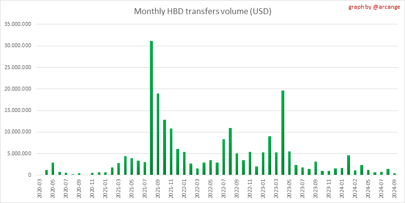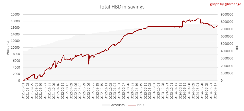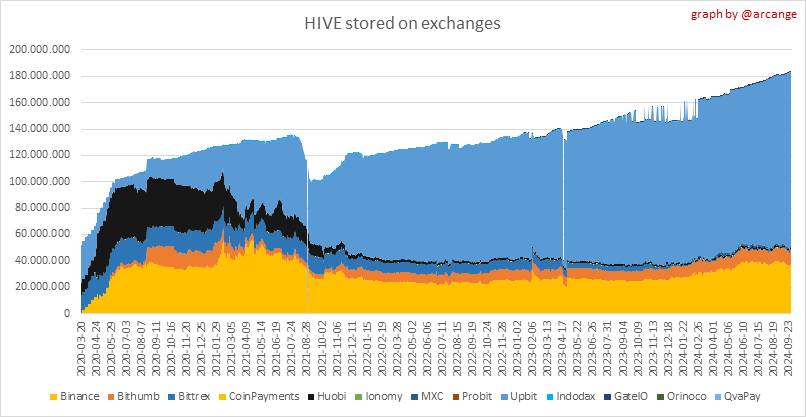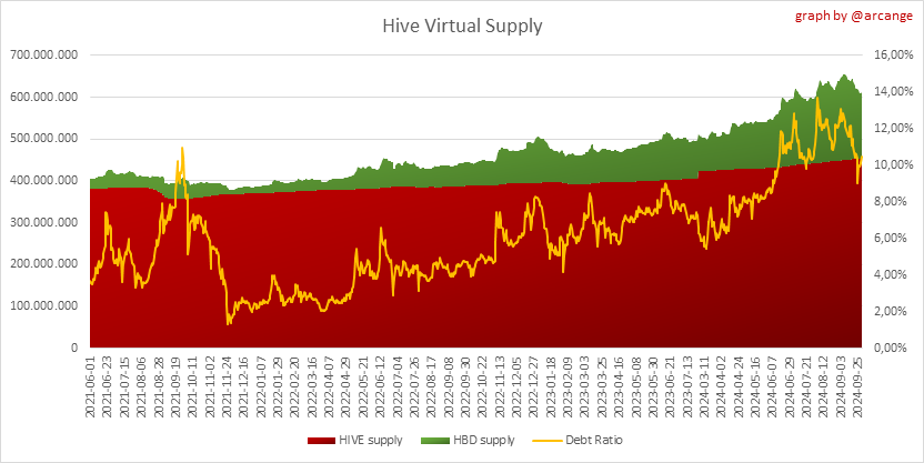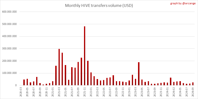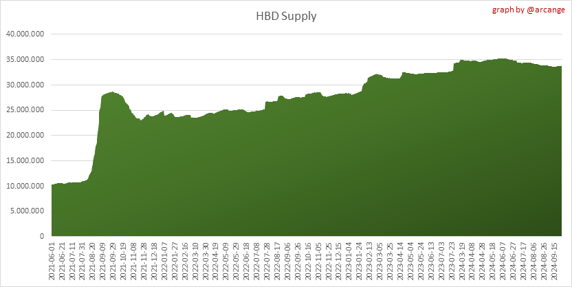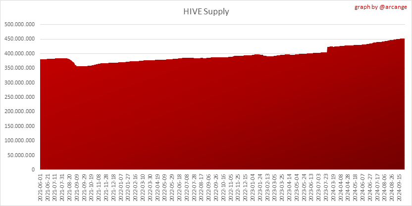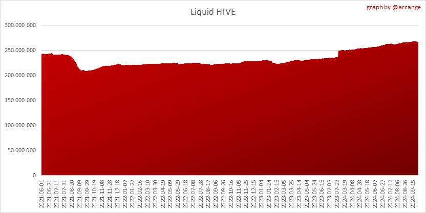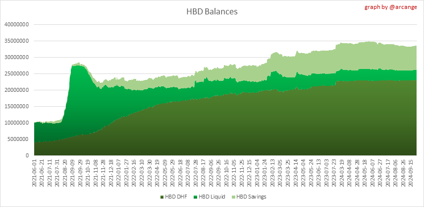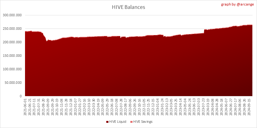 <center></center> ### Welcome to the monthly financial report about the Hive blockchain. All the information presented in this report is based on the data collected from the blockchain until 2024-09-30 midnight UTC. This report aims to provide you with a clear view of what is happening on the Hive blockchain. <sub> Este post está traducido al español - [aquí](/@arcange-es/hive-finance-20240930-es)</sub> <sub> Dieser Beitrag ist ins Deutsche übersetzt - [hier](/@arcange-de/hive-finance-20240930-de)</sub> <sub> Une version en français de ce post est disponible - [ici](/@arcange-fr/hive-finance-20240930-fr)</sub> ### 1. Price ||| |-|-| ||| These graphs show the evolution of prices in USD for HIVE and HBD. ### 2. Supply  This graph shows the evolution of HIVE virtual Supply. The virtual supply is the sum of HIVE supply (liquid and staked HIVE) and HBD supply (converted into HIVE). The graph also displays the debt ratio (HBD supply / HIVE virtual supply). Keep in mind that since hardfork 24 funds in the treasury ([@hive.fund HBD balance](https://peakd.com/@hive.fund/wallet)) don't count towards the HBD debt ratio. ||| |-|-| ||| These graphs show the evolution of the HIVE Supply (both liquid and staked) and the HBD supply. ||| |-|-| || These charts show the evolution of the liquid HIVE and the staked HIVE (Hive Power).  This graph shows the overall Hive tokens distribution. ### 3. HBD Savings  |Account|Deposit|Account|Withdrawal| |-|-:|-|-:| |@peakd|3,900.001 HBD|@trumpman|2,000.000 HBD| |@lordbutterfly|3,800.000 HBD|@holbein81|1,002.884 HBD| |@arcange|750.000 HBD|@amamos|290.000 HBD| |@spiritsurge|332.779 HBD|@lizelle|144.047 HBD| |@eolianpariah2|233.652 HBD|@alejandromata|101.485 HBD| |@gandalf|135.260 HBD|@ressonlelong|50.000 HBD| |@hivesql|135.000 HBD|@cryptoboc|47.764 HBD| |@oflyhigh|87.313 HBD|@adhammer|35.516 HBD| |@brian.rrr|70.000 HBD|@filoriologo|33.000 HBD| |@johnhtims.life|68.173 HBD|@omarcitorojas|27.495 HBD| This graph shows how much and how many accounts store HBD in savings. The table below shows the topmost HBD deposits and withdrawals of the day.  _<sub>**Note:** As of 2021-06-30 (HF25) interest is only paid for HBD which are stored in savings.</sub>_ This chart shows the amount of interest paid each month for holding HBD and how many accounts received such interest. ### 4. Balances  This graph shows the number of HIVE, both liquid and in savings, held by all accounts.  This graph shows the number of HBD, both liquid and in savings, held by all accounts. It also displays the amount of HBD stored in the Decentralized Hive Fund (DHF). ### 5. Conversions <sub>_**Note:** As a reminder, conversion requests are only finalized after 3 days. It is only then that it is known exactly how many HIVE were burned in return for the HBD received at the time of the conversion request._</sub>  This graph shows the number of HIVE collateralized due to requests to convert HIVE to HBD over the past few days. ||| |-|-| ||| These graphs show the number of HIVE effectively used by the conversion process (HIVE converted and 5% HIVE fee which is burned) each day and month when requests to convert HIVE to HBD have been finalized. ||| |-|-| ||| These graphs show the number of HBD burned, each day and each month, following requests to convert HBD to HIVE. ### 6. Powerup and Powerdown  |Date|Account|Amount| |-|-|-:| |2024-09-30 06:19:51|@ausbitbank|36,171.317 HIVE| |2024-09-30 05:39:18|@lunaticanto|10,277.886 HIVE| |2024-09-30 12:01:03|@asean.hive|4,032.091 HIVE| |2024-09-30 12:02:48|@asean.hive|3,250.344 HIVE| |2024-09-30 06:07:21|@kkarenmp|3,234.791 HIVE| |2024-09-30 02:43:00|@a04|3,192.221 HIVE| |2024-09-30 08:55:36|@hispapro|2,600.194 HIVE| |2024-09-30 11:20:36|@fortune1m|2,288.151 HIVE| |2024-09-30 09:51:24|@mamrita|2,245.239 HIVE| |2024-09-30 02:16:51|@angelica7|1,560.553 HIVE| This graph and table show the amount of powerdown initiated over the last 7 days, and the largest initiated on this day.  |Account|Powerup|Account|Powerdown| |-|-:|-|-:| |@seraphiel|17,800.000 HIVE|@nonameslefttouse|7,085.512 HIVE| |@nevio104|13,730.198 HIVE|@holbein81|6,566.971 HIVE| |@hoosie|1,779.501 HIVE|@jeffjagoe|4,364.530 HIVE| |@wellingt556|1,313.353 HIVE|@threespeak|3,095.706 HIVE| |@duo-curator|1,033.488 HIVE|@steempeak|2,932.410 HIVE| |@tamiil|623.532 HIVE|@ausbitbank|2,510.908 HIVE| |@eddie-earner|552.386 HIVE|@threespeak|2,432.341 HIVE| |@ecosaint|502.000 HIVE|@amirl|1,745.874 HIVE| |@eolianpariah2|390.369 HIVE|@spotbtc|1,685.468 HIVE| |@jkp.nisha|350.000 HIVE|@atma.love|1,539.300 HIVE| This graph shows the daily HIVE power-up, power-down, and the resulting variation over the last 30 days. The table shows the topmost power-ups and power-downs of the day.  This graph shows the monthly HIVE power-up, power-down and the resulting variation. **Values for the last 3 months** |Period|Powerup|Powerdown|Difference| |-|-:|-:|-:| |2024-09|2,258,774.000|1,912,920.000|345,854.000| |2024-08|2,281,786.000|2,178,229.000|103,557.000| |2024-07|4,043,672.000|2,107,671.000|1,936,001.000| ### 7. Transfers ||| |-|-| ||| These graphs show the volume (in USD) of HIVE and HBD transferred between accounts. ### 8. Exchanges ||| |-|-| ||| These graphs show the amount and distribution of HIVE and HBD stored on the exchanges where they are listed. ||| |-|-| ||| These graphs show the daily evolution of HIVE and HBD stored on the exchanges where they are listed. --- I hope you find those stats useful. If you would like to see additional stats, feel free to drop me a comment. Your feedback is more than welcome. Thanks for reading. --- <center> ### Check out my apps and services <a href="https://engage.hivechain.app"><img src="https://i.imgur.com/GiNJqlm.png"></a><a href="https://doc.hivebuzz.me"><img src="https://i.imgur.com/B4UTun2.png"></a><a href="https://hivesql.io"><img src="https://i.imgur.com/EPN8RW6.png"></a><a href="https://hiveauth.com"><img src="https://i.imgur.com/2Ws6KzW.png"></a><a href="/hive/@arcange/introducing-hive-accoun