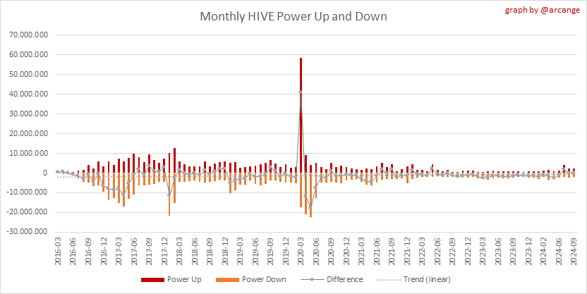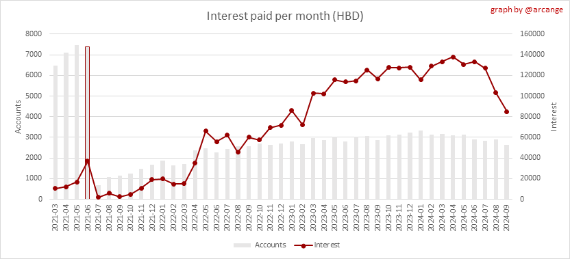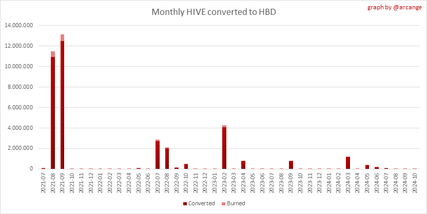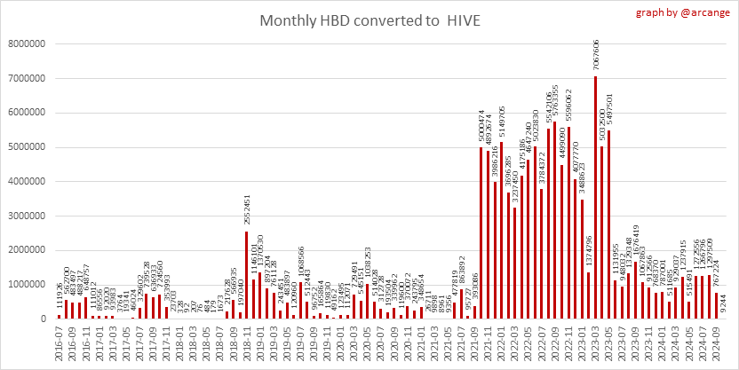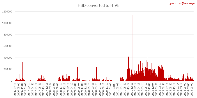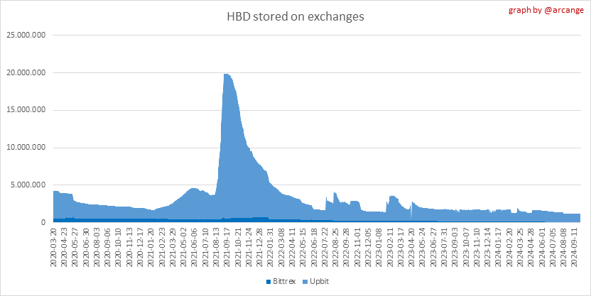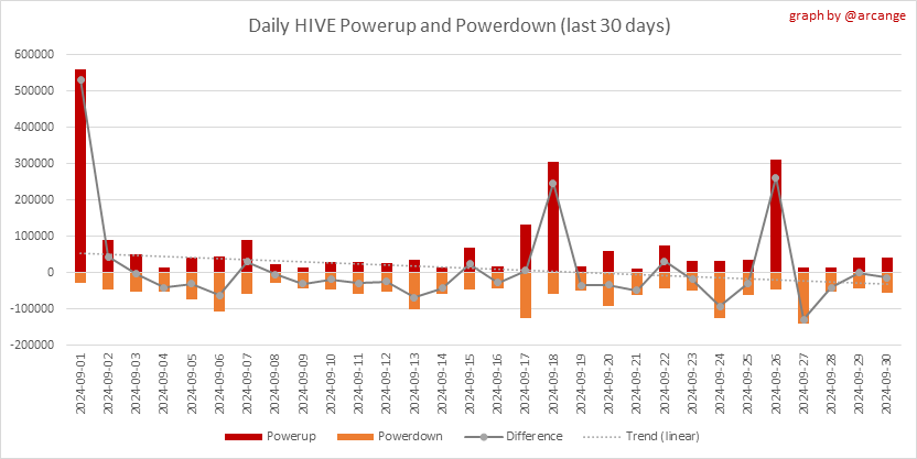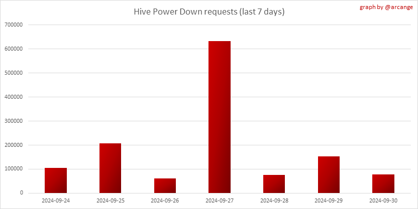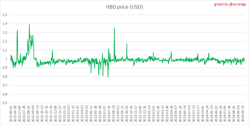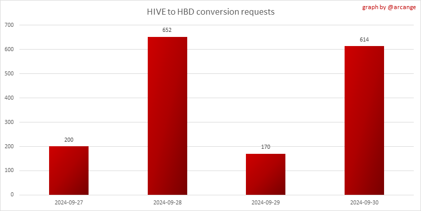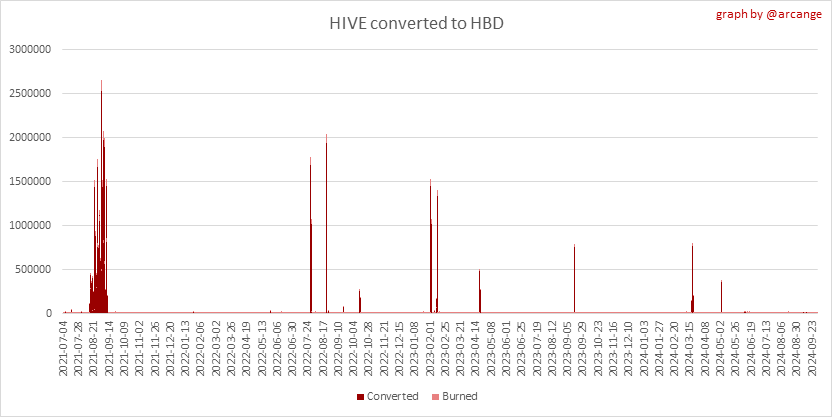 <center></center> ### Welcome to the monthly financial report about the Hive blockchain. All the information presented in this report is based on the data collected from the blockchain until 2024-09-30 midnight UTC. This report aims to provide you with a clear view of what is happening on the Hive blockchain. <sub> Este post está traducido al español - [aquí](/@arcange-es/hive-finance-20240930-es)</sub> <sub> Dieser Beitrag ist ins Deutsche übersetzt - [hier](/@arcange-de/hive-finance-20240930-de)</sub> <sub> Une version en français de ce post est disponible - [ici](/@arcange-fr/hive-finance-20240930-fr)</sub> ### 1. Price ||| |-|-| ||| These graphs show the evolution of prices in USD for HIVE and HBD. ### 2. Supply  This graph shows the evolution of HIVE virtual Supply. The virtual supply is the sum of HIVE supply (liquid and staked HIVE) and HBD supply (converted into HIVE). The graph also displays the debt ratio (HBD supply / HIVE virtual supply). Keep in mind that since hardfork 24 funds in the treasury ([@hive.fund HBD balance](https://peakd.com/@hive.fund/wallet)) don't count towards the HBD debt ratio. ||| |-|-| ||| These graphs show the evolution of the HIVE Supply (both liquid and staked) and the HBD supply. ||| |-|-| || These charts show the evolution of the liquid HIVE and the staked HIVE (Hive Power).  This graph shows the overall Hive tokens distribution. ### 3. HBD Savings  |Account|Deposit|Account|Withdrawal| |-|-:|-|-:| |@peakd|3,900.001 HBD|@trumpman|2,000.000 HBD| |@lordbutterfly|3,800.000 HBD|@holbein81|1,002.884 HBD| |@arcange|750.000 HBD|@amamos|290.000 HBD| |@spiritsurge|332.779 HBD|@lizelle|144.047 HBD| |@eolianpariah2|233.652 HBD|@alejandromata|101.485 HBD| |@gandalf|135.260 HBD|@ressonlelong|50.000 HBD| |@hivesql|135.000 HBD|@cryptoboc|47.764 HBD| |@oflyhigh|87.313 HBD|@adhammer|35.516 HBD| |@brian.rrr|70.000 HBD|@filoriologo|33.000 HBD| |@johnhtims.life|68.173 HBD|@omarcitorojas|27.495 HBD| This graph shows how much and how many accounts store HBD in savings. The table below shows the topmost HBD deposits and withdrawals of the day.  _<sub>**Note:** As of 2021-06-30 (HF25) interest is only paid for HBD which are stored in savings.</sub>_ This chart shows the amount of interest paid each month for holding HBD and how many accounts received such interest. ### 4. Balances  This graph shows the number of HIVE, both liquid and in savings, held by all accounts.  This graph shows the number of HBD, both liquid and in savings, held by all accounts. It also displays the amount of HBD stored in the Decentralized Hive Fund (DHF). ### 5. Conversions <sub>_**Note:** As a reminder, conversion requests are only finalized after 3 days. It is only then that it is known exactly how many HIVE were burned in return for the HBD received at the time of the conversion request._</sub>  This graph shows the number of HIVE collateralized due to requests to convert HIVE to HBD over the past few days. ||| |-|-| ||| These graphs show the number of HIVE effectively used by the conversion process (HIVE converted and 5% HIVE fee which is burned) each day and month when requests to convert HIVE to HBD have been finalized. ||| |-|-| ||| These graphs show the number of HBD burned, each day and each month, following requests to convert HBD to HIVE. ### 6. Powerup and Powerdown  |Date|Account|Amount| |-|-|-:| |2024-09-30 06:19:51|@ausbitbank|36,171.317 HIVE| |2024-09-30 05:39:18|@lunaticanto|10,277.886 HIVE| |2024-09-30 12:01:03|@asean.hive|4,032.091 HIVE| |2024-09-30 12:02:48|@asean.hive|3,250.344 HIVE| |2024-09-30 06:07:21|@kkarenmp|3,234.791 HIVE| |2024-09-30 02:43:00|@a04|3,192.221 HIVE| |2024-09-30 08:55:36|@hispapro|2,600.194 HIVE| |2024-09-30 11:20:36|@fortune1m|2,288.151 HIVE| |2024-09-30 09:51:24|@mamrita|2,245.239 HIVE| |2024-09-30 02:16:51|@angelica7|1,560.553 HIVE| This graph and table show the amount of powerdown initiated over the last 7 days, and the largest initiated on this day.  |Account|Powerup|Account|Powerdown| |-|-:|-|-:| |@seraphiel|17,800.000 HIVE|@nonameslefttouse|7,085.512 HIVE| |@nevio104|13,730.198 HIVE|@holbein81|6,566.971 HIVE| |@hoosie|1,779.501 HIVE|@jeffjagoe|4,364.530 HIVE| |@wellingt556|1,313.353 HIVE|@threespeak|3,095.706 HIVE| |@duo-curator|1,033.488 HIVE|@steempeak|2,932.410 HIVE| |@tamiil|623.532 HIVE|@ausbitbank|2,510.908 HIVE| |@eddie-earner|552.386 HIVE|@threespeak|2,432.341 HIVE| |@ecosaint|502.000 HIVE|@amirl|1,745.874 HIVE| |@eolianpariah2|390.369 HIVE|@spotbtc|1,685.468 HIVE| |@jkp.nisha|350.000 HIVE|@atma.love|1,539.300 HIVE| This graph shows the daily HIVE power-up, power-down, and the resulting variation over the last 30 days. The table shows the topmost power-ups and power-downs of the day.  This graph shows the monthly HIVE power-up, power-down and the resulting variation. **Values for the last 3 months** |Period|Powerup|Powerdown|Difference| |-|-:|-:|-:| |2024-09|2,258,774.000|1,912,920.000|345,854.000| |2024-08|2,281,786.000|2,178,229.000|103,557.000| |2024-07|4,043,672.000|2,107,671.000|1,936,001.000| ### 7. Transfers ||| |-|-| ||| These graphs show the volume (in USD) of HIVE and HBD transferred between accounts. ### 8. Exchanges ||| |-|-| ||| These graphs show the amount and distribution of HIVE and HBD stored on the exchanges where they are listed. ||| |-|-| ||| These graphs show the daily evolution of HIVE and HBD stored on the exchanges where they are listed. --- I hope you find those stats useful. If you would like to see additional stats, feel free to drop me a comment. Your feedback is more than welcome. Thanks for reading. --- <center> ### Check out my apps and services <a href="https://engage.hivechain.app"><img src="https://i.imgur.com/GiNJqlm.png"></a><a href="https://doc.hivebuzz.me"><img src="https://i.imgur.com/B4UTun2.png"></a><a href="https://hivesql.io"><img src="https://i.imgur.com/EPN8RW6.png"></a><a href="https://hiveauth.com"><img src="https://i.imgur.com/2Ws6KzW.png"></a><a href="/hive/@arcange/introducing-hive-accoun