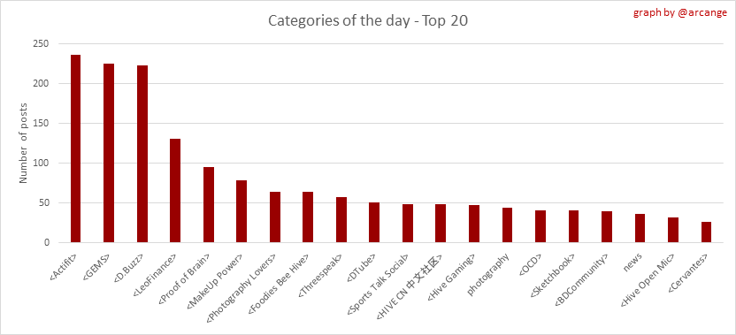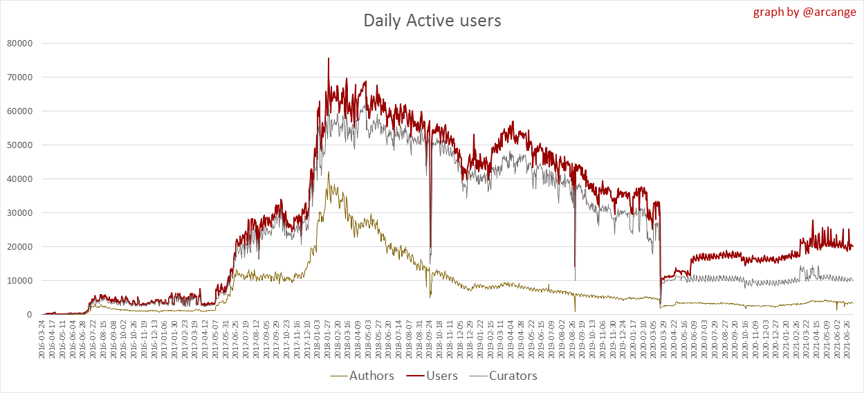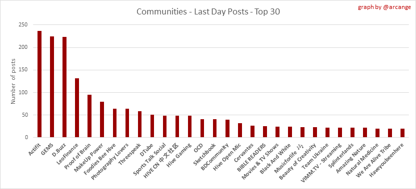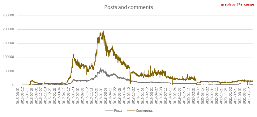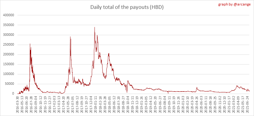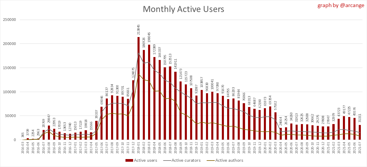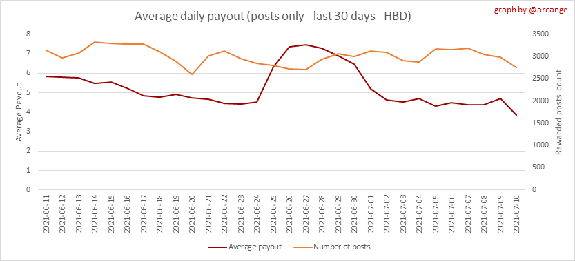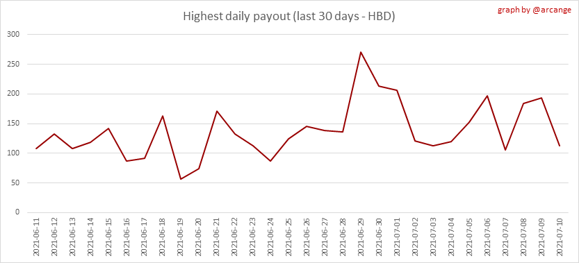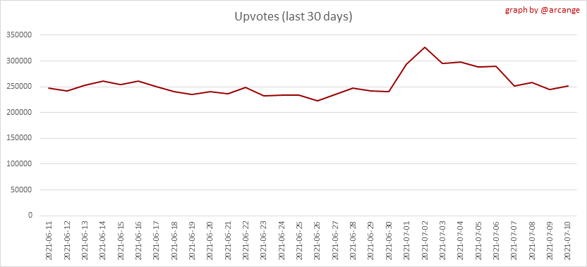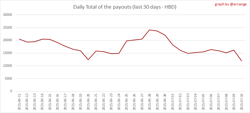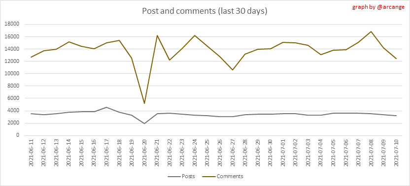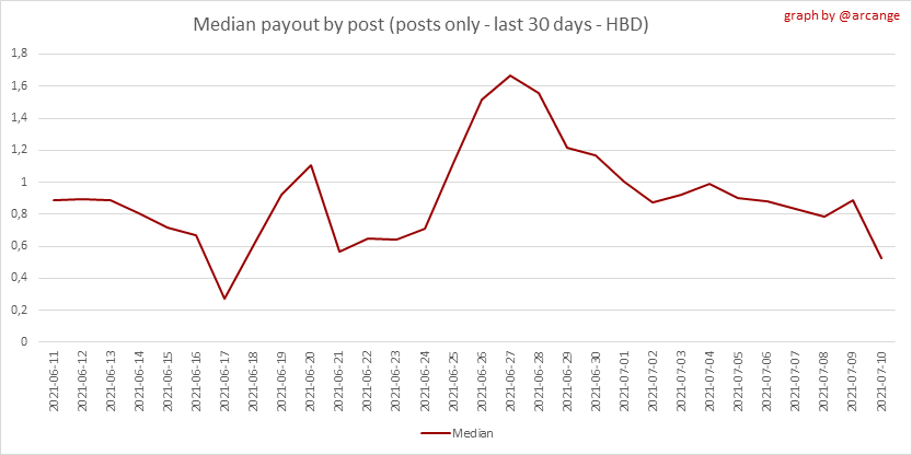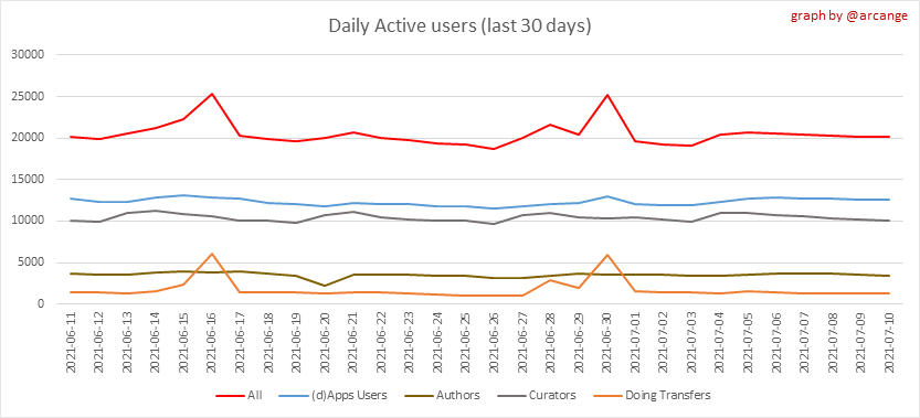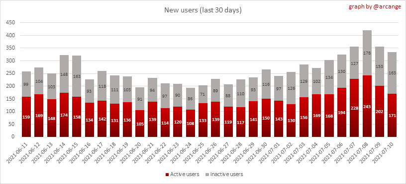 <center></center> ### Welcome to the daily analytical report about the Hive blockchain. All the information presented in this report is based on the data collected from the blockchain until 2021-07-10 midnight UTC time. The goal of this report is to provide you with a clear view of what is happening on the Hive blockchain. <sub> Este post está traducido al español - [aquí](/statistics/@arcange-es/hive-statistics-20210710-es)</sub> <sub> Dieser Beitrag ist ins Deutsche übersetzt - [hier](/statistics/@arcange-de/hive-statistics-20210710-de)</sub> <sub> Une version en français de ce post est disponible - [ici](/statistics/@arcange-fr/hive-statistics-20210710-fr)</sub> ### 1. New users  This chart shows the number of newly registered users on the blockchain and how many of them became active. The chart is kind of dynamic! A user can register one day and become active a few days later. Therefore, the number of active users on a specific date may change from day to day. ||| |-|-| ||| These two graphs show who created new accounts during the last day and the total number of registered accounts. The red line shows how many of them have been active at least once (active meaning publishing a post, commenting or voting). They are included even if they become inactive later. ### 2. Active users ||| |-|-| |||  These graphs show the activity of users over time and in more detail for the last 30 days. In these graphs, "active users" are those performing any type of transaction on the blockchain. The last graph is a monthly summary of the active users. Be careful when interpreting the value of the last column which can be much lower if the end of the month has not yet been reached. ### 3. Apps & (d)Apps  This graph shows which applications are most used to publish posts and comments. Please note that the same user can use several different applications.  This graph shows which applications generate the most activity (custom_json operations) on the blockchain. ### 4. Posts And comments ||| |-|-| ||| These graphs show the evolution of posts and comments for the whole blockchain lifetime and for the last 30 days. ### 5. Curation ||| |-|-| ||| These graphs show the evolution of curation (upvotes) for the whole blockchain lifetime and for the last 30 days. ### 6. Daily transactions  This graph shows the number of daily transactions. This gives you an idea of the whole activity on the blockchain.  This graph shows the distribution of the top 15 types of transactions by number of operations performed on the blockchain. ### 7. Communities and Tags  This graph shows the communities with the most subscribers. ||| |-|-| ||| These graphs show the most active communities by number of posts (blockchain lifetime and last day). ||| |-|-| ||| These graphs show which main tags have been the most used for publishing posts for the whole blockchain lifetime and for the last day. ### 8. Distribution ||| |-|-| ||| These graphs show the number of users according to their Hive Power. The left graph shows the distribution without taking into account any delegation made or received by the accounts. The right graph takes into account delegation, adds received HP delegation and subtracts given HP delegation. The grey portion of each column indicates how many accounts are inactive (those who have not posted, commented or voted for the last 30 days). ||| |-|-| ||| This graph shows the distribution of Hive Power cumulated per account level. The left graph shows the distribution without taking into account any delegation made or received by the accounts. The right graphs take into account delegation, adds received HP delegation and subtracts given HP delegation. The grey portion of each column indicates unused Hive Power by inactive accounts (see above for the definition of inactive). Below each column, you will also see a ratio to all existing Hive Power. ### 9. Payouts  This graph shows the highest reward paid on a post (or comment) for the last 30 days. ||| |-|-| ||| These graphs show the total of the distributed payout (posts and comments) for each day. ||| |-|-| ||| These graphs show the average and median payout per post for the last 30 days. --- I hope you find those stats useful. If you would like to see different stats, feel free to drop me a comment. Your feedback is more than welcome. Thanks for reading. --- <center> ### Check out my apps and services <a href="/hive/@hive.engage/stay-connected-with-your-hive-audience-and-catch-attention"><img src="https://i.imgur.com/GiNJqlm.png"></a><a href="/@hivebuzz"><img src="https://i.imgur.com/B4UTun2.png"></a><a href="/@hivesql"><img src="https://i.imgur.com/EPN8RW6.png"></a><a href="/hive/@arcange/introducing-hive-account-recovery"><img src="https://i.imgur.com/6TWeW7V.png"></a><a href="/@hive.autoclaim"><img src="https://i.imgur.com/ih2pEOw.png"></a></center> <center> ### [Vote for me as a witness ](https://hivesigner.com/sign/account-witness-vote?witness=arcange&approve=1) </center>