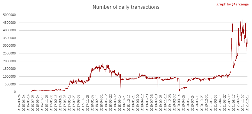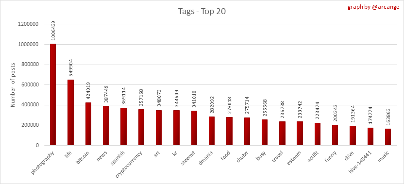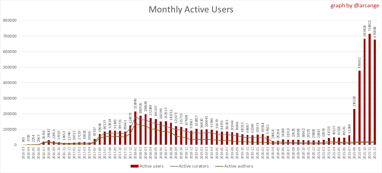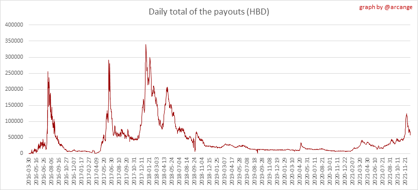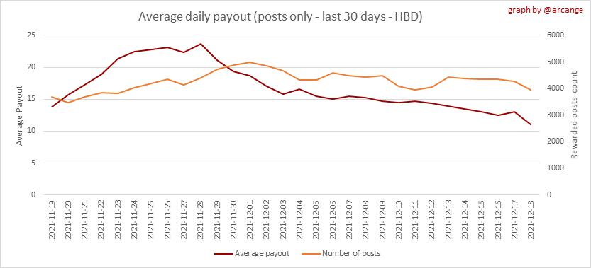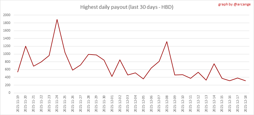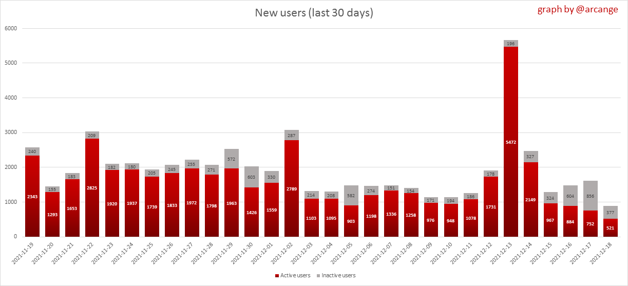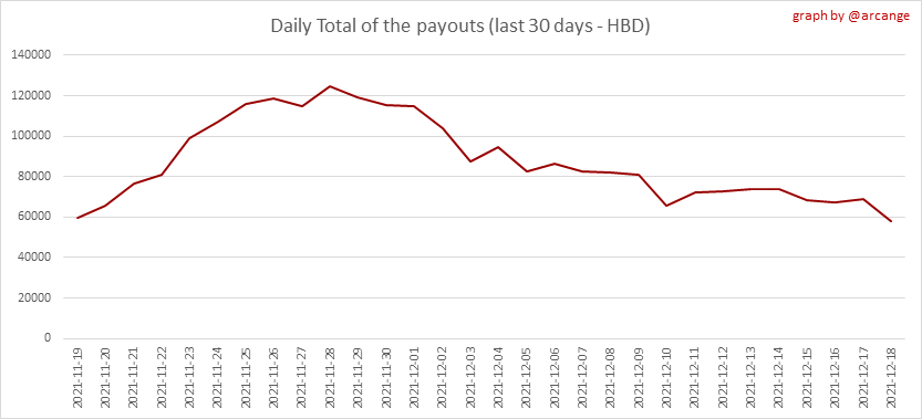 <center></center> ### Welcome to the daily analytical report about the Hive blockchain. All the information presented in this report is based on the data collected from the blockchain until 2021-12-18 midnight UTC. This report aims to provide you with a clear view of what is happening on the Hive blockchain. <sub> Este post está traducido al español - [aquí](/@arcange-es/hive-statistics-20211218-es)</sub> <sub> Dieser Beitrag ist ins Deutsche übersetzt - [hier](/@arcange-de/hive-statistics-20211218-de)</sub> <sub> Une version en français de ce post est disponible - [ici](/@arcange-fr/hive-statistics-20211218-fr)</sub> ### 1. New users  This chart shows the number of newly registered users on the blockchain and how many of them became active. The chart is kind of dynamic! A user can register one day and become active a few days later. Therefore, the number of active users on a specific date may change from day to day. ||| |-|-| ||| These two graphs show who created new accounts during the last day and the total number of registered accounts. The red line shows how many of them have been active at least once (active meaning publishing a post, commenting or voting). They are included even if they become inactive later. ### 2. Active users ||| |-|-| |||  These graphs show the activity of users over time and in more detail the last 30 days. In these graphs, "active users" are those performing any type of transaction on the blockchain. The last graph is a monthly summary of the active users. Be careful when interpreting the value of the last column which can be much lower if the end of the month has not yet been reached. ### 3. Apps & (d)Apps  This graph shows which applications are most used to publish posts and comments. Please note that the same user can use several different applications.  This graph shows which applications generate the most activity (custom_json operations) on the blockchain. ### 4. Posts And comments ||| |-|-| ||| These graphs show the evolution of posts and comments for the whole blockchain lifetime and the last 30 days. ### 5. Curation ||| |-|-| ||| These graphs show the evolution of curation (upvotes) for the whole blockchain lifetime and the last 30 days. ### 6. Daily transactions  |||| |-|-|-| |||| These graphs show the number of transactions per day, and the highest number of transactions per block, the average number of transactions per block, and the number of transactions per block for the last 48 hours. This gives you an idea of the whole activity on the blockchain.  This graph shows the distribution of the top 10 types of transactions by number of operations performed on the blockchain. ### 7. Communities and Tags  This graph shows the communities with the most subscribers. ||| |-|-| ||| These graphs show the most active communities by number of posts (blockchain lifetime and last day). ||| |-|-| ||| These graphs show which main tags have been the most used for publishing posts for the whole blockchain lifetime and the last day. ### 8. Distribution |||||| |:-:|:-:|:-:|:-:|:-:| |||||| |<sub>< ~541 HP</sub>|<sub>>= ~541 HP</sub>|<sub>>= ~5402 HP</sub>|<sub>>= ~54013 HP</sub>|<sub>>= ~540122 HP</sub>| ||| |-|-| ||| These graphs show the number of users according to their Hive Power. The left graph shows the distribution without taking into account any delegation made or received by the accounts. The right graph takes into account delegation, adds received HP delegation and subtracts given HP delegation. The grey part of each column indicates how many accounts are inactive (those who have not posted, commented or voted the last 30 days). ||| |-|-| ||| This graph shows the distribution of Hive Power cumulated per account level. The left graph shows the distribution without taking into account any delegation made or received by the accounts. The right graphs take into account delegation, adds received HP delegation and subtracts given HP delegation. The grey part of each column indicates unused Hive Power by inactive accounts (see above the definition of inactive). Below each column, you will also see a ratio to all existing Hive Power. ### 9. Payouts  This graph shows the highest reward paid on a post (or comment) for the last 30 days. ||| |-|-| ||| These graphs show the total of the distributed payout (posts and comments) for each day. ||| |-|-| ||| These graphs show the average and median payout per post for the last 30 days. --- I hope you find those stats useful. If you would like to see additional stats, feel free to drop me a comment. Your feedback is welcome. Thanks for reading. --- <center> ### Check out my apps and services <a href="/hive/@hive.engage/stay-connected-with-your-hive-audience-and-catch-attention"><img src="https://i.imgur.com/GiNJqlm.png"></a><a href="/@hivebuzz"><img src="https://i.imgur.com/B4UTun2.png"></a><a href="/@hivesql"><img src="https://i.imgur.com/EPN8RW6.png"></a><a href="/hive/@arcange/introducing-hive-account-recovery"><img src="https://i.imgur.com/6TWeW7V.png"></a><a href="/@hive.autoclaim"><img src="https://i.imgur.com/ih2pEOw.png"></a></center> <center> ### [Vote for me as a witness ](https://hivesigner.com/sign/account-witness-vote?witness=arcange&approve=1) </center>