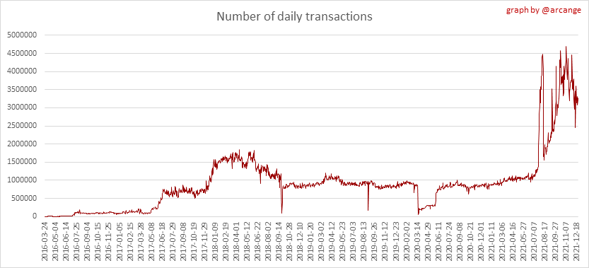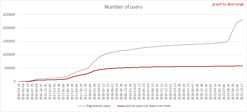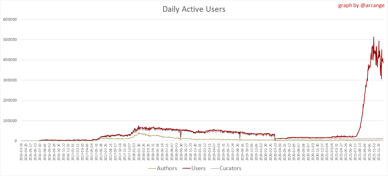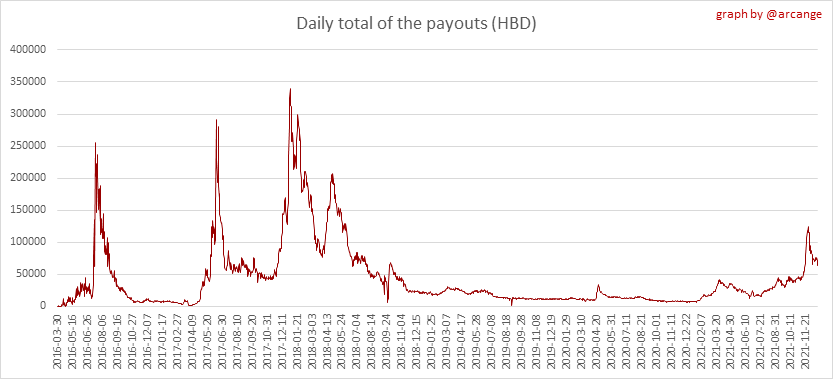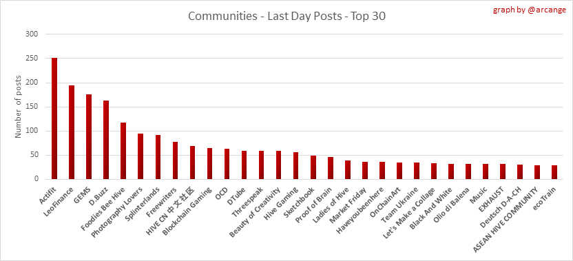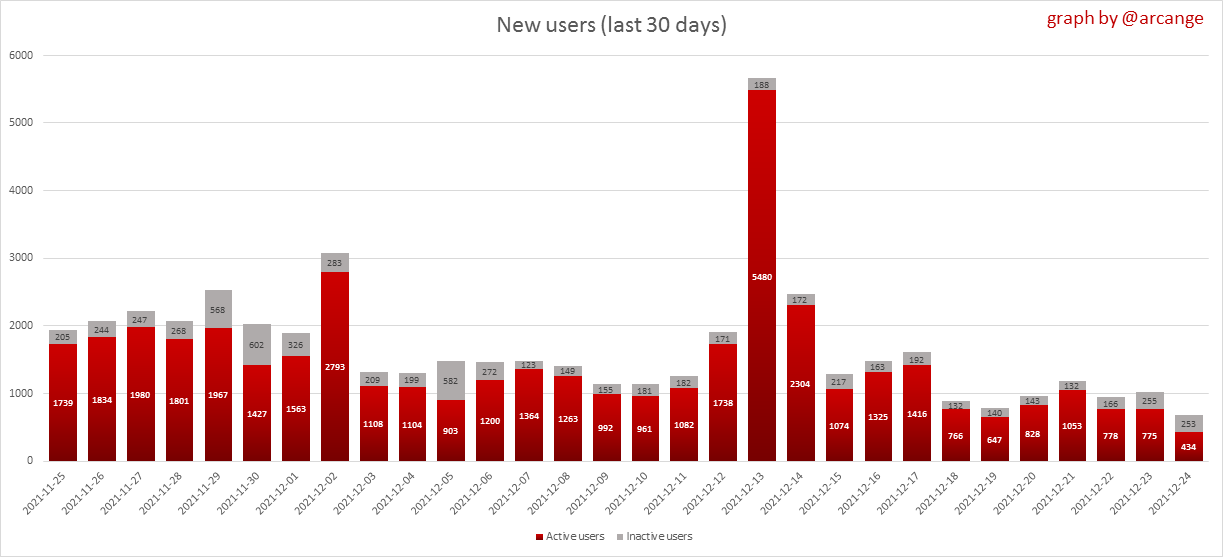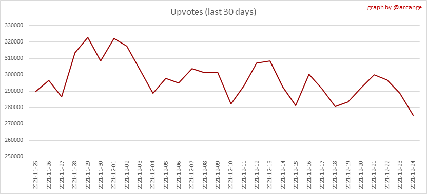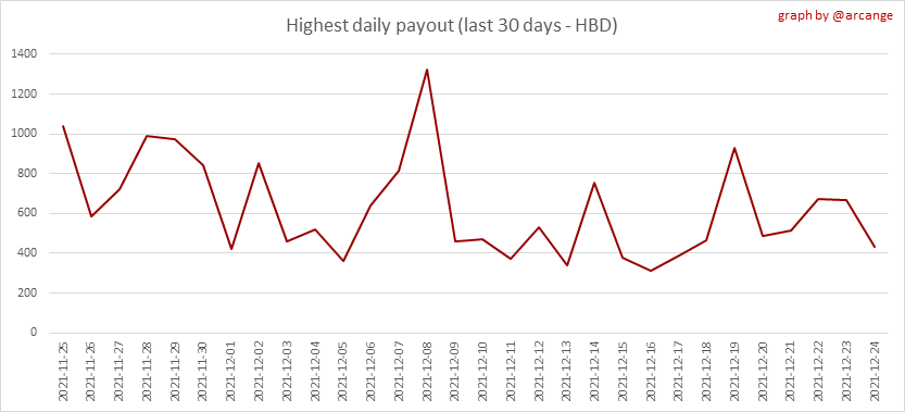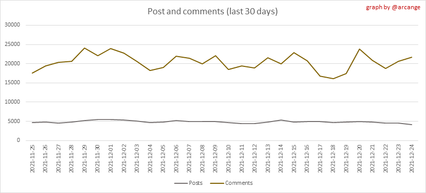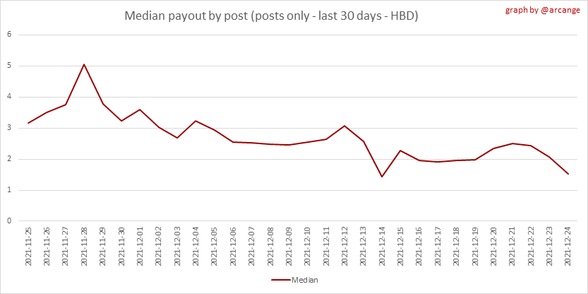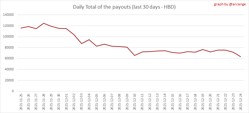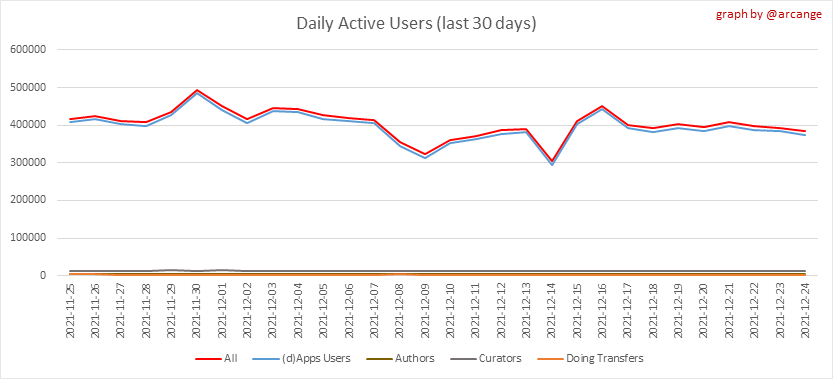 <center></center> ### Welcome to the daily analytical report about the Hive blockchain. All the information presented in this report is based on the data collected from the blockchain until 2021-12-24 midnight UTC. This report aims to provide you with a clear view of what is happening on the Hive blockchain. <sub> Este post está traducido al español - [aquí](/@arcange-es/hive-statistics-20211224-es)</sub> <sub> Dieser Beitrag ist ins Deutsche übersetzt - [hier](/@arcange-de/hive-statistics-20211224-de)</sub> <sub> Une version en français de ce post est disponible - [ici](/@arcange-fr/hive-statistics-20211224-fr)</sub> ### 1. New users  This chart shows the number of newly registered users on the blockchain and how many of them became active. The chart is kind of dynamic! A user can register one day and become active a few days later. Therefore, the number of active users on a specific date may change from day to day. ||| |-|-| ||| These two graphs show who created new accounts during the last day and the total number of registered accounts. The red line shows how many of them have been active at least once (active meaning publishing a post, commenting or voting). They are included even if they become inactive later. ### 2. Active users ||| |-|-| |||  These graphs show the activity of users over time and in more detail the last 30 days. In these graphs, "active users" are those performing any type of transaction on the blockchain. The last graph is a monthly summary of the active users. Be careful when interpreting the value of the last column which can be much lower if the end of the month has not yet been reached. ### 3. Apps & (d)Apps  This graph shows which applications are most used to publish posts and comments. Please note that the same user can use several different applications.  This graph shows which applications generate the most activity (custom_json operations) on the blockchain. ### 4. Posts And comments ||| |-|-| ||| These graphs show the evolution of posts and comments for the whole blockchain lifetime and the last 30 days. ### 5. Curation ||| |-|-| ||| These graphs show the evolution of curation (upvotes) for the whole blockchain lifetime and the last 30 days. ### 6. Daily transactions  |||| |-|-|-| |||| These graphs show the number of transactions per day, and the highest number of transactions per block, the average number of transactions per block, and the number of transactions per block for the last 48 hours. This gives you an idea of the whole activity on the blockchain.  This graph shows the distribution of the top 10 types of transactions by number of operations performed on the blockchain. ### 7. Communities and Tags  This graph shows the communities with the most subscribers. ||| |-|-| ||| These graphs show the most active communities by number of posts (blockchain lifetime and last day). ||| |-|-| ||| These graphs show which main tags have been the most used for publishing posts for the whole blockchain lifetime and the last day. ### 8. Distribution |||||| |:-:|:-:|:-:|:-:|:-:| |||||| |<sub>< ~541 HP</sub>|<sub>>= ~541 HP</sub>|<sub>>= ~5404 HP</sub>|<sub>>= ~54038 HP</sub>|<sub>>= ~540378 HP</sub>| ||| |-|-| ||| These graphs show the number of users according to their Hive Power. The left graph shows the distribution without taking into account any delegation made or received by the accounts. The right graph takes into account delegation, adds received HP delegation and subtracts given HP delegation. The grey part of each column indicates how many accounts are inactive (those who have not posted, commented or voted the last 30 days). ||| |-|-| ||| This graph shows the distribution of Hive Power cumulated per account level. The left graph shows the distribution without taking into account any delegation made or received by the accounts. The right graphs take into account delegation, adds received HP delegation and subtracts given HP delegation. The grey part of each column indicates unused Hive Power by inactive accounts (see above the definition of inactive). Below each column, you will also see a ratio to all existing Hive Power. ### 9. Payouts  This graph shows the highest reward paid on a post (or comment) for the last 30 days. ||| |-|-| ||| These graphs show the total of the distributed payout (posts and comments) for each day. ||| |-|-| ||| These graphs show the average and median payout per post for the last 30 days. --- I hope you find those stats useful. If you would like to see additional stats, feel free to drop me a comment. Your feedback is welcome. Thanks for reading. --- <center> ### Check out my apps and services <a href="/hive/@hive.engage/stay-connected-with-your-hive-audience-and-catch-attention"><img src="https://i.imgur.com/GiNJqlm.png"></a><a href="/@hivebuzz"><img src="https://i.imgur.com/B4UTun2.png"></a><a href="/@hivesql"><img src="https://i.imgur.com/EPN8RW6.png"></a><a href="/hive/@arcange/introducing-hive-account-recovery"><img src="https://i.imgur.com/6TWeW7V.png"></a><a href="/@hive.autoclaim"><img src="https://i.imgur.com/ih2pEOw.png"></a></center> <center> ### [Vote for me as a witness ](https://hivesigner.com/sign/account-witness-vote?witness=arcange&approve=1) </center>