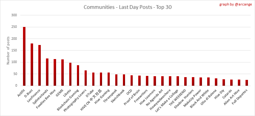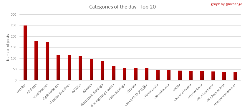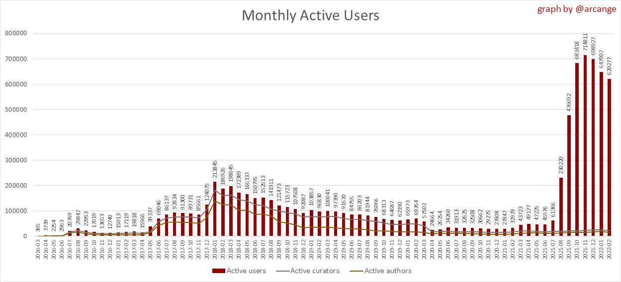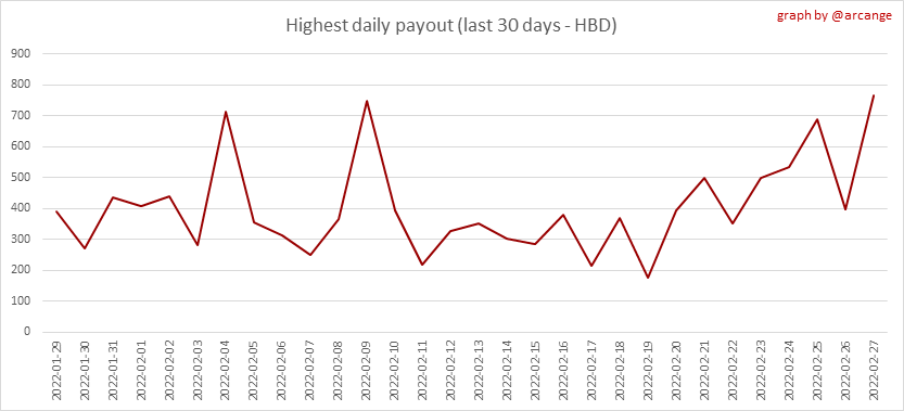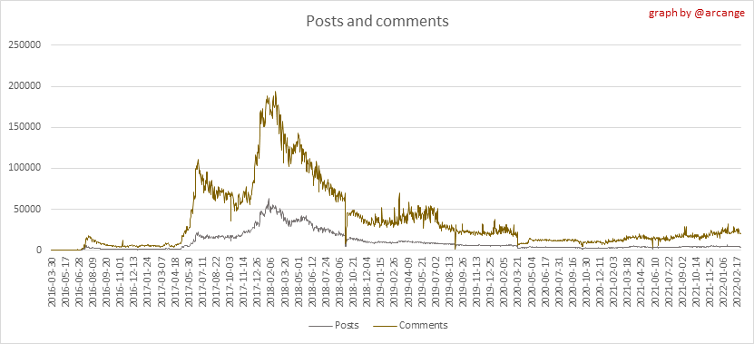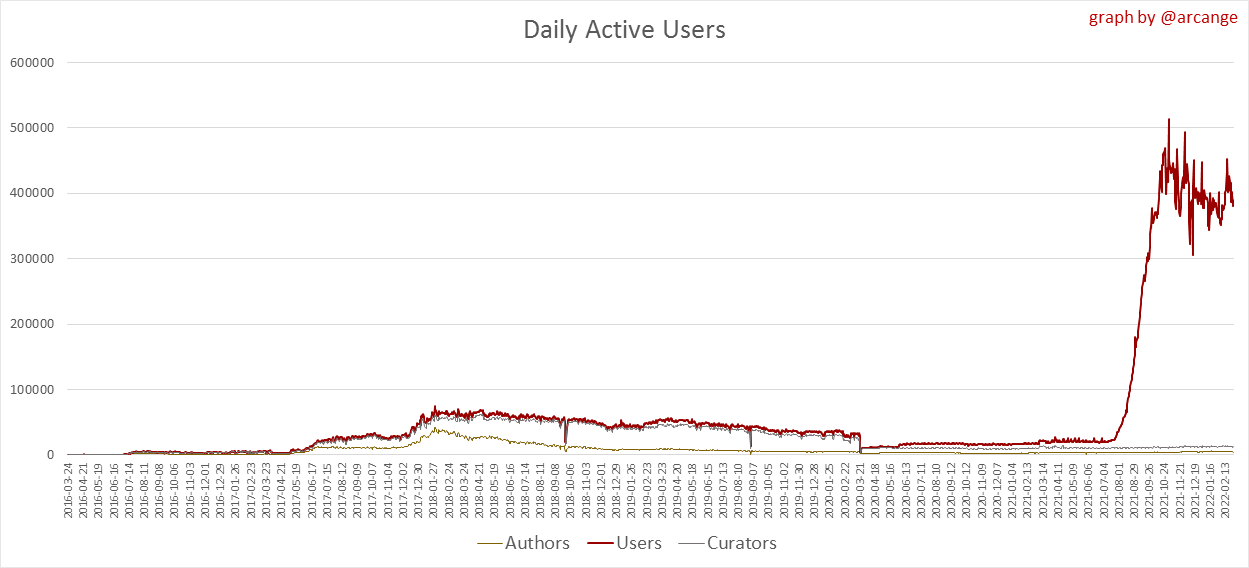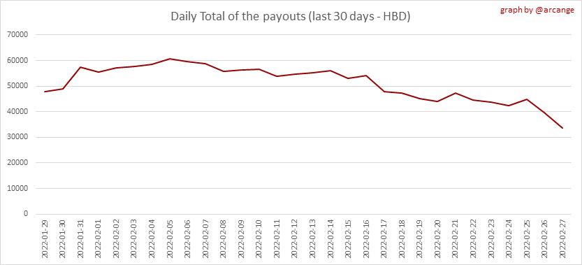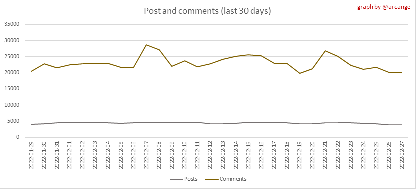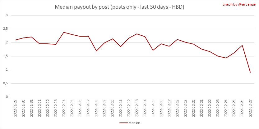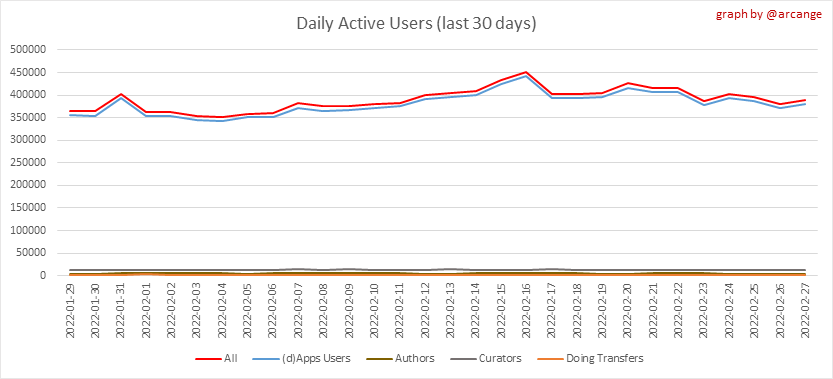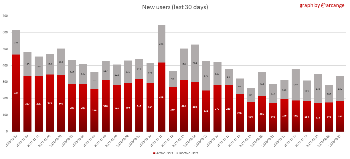 <center></center> ### Welcome to the daily analytical report about the Hive blockchain. All the information presented in this report is based on the data collected from the blockchain until 2022-02-27 midnight UTC. This report aims to provide you with a clear view of what is happening on the Hive blockchain. <sub> Este post está traducido al español - [aquí](/@arcange-es/hive-statistics-20220227-es)</sub> <sub> Dieser Beitrag ist ins Deutsche übersetzt - [hier](/@arcange-de/hive-statistics-20220227-de)</sub> <sub> Une version en français de ce post est disponible - [ici](/@arcange-fr/hive-statistics-20220227-fr)</sub> ### 1. New users  This chart shows the number of newly registered users on the blockchain and how many of them became active. The chart is kind of dynamic! A user can register one day and become active a few days later. Therefore, the number of active users on a specific date may change from day to day. ||| |-|-| ||| These two graphs show who created new accounts during the last day and the total number of registered accounts. The red line shows how many of them have been active at least once (active meaning publishing a post, commenting or voting). They are included even if they become inactive later. ### 2. Active users ||| |-|-| |||  These graphs show the activity of users over time and in more detail the last 30 days. In these graphs, "active users" are those performing any type of transaction on the blockchain. The last graph is a monthly summary of the active users. Be careful when interpreting the value of the last column which can be much lower if the end of the month has not yet been reached. ### 3. Apps & (d)Apps  This graph shows which applications are most used to publish posts and comments. Please note that the same user can use several different applications.  This graph shows which applications generate the most activity (custom_json operations) on the blockchain. ### 4. Posts And comments ||| |-|-| ||| These graphs show the evolution of posts and comments for the whole blockchain lifetime and the last 30 days. ### 5. Curation ||| |-|-| ||| These graphs show the evolution of curation (upvotes) for the whole blockchain lifetime and the last 30 days. ### 6. Daily transactions  |||| |-|-|-| |||| These graphs show the number of transactions per day, and the highest number of transactions per block, the average number of transactions per block, and the number of transactions per block for the last 48 hours. This gives you an idea of the whole activity on the blockchain.  This graph shows the distribution of the top 10 types of transactions by number of operations performed on the blockchain. ### 7. Communities and Tags  This graph shows the communities with the most subscribers. ||| |-|-| ||| These graphs show the most active communities by number of posts (blockchain lifetime and last day). ||| |-|-| ||| These graphs show which main tags have been the most used for publishing posts for the whole blockchain lifetime and the last day. ### 8. Distribution |||||| |:-:|:-:|:-:|:-:|:-:| |||||| |<sub>< ~544 HP</sub>|<sub>>= ~544 HP</sub>|<sub>>= ~5432 HP</sub>|<sub>>= ~54313 HP</sub>|<sub>>= ~543127 HP</sub>| ||| |-|-| ||| These graphs show the number of users according to their Hive Power. The left graph shows the distribution without taking into account any delegation made or received by the accounts. The right graph takes into account delegation, adds received HP delegation and subtracts given HP delegation. The grey part of each column indicates how many accounts are inactive (those who have not posted, commented or voted the last 30 days). ||| |-|-| ||| This graph shows the distribution of Hive Power cumulated per account level. The left graph shows the distribution without taking into account any delegation made or received by the accounts. The right graphs take into account delegation, adds received HP delegation and subtracts given HP delegation. The grey part of each column indicates unused Hive Power by inactive accounts (see above the definition of inactive). Below each column, you will also see a ratio to all existing Hive Power. ### 9. Payouts  This graph shows the highest reward paid on a post (or comment) for the last 30 days. ||| |-|-| ||| These graphs show the total of the distributed payout (posts and comments) for each day. ||| |-|-| ||| These graphs show the average and median payout per post for the last 30 days. --- I hope you find those stats useful. If you would like to see additional stats, feel free to drop me a comment. Your feedback is welcome. Thanks for reading. --- <center> ### Check out my apps and services <a href="/hive/@hive.engage/stay-connected-with-your-hive-audience-and-catch-attention"><img src="https://i.imgur.com/GiNJqlm.png"></a><a href="/@hivebuzz"><img src="https://i.imgur.com/B4UTun2.png"></a><a href="/@hivesql"><img src="https://i.imgur.com/EPN8RW6.png"></a><a href="/hive/@arcange/introducing-hive-account-recovery"><img src="https://i.imgur.com/6TWeW7V.png"></a><a href="/@hive.autoclaim"><img src="https://i.imgur.com/ih2pEOw.png"></a></center> <center> ### [Vote for me as a witness ](https://hivesigner.com/sign/account-witness-vote?witness=arcange&approve=1) </center>