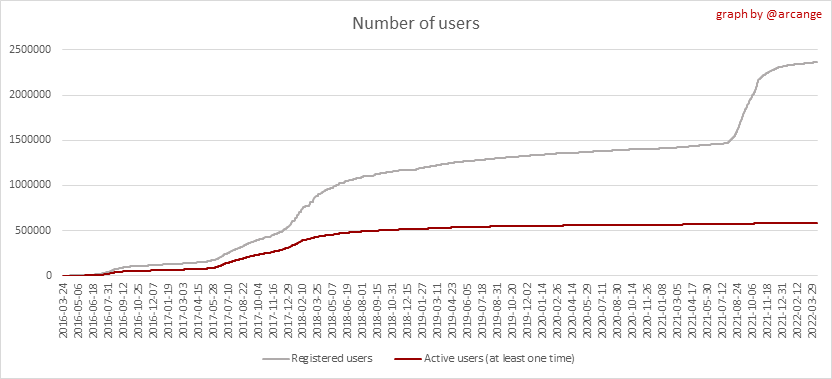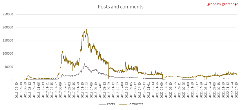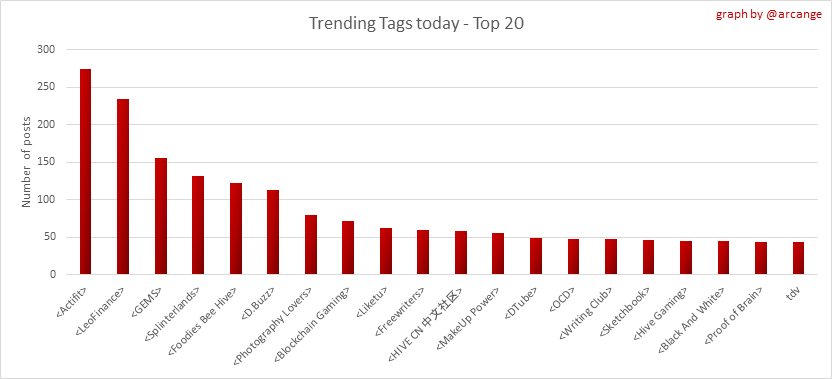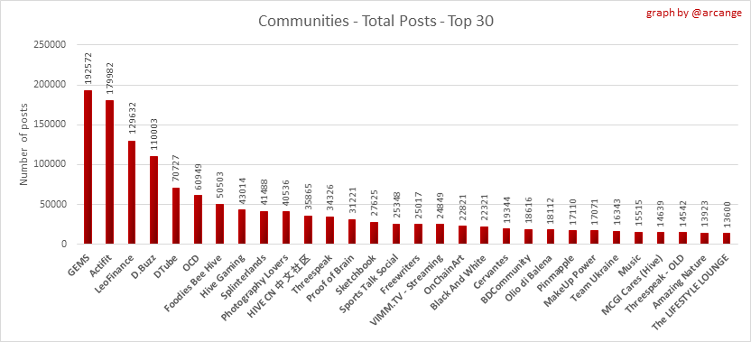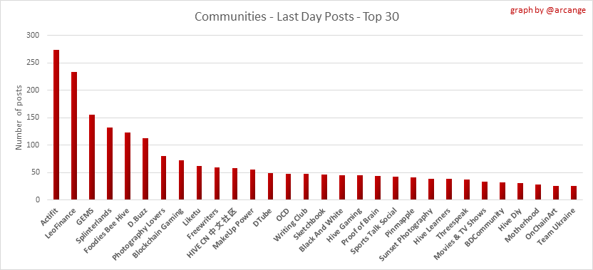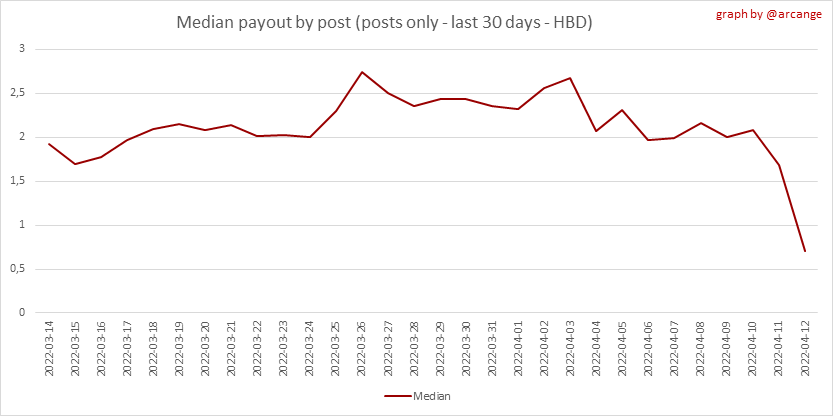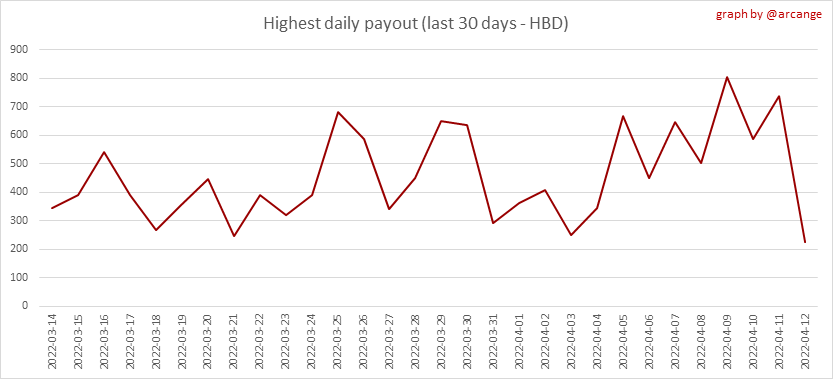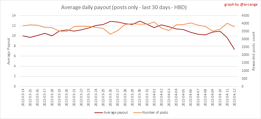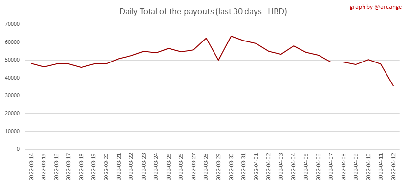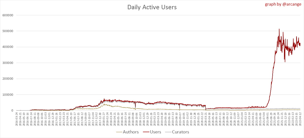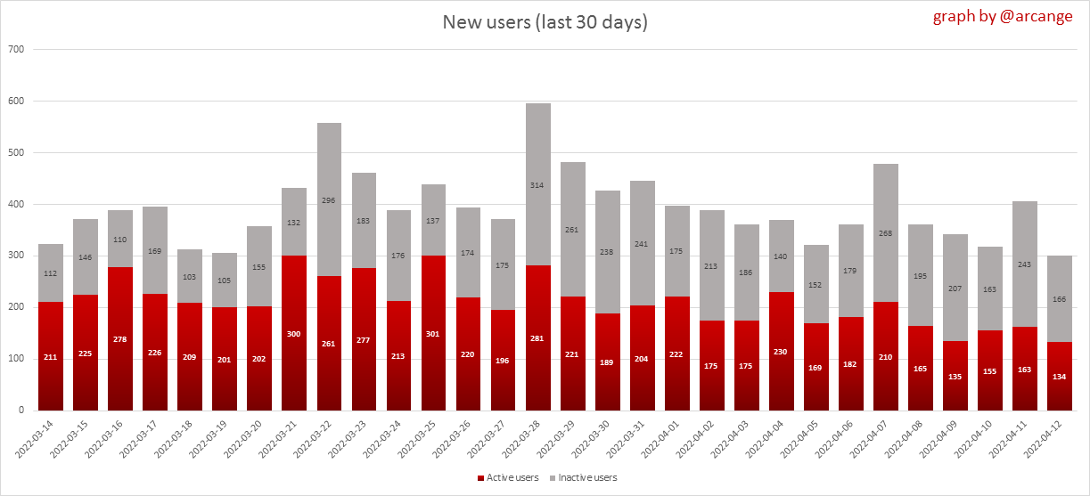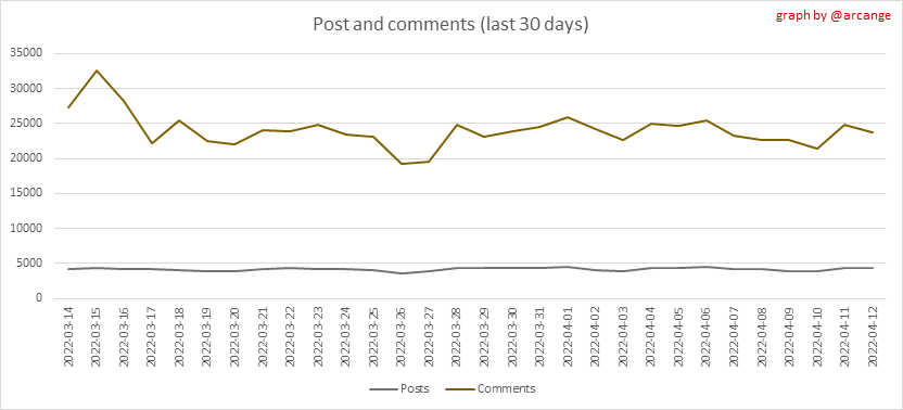<center></center> ### Welcome to the daily analytical report about the Hive blockchain. All the information presented in this report is based on the data collected from the blockchain until 2022-04-12 midnight UTC. This report aims to provide you with a clear view of what is happening on the Hive blockchain. <sub> Este post está traducido al español - [aquí](/@arcange-es/hive-statistics-20220412-es)</sub> <sub> Dieser Beitrag ist ins Deutsche übersetzt - [hier](/@arcange-de/hive-statistics-20220412-de)</sub> <sub> Une version en français de ce post est disponible - [ici](/@arcange-fr/hive-statistics-20220412-fr)</sub> ### 1. New users  This chart shows the number of newly registered users on the blockchain and how many of them became active. The chart is kind of dynamic! A user can register one day and become active a few days later. Therefore, the number of active users on a specific date may change from day to day. ||| |-|-| ||| These two graphs show who created new accounts during the last day and the total number of registered accounts. The red line shows how many of them have been active at least once (active meaning publishing a post, commenting or voting). They are included even if they become inactive later. ### 2. Active users ||| |-|-| |||  These graphs show the activity of users over time and in more detail the last 30 days. In these graphs, "active users" are those performing any type of transaction on the blockchain. The last graph is a monthly summary of the active users. Be careful when interpreting the value of the last column which can be much lower if the end of the month has not yet been reached. ### 3. Apps & (d)Apps  This graph shows which applications are most used to publish posts and comments. Please note that the same user can use several different applications.  This graph shows which applications generate the most activity (custom_json operations) on the blockchain. ### 4. Posts And comments ||| |-|-| ||| These graphs show the evolution of posts and comments for the whole blockchain lifetime and the last 30 days. ### 5. Curation ||| |-|-| ||| These graphs show the evolution of curation (upvotes) for the whole blockchain lifetime and the last 30 days. ### 6. Daily transactions  |||| |-|-|-| |||| These graphs show the number of transactions per day, and the highest number of transactions per block, the average number of transactions per block, and the number of transactions per block for the last 48 hours. This gives you an idea of the whole activity on the blockchain.  This graph shows the distribution of the top 10 types of transactions by number of operations performed on the blockchain. ### 7. Communities and Tags  This graph shows the communities with the most subscribers. ||| |-|-| ||| These graphs show the most active communities by number of posts (blockchain lifetime and last day). ||| |-|-| ||| These graphs show which main tags have been the most used for publishing posts for the whole blockchain lifetime and the last day. ### 8. Distribution |||||| |:-:|:-:|:-:|:-:|:-:| |||||| |<sub>< ~545 HP</sub>|<sub>>= ~545 HP</sub>|<sub>>= ~5450 HP</sub>|<sub>>= ~54499 HP</sub>|<sub>>= ~544985 HP</sub>| ||| |-|-| ||| These graphs show the number of users according to their Hive Power. The left graph shows the distribution without taking into account any delegation made or received by the accounts. The right graph takes into account delegation, adds received HP delegation and subtracts given HP delegation. The grey part of each column indicates how many accounts are inactive (those who have not posted, commented or voted the last 30 days). ||| |-|-| ||| This graph shows the distribution of Hive Power cumulated per account level. The left graph shows the distribution without taking into account any delegation made or received by the accounts. The right graphs take into account delegation, adds received HP delegation and subtracts given HP delegation. The grey part of each column indicates unused Hive Power by inactive accounts (see above the definition of inactive). Below each column, you will also see a ratio to all existing Hive Power. ### 9. Payouts  This graph shows the highest reward paid on a post (or comment) for the last 30 days. ||| |-|-| ||| These graphs show the total of the distributed payout (posts and comments) for each day. ||| |-|-| ||| These graphs show the average and median payout per post for the last 30 days. --- I hope you find those stats useful. If you would like to see additional stats, feel free to drop me a comment. Your feedback is welcome. Thanks for reading. --- <center> ### Check out my apps and services <a href="/hive/@hive.engage/stay-connected-with-your-hive-audience-and-catch-attention"><img src="https://i.imgur.com/GiNJqlm.png"></a><a href="/@hivebuzz"><img src="https://i.imgur.com/B4UTun2.png"></a><a href="/@hivesql"><img src="https://i.imgur.com/EPN8RW6.png"></a><a href="/hive/@arcange/introducing-hive-account-recovery"><img src="https://i.imgur.com/6TWeW7V.png"></a><a href="/@hive.autoclaim"><img src="https://i.imgur.com/ih2pEOw.png"></a></center> <center> ### [Vote for me as a witness ](https://hivesigner.com/sign/account-witness-vote?witness=arcange&approve=1) </center>