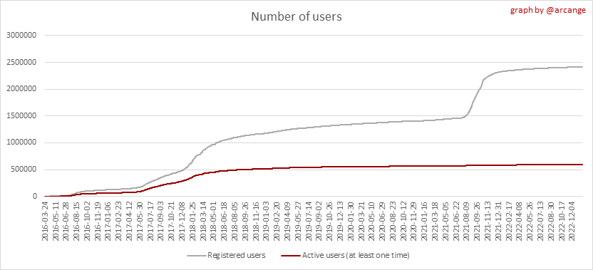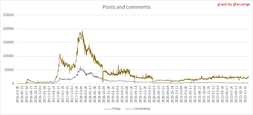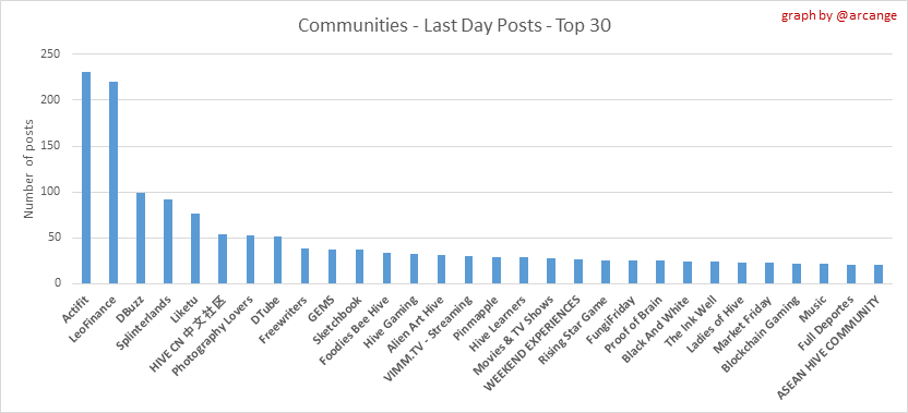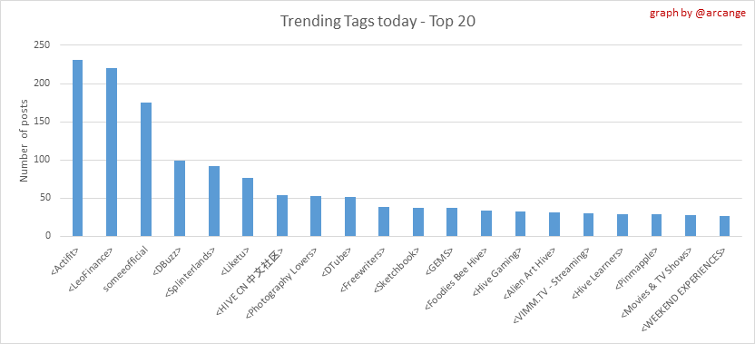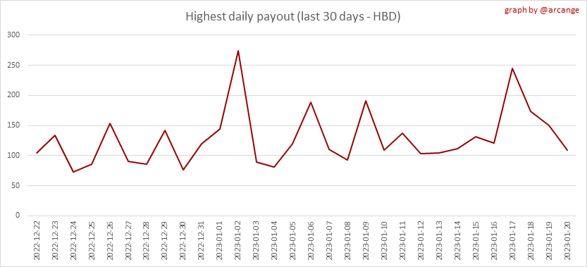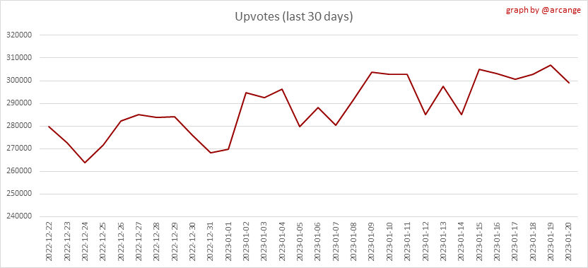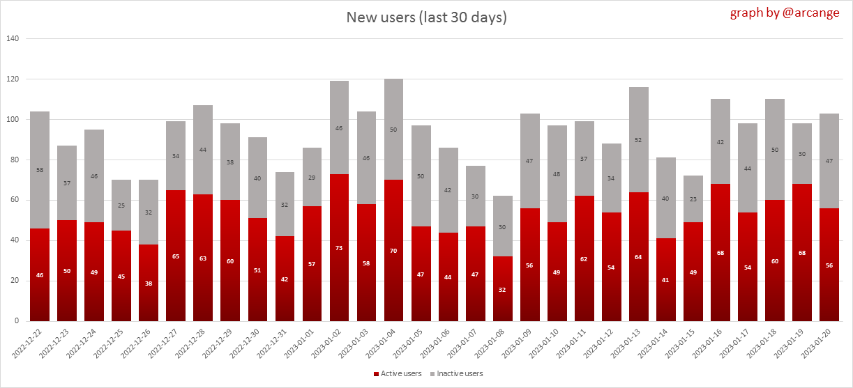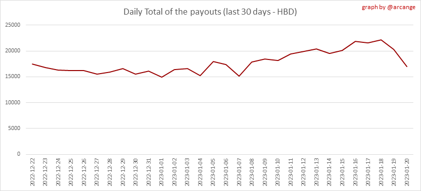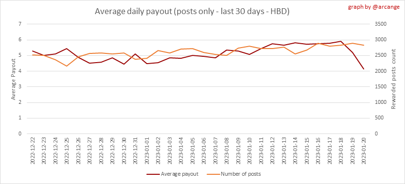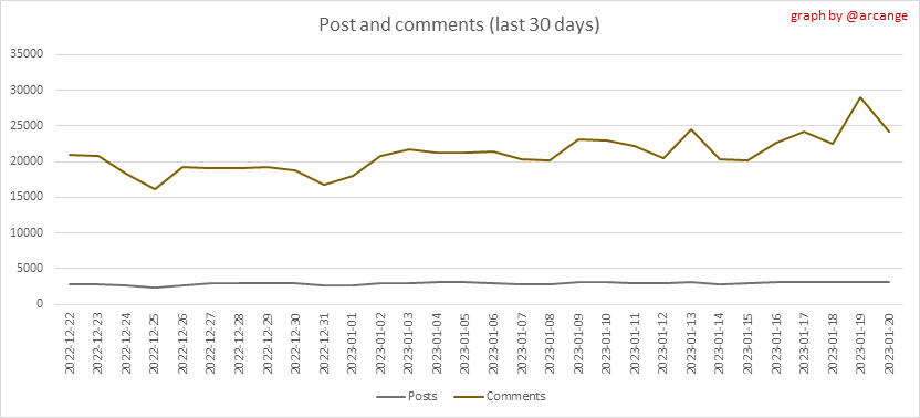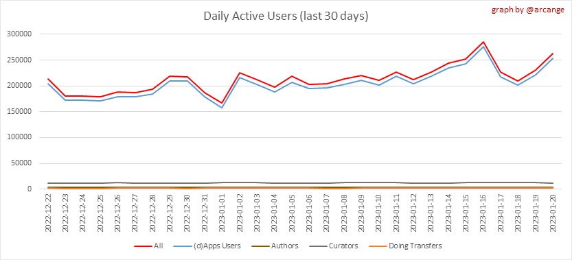 <center></center> ### Welcome to the daily analytical report about the Hive blockchain. All the information presented in this report is based on the data collected from the blockchain until 2023-01-20 midnight UTC. This report aims to provide you with a clear view of what is happening on the Hive blockchain. <sub> Este post está traducido al español - [aquí](/@arcange-es/hive-statistics-20230120-es)</sub> <sub> Dieser Beitrag ist ins Deutsche übersetzt - [hier](/@arcange-de/hive-statistics-20230120-de)</sub> <sub> Une version en français de ce post est disponible - [ici](/@arcange-fr/hive-statistics-20230120-fr)</sub> ### 1. New users  This chart shows the number of newly registered users on the blockchain and how many of them became active. The chart is kind of dynamic! A user can register one day and become active a few days later. Therefore, the number of active users on a specific date may change from day to day. ||| |-|-| ||| These two graphs show who created new accounts during the last day and the total number of registered accounts. The red line shows how many of them have been active at least once (active meaning publishing a post, commenting or voting). They are included even if they become inactive later. ### 2. Active users ||| |-|-| |||  These graphs show the activity of users over time and in more detail the last 30 days. In these graphs, "active users" are those performing any type of transaction on the blockchain. The last graph is a monthly summary of the active users. Be careful when interpreting the value of the last column which can be much lower if the end of the month has not yet been reached. ### 3. Apps & (d)Apps  This graph shows which applications are most used to publish posts and comments. Please note that the same user can use several different applications.  This graph shows which applications generate the most activity (custom_json operations) on the blockchain. ### 4. Posts And comments ||| |-|-| ||| These graphs show the evolution of posts and comments for the whole blockchain lifetime and the last 30 days. ### 5. Curation ||| |-|-| ||| These graphs show the evolution of curation (upvotes) for the whole blockchain lifetime and the last 30 days. ### 6. Daily transactions  |||| |-|-|-| |||| These graphs show the number of transactions per day, and the highest number of transactions per block, the average number of transactions per block, and the number of transactions per block for the last 48 hours. This gives you an idea of the whole activity on the blockchain.  This graph shows the distribution of the top 10 types of transactions by number of operations performed on the blockchain. ### 7. Communities and Tags  This graph shows the communities with the most subscribers. ||| |-|-| ||| These graphs show the most active communities by number of posts (blockchain lifetime and last day). ||| |-|-| ||| These graphs show which main tags have been the most used for publishing posts for the whole blockchain lifetime and the last day. ### 8. Distribution |||||| |:-:|:-:|:-:|:-:|:-:| |||||| |<sub>< ~558 HP</sub>|<sub>>= ~558 HP</sub>|<sub>>= ~5575 HP</sub>|<sub>>= ~55746 HP</sub>|<sub>>= ~557453 HP</sub>| ||| |-|-| ||| These graphs show the number of users according to their Hive Power. The left graph shows the distribution without taking into account any delegation made or received by the accounts. The right graph takes into account delegation, adds received HP delegation and subtracts given HP delegation. The grey part of each column indicates how many accounts are inactive (those who have not posted, commented or voted the last 30 days). ||| |-|-| ||| This graph shows the distribution of Hive Power cumulated per account level. The left graph shows the distribution without taking into account any delegation made or received by the accounts. The right graphs take into account delegation, adds received HP delegation and subtracts given HP delegation. The grey part of each column indicates unused Hive Power by inactive accounts (see above the definition of inactive). Below each column, you will also see a ratio to all existing Hive Power. ### 9. Payouts  This graph shows the highest reward paid on a post (or comment) for the last 30 days. ||| |-|-| ||| These graphs show the total of the distributed payout (posts and comments) for each day. ||| |-|-| ||| These graphs show the average and median payout per post for the last 30 days. --- I hope you find those stats useful. If you would like to see additional stats, feel free to drop me a comment. Your feedback is welcome. Thanks for reading. --- <center> ### Check out my apps and services <a href="https://engage.hivechain.app"><img src="https://i.imgur.com/GiNJqlm.png"></a><a href="/@hivebuzz"><img src="https://i.imgur.com/B4UTun2.png"></a><a href="/@hivesql"><img src="https://i.imgur.com/EPN8RW6.png"></a><a href="https://hiveauth.com"><img src="https://i.imgur.com/2Ws6KzW.png"></a><a href="/hive/@arcange/introducing-hive-account-recovery"><img src="https://i.imgur.com/6TWeW7V.png"></a><a href="/@hive.autoclaim"><img src="https://i.imgur.com/ih2pEOw.png"></a></center> </center> <center> ### [Vote for me as a witness ](https://vote.hive.uno/@arcange) </center>