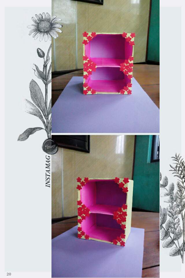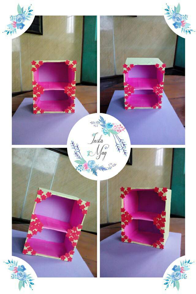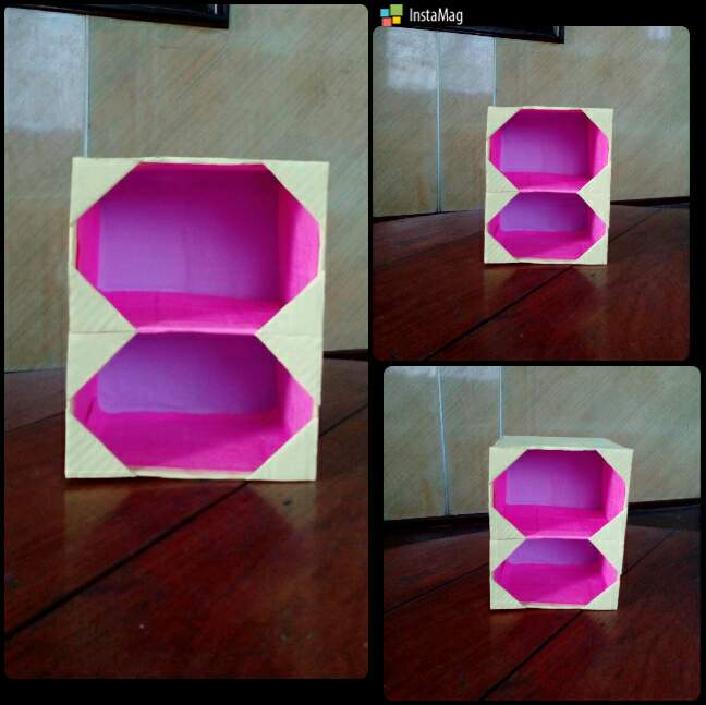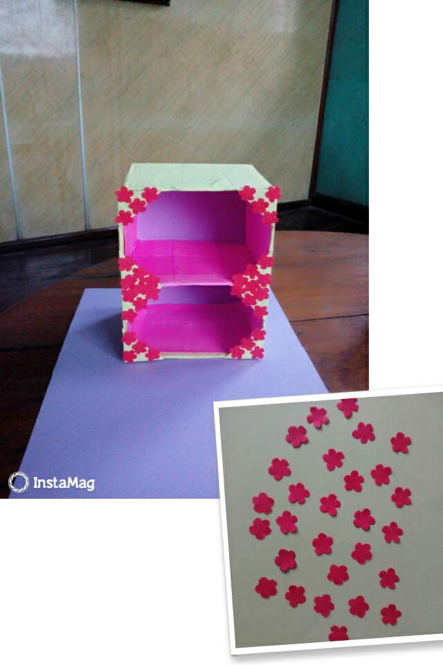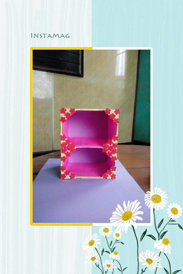 ဒီတစ္ခါမွာေတာ့ကတ္ထူစကၠဴ၊ေရာင္စံုစာရြက္၊ေကာ္၊ကတ္ေၾကးတို႔ကိုအသံုးျပဳ၍၊paper boxတစ္ခုျပဳလုပ္ထားပါတယ္။ႏွစ္ထပ္ပံုစံေလးပါ။ပန္းပြင့္မ်ားျဖင့္အလွဆင္ထားပါတယ္။   ပထမအဆင့္မွာေတာ့ကတ္ထူဘူးအႀကီးတစ္ခုကို႐ွာၿပီး၊အဖံုးေတြကိုျဖတ္မယ္။ၿပီးေနာက္အ၀ါႏွင့္ပန္းေရာင္စာရြက္ေတြႏွင့္ပံုပါအတိုင္းေကာ္ကပ္ထားပါတယ္။ႏွစ္ထပ္ပံုစံျဖစ္ေအာင္အျခားကတ္ထူတစ္ခုကိုတိုင္းတာ၍ျဖတ္ၿပီး၊ပန္းေရာင္စာရြက္ေကာ္ကပ္ကာ၊ဘူးခြံရဲ႕အလယ္မွာေကာ္ကပ္ထားလိုက္ပါတယ္။ၿပီးေနာက္ႀတိဂံပံုစံကတ္ထူေလးေတြျဖတ္လိုက္ပါ့မယ္။အရြယ္တူစုစုေပါင္း၈ခုလိုအပ္ပါတယ္။ထိုအရြယ္တူကတ္ထူမ်ားကိုေတာ့အ၀ါေရာင္စာရြက္ေကာ္ကပ္ပါတယ္။ၿပီးေနာက္ေထာင့္စြန္းေတြမွာပံုပါအတိုင္းညီညာစြာေကာ္ကပ္လိုက္ပါတယ္။    ဆက္လက္ၿပီးအနီေရာင္ပန္းပြင့္မ်ားျပဳလုပ္ထားပါတယ္။ျပဳလုပ္နည္းကလြယ္ကူလ်င္ျမန္ေစရန္၊ပန္းပြင့္တစ္ခုကိုပံုဆြဲ၍ျဖတ္ၿပီး၊ထိုပန္းပြင့္ပံုစံအတိုင္း၊တူညီတဲ့အနီေရာင္ပန္းပြင့္မ်ားျပဳလုပ္လိုက္တာပါ။ပန္းပြင့့္မ်ားကိုလည္းအ၀ါေရာင္ကတ္ထူေလးေတြေပၚပံုပါအတိုင္းေကာ္ကပ္ပါတယ္။    Written by @asterkame MSC-008 By my photos & made by me