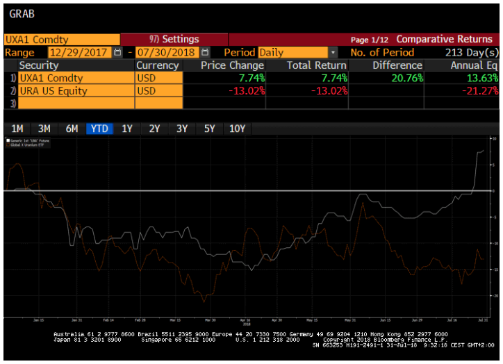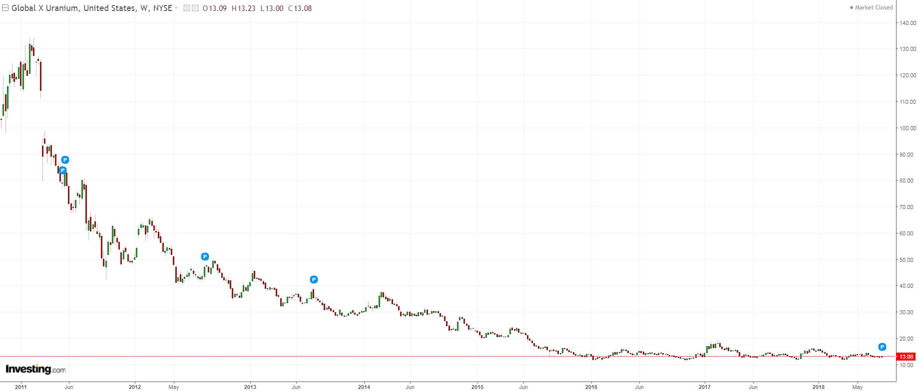 Desde el desastre de Fukushima el uranio ha sido un activo totalmente castigado por el mercado pero algo parece estar cambiando en los últimos meses. En el siguiente gráfico podéis ver cómo el uranio se ha revalorizado más de un 25% desde el mes de Abril. Sin embargo las mineras de uranio se están quedando bastante atrás por lo que podría ser buen momento para apostar por este tipo de activo.  En el siguiente gráfico se puede ver el castigo que ha sufrido el ETF de mineras de Uranio que viene de cotizar por encima de los 140 USD hasta los 13 USD de su cotización actual.  En el siguente link (https://www.caseyresearch.com/why-this-bad-news-could-cause-uranium-stocks-to-soar/) podéis leer un artículo de Casey Research que explica perfectamente cómo los fuertes recortes de producción que están ejecutando las principales mineras de uranio generarán un déficit de este activo durante los próximos pudiendo impactar muy positivamente en el precio del Uranio. Un saludo, @ayusor
