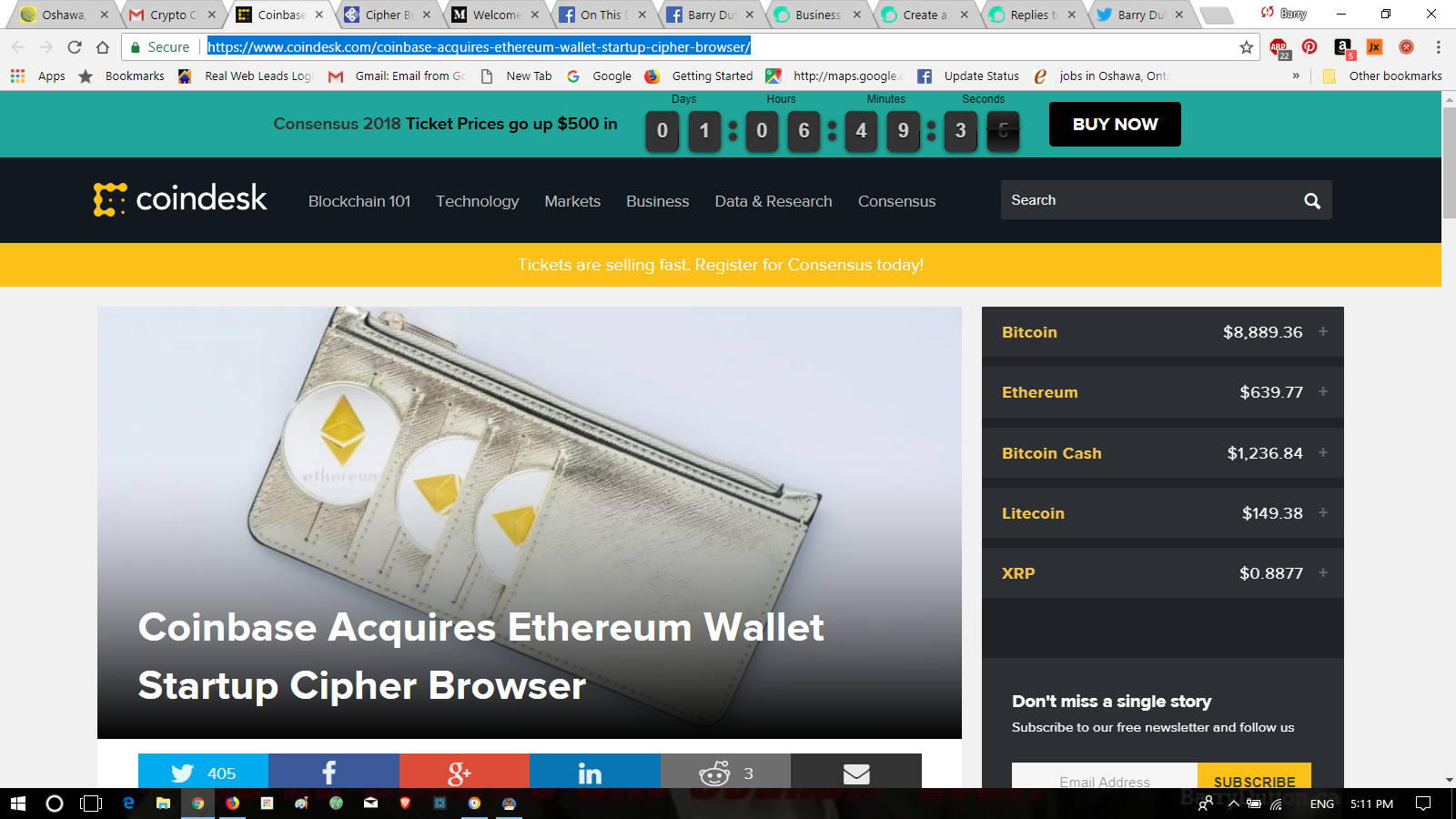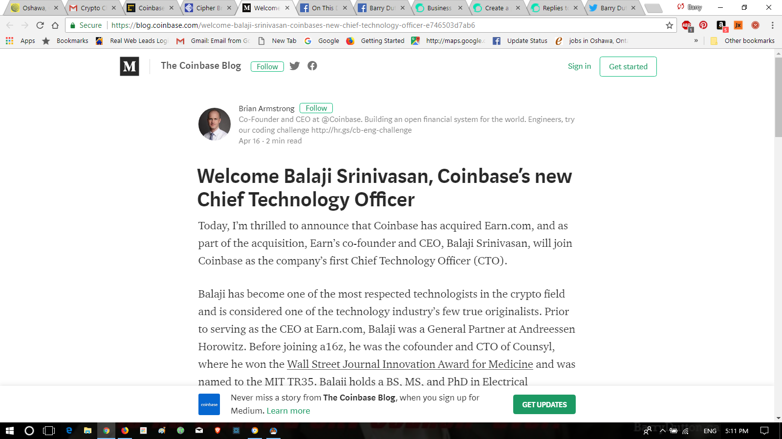 https://steemitimages.com/DQmNpircR1WV5Xp3toTnATwLcvgpTNF5ZyASP3wDvTD1m7V/image.png The first acquisition was Cipher, the mobile blockchain browser competing with Coinbase-backed Toshi.  Cipher’s founder, Peter Kim, will become the engineering lead at Toshi and Cipher’s features will be merged with Toshi. The terms of the acquisition have not been disclosed.  The second acquisition is Earn.com, with the deal size rumoured to be in excess of $100m. Earn.com, which recently rebranded from 21.co, allows users to receive Bitcoin in exchange for emails from people outside their network. As part of the deal, Earn.com founder, Balaji Srinivasan, a former GP at Andreesen Horowitz, will become CTO of Coinbase.  ---- Sources: https://www.coindesk.com/coinbase-acquires-ethereum-wallet-startup-cipher-browser/ https://www.cipherbrowser.com/ https://blog.coinbase.com/welcome-balaji-srinivasan-coinbases-new-chief-technology-officer-e746503d7ab6 ---- Thanks for Reading! https://steemitimages.com/DQmeMsokLJHgvoqfQt44Zy7Kvmvjr68x51nGqfrtm65zqoe/image.png