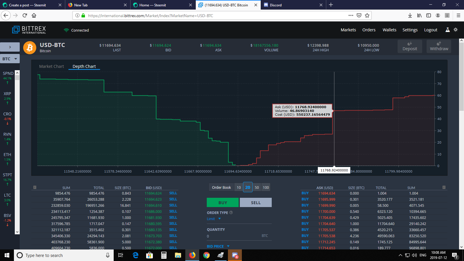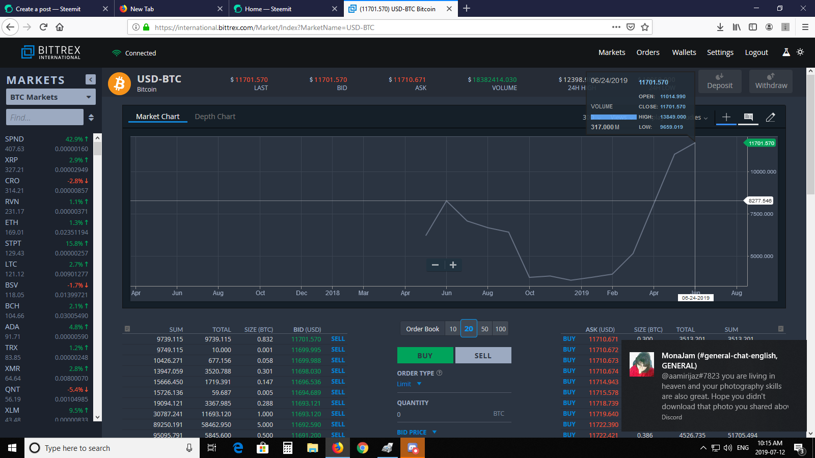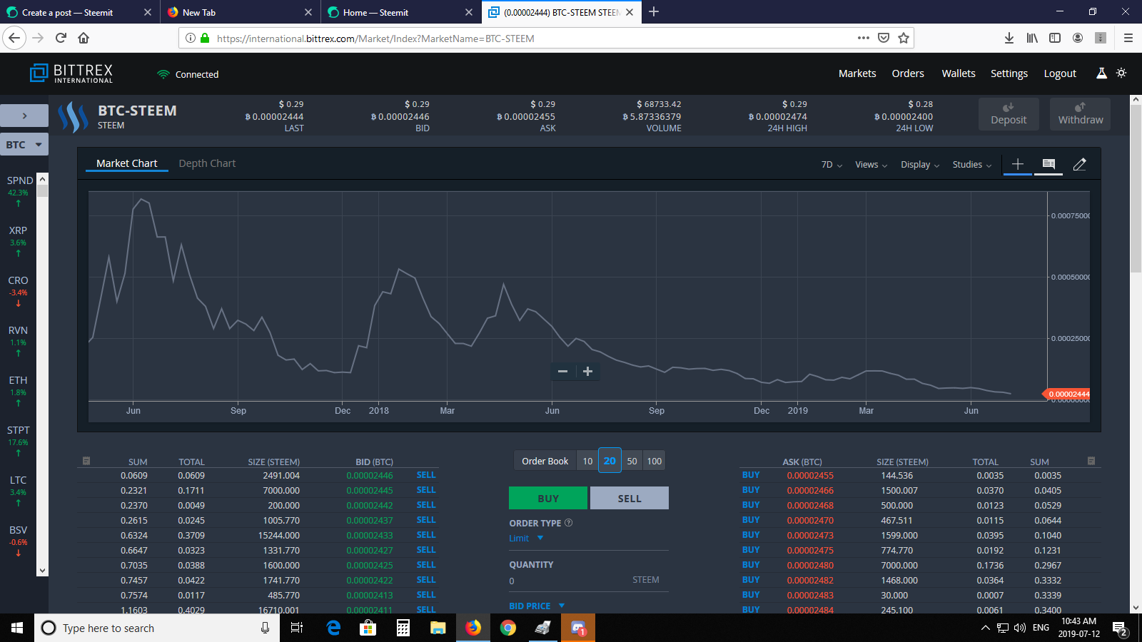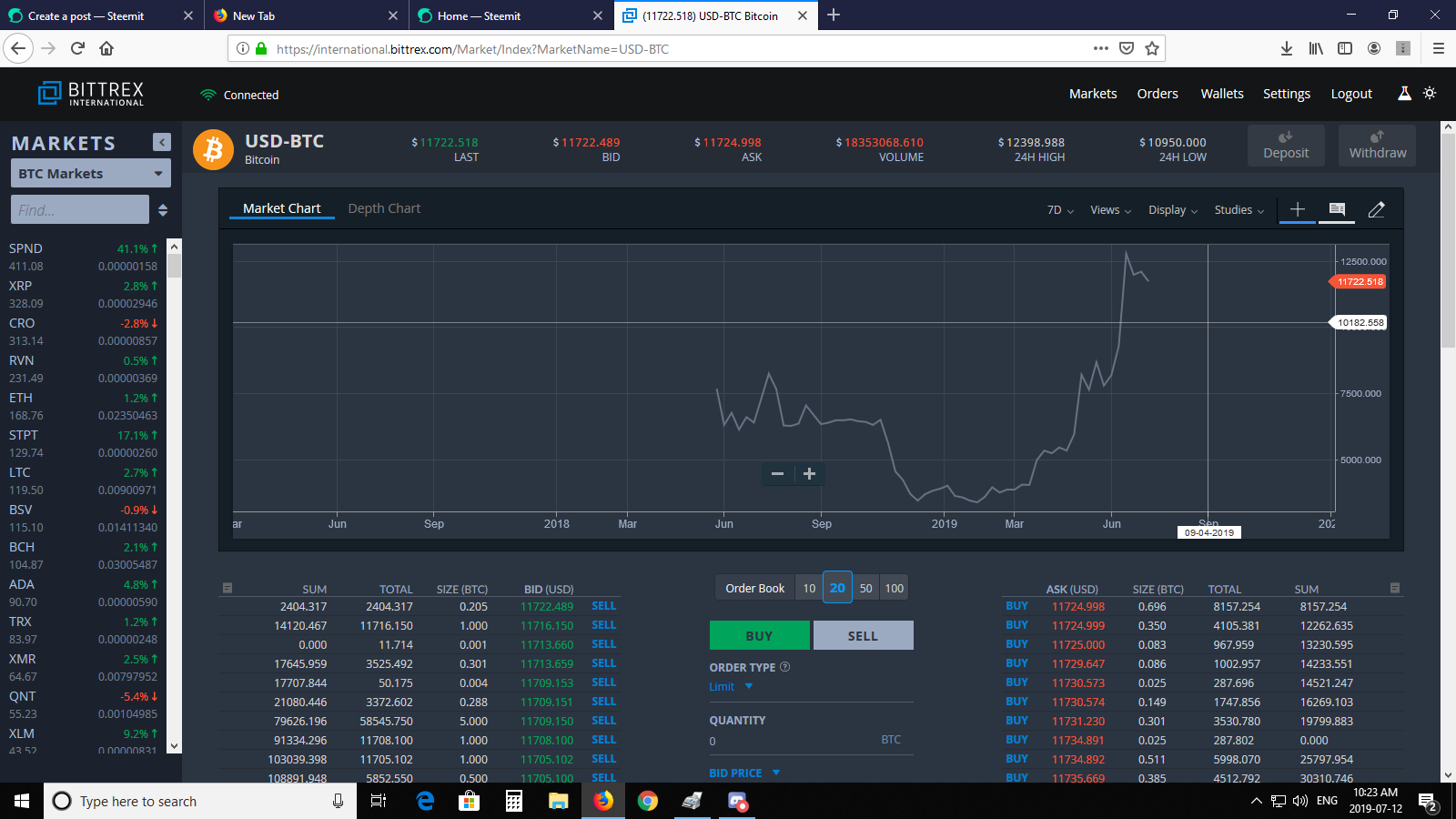 It might not be our favorite exchange, but I have made a shit load of money using their interface so lets dive right in before it's the weekend (not that trading stops during the weekend). I wasn't so confident posting about trading because I was commenting with some high rollers who have made a lot more crypto than me.. @edicted ;) but I have to say my analysis was SPOT on (late by a 2 days). Perhaps the rally is starting again but I eloquently called exactly what was going to happen this week to MAKE MOAR crypto. Did I do it? Hell no because I'm DRY. I have a family and I can't be going gambling their money if I need it to put food on the table. I'm not a young Teenage or Twenty something guy who can put it all on the line. Remember we are talking 10,000's of thousands of dollars. I prefer buying Gold and Silver and letting it collect dust for 20 years. I'm confident it will keep up with inflation. When I am loaded with tokens I follow my own advice. I don't need to say one thing and do another; unless there is some type of flash crash.  Right now using Bittrex exchange there's more buying than selling..10:11 am ET Checking 30 moving average past year:  $8200 was the top last year to date.  Sometimes data looks VERY different. Here is the 7 day moving average over a year. Because BTC is so speculative I like to collect data with smaller window of change. Anything can happen within a second, but a week is good for my data collection. When I day-trade I go for the smallest windows of change, middle window, and long. Then I make my decision. I have also learned to NEVER buy the news; but sell it.  Our waves generally follow in 5 bursts upward each time dropping slightly; or even correcting 30-50% for a retrace. To me on the 7 day it looks as though we have had perhaps 3 waves and at this moment having some consolidation (which means it's probably going to drop to $10,500). When will this happen? Probably next week! Right now we are sitting at $11,715! I am anticipating that drop. Remember when BTC was at 18,000? Well it was EASY to call the top. This isn't the top right now IMO. That's when things get dicey again. Now it's important to realize that when trading things happen un-related to BTC, but can certainly effect it's price. For instance, this article here could have changed some long term outlooks for some traders: https://markets.businessinsider.com/currencies/news/trump-rant-bitcoin-crypto-called-archaic-by-devere-nigel-green-2019-7-1028348749 On Thursday President Trump tweeted that he "was not a fan of Bitcoin and other cryptocurrencies, which are not money, and whose value is highly volatile and based on thin air." So there you go. It's not like mortgages and money creation are not created out of thin air LOL! Trump isn't stupid; his baby is in the dollar like most other wealthy Americans. Plus what is more patriotic than believing in your imaginary bank notes created out of 'thin air' but I digress.. STEEM Oh boy this is more than enough to give me heart burn.. So let's dive right in.  On the 7 day moving average it's FREAKING DEPRESSING.. The 30 day is basically showing me the same data.. All I can tell you is that we are probably going to hit some lows. There is no news to sell, even though STEEM-ENGINE and our new tribes are a success. Perhaps our new tribes will be the ones to create the NEWS. I wish I had more to talk about with STEEM but it's BEARISH.. bearbear-ish. I'll move on quickly from that. We all know what needs to happen with STEEM. I have tried my best to on-load people; but crypto is still young in people's minds. Mass adoption is difficult when there is a learning curve. It was daunting for me at first. I was determined to learn it, get on exchanges, and get something physical from my blogging. It took me a good year of time to do that! I make a hell of a lot more money in my career than blogging and trading. That is a past time for me. If STEEM ever exploded in price, I would still have to stick to my career. In any case, I wish you all happy trading. If you find my analysis to be poor; please let me know in the comments section. I have room to LEARN and to GROW! See you; even if STEEM drops to 0.18 cents ;)