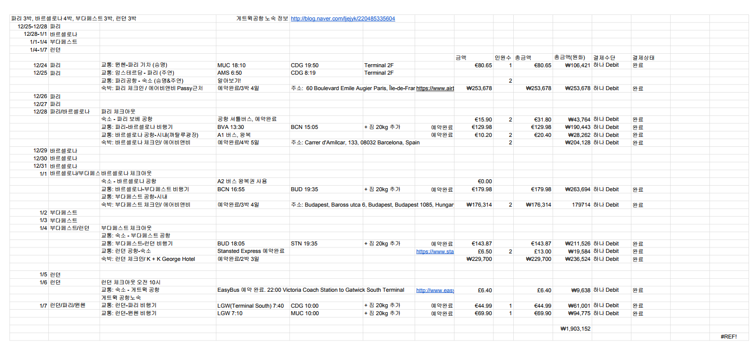<center>  ▲ 시작은 제 사진과 함께^^! 안녕하세요 @brianyang0912 입니다. 지루하려면 지루했을 법한 여행기였다는 것을 알지만, 많은 분들이 재미있게 읽어주셔서 정말 큰 힘이 되었고, 여행을 하는건지, 스팀잇을 하기위해 여행을 하는건지 헷깔릴 정도로 그런 시간을 보냈던 것 같습니다. 스팀잇에서 이런저런 일들을 진행하면서, 스팀잇에 투자하는 시간이 많아 졌고, 이에따라 여행 동반자였던 @jupal2가 고생을 많이 했죠. 스팀잇이 일상이 되면서, 얻는 것들도 많지만, 적지않게 빼앗기는 것도 많은 듯한 생각이 들었던 여행이었던 것 같습니다. 저도 이제 스팀잇에 입문한지 3개월차, 3개월 전만해도 스팀잇엔 이렇게 많은 분들이 안계셨던 것 같습니다 하지만 지금은 매일매일 더 많은 뉴비분들이 유입되고 있다는 것을 알고있는데요, 조만간, 뉴비분들께 하고싶은 이야기도 한번 해보겠습니다 --- #### 여행 총 경비 # 1人 기준 약 200만원씩 쓴 것 같습니다. 숙박, 교통, 항공권을 포함한 가격이며, 절때 부족하거나 하지 않았던 금액이었습니다. 저가항공사를 통해 국가를 이동하면서 시간과 돈을 절약했고, 호텔보단 에어비앤비를 선호하면서 숙박비를 아꼈습니다. 늦잠자서 아침을 먹지 못해 늦은 아점을 먹었고, 결국 하루 두끼를 먹었지만, 제대로 먹었다고 생각합니다. 때론 기념품도 샀고, 가지고 싶은 것도 위에 금액에서 썼습니다. 유럽에 가기 전에 이미 200만원이라는 금액을 썼습니다.  (위 자료가 필요하시다면 말씀해주세요) #### 교통편 # 저는 사실 독일에서 시작한 여행이라 항공권에 대한 큰 부담은 없었습니다. 대부분 저가항공사를 이용했고, 독일-프랑스 갈때만 프랑스 국적기인 Air France를 이용했습니다. 짐 20kg 까지 포함해 가격이 약 8만원, 나머지 저가항공사를 이용했을땐, 5~7만원에 교통을 해결했습니다. 짐 추가시 (20kg 기준) 20~25유로 (3~4만원)가 추가됩니다 @jupal2 케이스는 스카이스캐너를 통해 여행 4개월 전 미리 비행기표를 예매하였고, 59만원이라는 금액으로 인천-파리 왕복항공권을 끊었습니다. `파리에선 나비고 카드를 썼습니다` 일~월요일까지 무제한으로 쓸 수 있는 카드이며, 시내-공항구간도 이용이 가능합니다. 가격은 약 1人 22.8 (약 3만원)유로 였습니다 (주의사항, 나비고 카드를 쓰려면 본인 사진을 부착해야 합니다) <center>  ▲ 프랑스 나비고 교통권 </center> `바르셀로나에선 T-10 카드를 썼습니다` 10장 묶음의 교통권이 9.9유로 (13000원), 한장의 카드로 여러명이 쓸 수 있습니다. 제가 먼저 들어가고, 같은 티켓을 일행이 다시 재사용 할 수 있는 구조입니다 쓸때마다 10번에서 사용가능 횟수가 깎이며, 뒷면에 마지막 숫자를 보면 확인가능합니다. (공항이동시 A1, A2 버스를 이용해야하며 가격은 편도 5유로 (6500원) <center>  ▲ 바르셀로나 T-10 교통권 </center> `부다페스트에선 1일권 교통티켓을 이용했는데요`, 약 7천원을 내면, 24시간동안 무제한 대중교통이용이 가능했습니다. 만약 편도티켓을 구매시 약 1,200원 정도의 가격이 부과되는 것을 생각하면, 하루권을 끊고 마음껏 돌아다니는 것도 좋은 전략인 것 같습니다. (공항까지 이동은 포함이 안되며, 공항이동시 900포린트 (3800원) <center>  ▲ 부다페스트의 1일 패스, 날짜 시간이 명확하게 나와있다. </center> `영국에선 오이스터카드를 이용했습니다.` 오이스터카드는 보증금 5파운드를 내고, 충전해서 쓸 수 있는 카드인데요, 좋은 점은 하루 교통이용이 6.5 파운드가 넘어가면 더이상 요금이 과금되지 않습니다. 즉, 6.5 파운드 이상타면 그다음부턴 무료라는 거죠! 단, 바쁜 출근시간이나 퇴근시간에는 적용되지 않습니다. <center>  ▲ 영국의 오이스터 교통카드 `제 생각에 유럽여행을 하신다면, 2인 기준 요렇게 교통권을 끊어서 여행하시는게 가장 저렴한 것 같습니다` ##### 그리고 유레일 패스를 끊으시는 분들이 계신데요 전 개인적으로 비추입니다 버스나, 저가 항공사를 통해 여행하는 편이 시간적인 면이나, 비용면을 많이 아낄 수 있죠. 각 도시마다 저가항공사가 취항하는 도시들이 있습니다. 그곳을 활용해서 이동을 하면, 정말 저렴하게 이동할 수 있습니다. 예를들어 설명드릴게요! 런던의 히드로 공항과 런던의 게트윅 공항, 스텐스테드 등의 여러 작은 공항들이 있습니다. 히드로 공항은 굵직한 항공사과 저가항공사가 동시에 취항하고, 나머지 항공사들은 대부분 저가항공사 위주로 취항하고 있습니다.  위와 같이 런던 히드로공항을 "선택" 한 후 항공권을 검색하면, 최소 5만원짜리 편도항공권이 나옵니다.  하지만, 런던 스탠스테드공항을 "선택" 한 후 항공권을 검색하면, 최소 1만원대에서 항공권을 구매가능합니다. 1만원 대면, 여튼 버스나 기차보다 훨씬 저렴한 가격에 항공권을 구매할 수 있죠. --- 하지만 1만원대의 가격의 항공권은 대부분 저가항공사의 티켓입니다. Easy Jet, Vueling, Ryanair 같은 저가항공사는 초저가 항공권을 제공해줍니다. 하지만, 스카이스캐너에선 저가항공사 위주로 검색이 안됩니다. 그러므로, 이럴땐 직접 항공사 어플리케이션을 이용하시길 추천해드립니다. Ryanair 의 어플리케이션 예시를 보면,  바르셀로나 