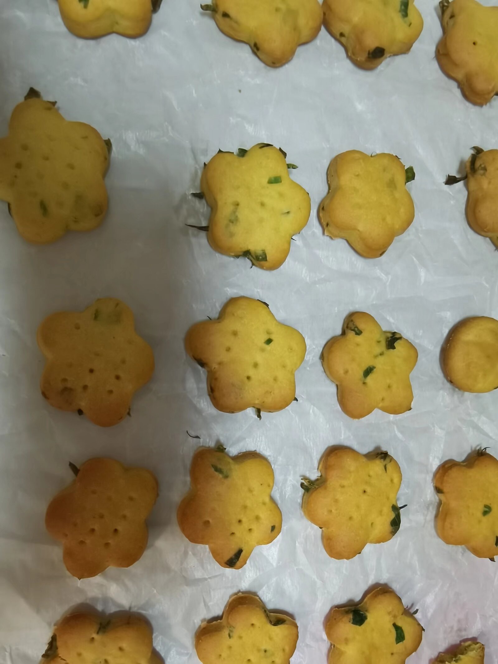 前几天做完了粗粮燕麦小饼干后,竟然来了兴致,一下不可收拾,今天给大家展示的是这个香葱玉米饼干,里面加了豆面,还有椒盐,香葱,酥脆好吃,是另外一种风味。 材料: 2个鸡蛋,低筋粉200克,玉米粉50克,豆面50克,酵母3克,小苏打3克,玉米油20克,椒盐,香葱叶一把 做法: 1. 将香葱叶洗净,切碎,备用。 2. 将鸡蛋,面粉,玉米粉,豆面,酵母,小苏打,包括香葱叶,玉米油,混合揉成面团,稍微醒发10分钟。 3. 将面团擀成饼状,然后撒上椒盐,折叠,再擀成饼,反复三次。 4 用磨具按压形状,摆上烤盘。 5. 烤箱170度,烤 25分钟。 酥脆的小饼干就做成啦!      这个小饼干因为加入了酵母和小苏打,烘烤的过程中会膨胀,凉了之后,就非常酥脆了,因为有椒盐和葱花,所以有股葱花和椒盐的咸香,烤熟了满屋都是葱花的香味呢。可以做减肥代餐,也可以平时当小零食,解馋吃,是个非常健康又美味的小零食。不喜欢甜食,怕发胖的小伙伴们,可以试着做做,保管你喜欢哦!