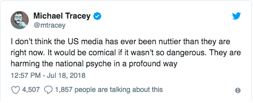 The last few days have been truly amazing. I didn't even write an article yesterday; I've just been staring transfixed by my social media feeds watching liberal Americans completely lose their minds. I can't look away. It's like watching a slow motion train wreck, and everyone on the train is <a href="https://twitter.com/ggreenwald/status/1019695801382129664">being really homophobic</a>. I've been writing about Russiagate since it started, and I can honestly say this is the worst it's ever been, by far. The most hysterical, the most shrill, the most emotional, the most cartoonishly over-the-top and hyperbolic. The fact that Trump met with Putin in private and then publicly expressed doubt about the establishment Russia narrative has sent some political factions of America into an emotional state that is indistinguishable from what you'd expect if Russia had bombed New York City. This despite the fact that the establishment Russia narrative consists of no actual, visible events whatsoever. It is made of pure narrative.  I don't even know where to start. Everyone has been completely mad across the entire spectrum of what passes for America's political "left" today, from the usual suspects like Chuck Schumer and Nancy Pelosi and their indistinguishable Never-Trump Republican allies, all the way to supposedly progressive commentators like Cenk Uygur and Shaun King. Comparing this pure narrative non-event to Pearl Harbor is now commonplace and mainstream. I just watched a United States Senator named Richard Blumenthal stare right into the camera refer to the hypothetical possibility of future Russian cyber intrusions as "this 9/11 moment." "We are in a 9/11 national emergency because our country is under attack, literally," Blumenthal <a href="http://edition.cnn.com/TRANSCRIPTS/1807/18/nday.04.html">told CNN</a> while demanding a record of Trump's meeting with Putin at the Helsinki summit. "That attack is ongoing and pervasive, verified by objective and verifiable evidence. Those words are, again, from the director of National Security. And this 9/11 moment demands that we do come together." Nothing about the establishment Russia narrative is in any way verifiable, and the only thing it has in common with 9/11 is the media coverage and widespread emotional response. September 11 had actual video footage of falling towers. You could go visit New York City, look at the spot where those towers used to be, and see them not being there anymore. You could learn the names of the people who died and visit their graves and talk to their family members. Exactly <em>how</em> it happened is a matter of some debate in many circles, but there is no question that it happened. There was an actual event that did happen in the real world, completely independent of any stories people tell about that event. Russiagate is like 9/11, but with none of those things. It's like if 9/11 had all the same widespread emotional responses, all the same nonstop mass media coverage, all the same punditry screaming war, war, war, except no actual event occurred. The towers were still there, everyone was still alive, and nothing actually happened apart from the narrative and the emotional responses to that narrative. Russiagate is 9/11 minus 9/11. https://www.youtube.com/watch?v=Ik_GCY23MfU This is what I'm talking about when I say that <a href="https://medium.com/@caityjohnstone/whoever-controls-the-narrative-controls-the-world-c22e1134e857">whoever controls the narrative controls the world</a>. Whoever controls the stories that westerners are telling each other has the power to advance concrete agendas which reshape global geopolitics without any actual thing even happening. Simply by getting <a href="https://consortiumnews.com/2017/05/23/new-cracks-in-russia-gate-assessment/">a few hand-picked intelligence agents</a> to say something happened in a relatively confident way, you can get the entire media and political body advancing that narrative as unquestionable fact, and from there advance sanctions, new military operations, a far more aggressive Nuclear Posture Review, the casting out of diplomats, the arming of Ukraine, and ultimately shove Russia further and further off the world stage. As <a href="https://medium.com/@caityjohnstone/peace-talk-between-nuclear-superpowers-offends-americas-assholes-and-morons-14158ef5cade">we discussed last time</a>, the current administration has actually been far more aggressive against Russia than the previous administration was, and has worked against Russian interests to a far greater extent. If they wanted to, the international alliance of plutocrats and intelligence/defense agencies could just as easily use their near-total control of the narrative to advance the story that Trump is a dangerous Russia hawk who is imperiling the entire world by inflicting insane escalations against a nuclear superpower. They could elicit the exact same panicked emotional response that they are eliciting right now using the exact same media and the exact same factual situation. They wouldn't have to change a single thing except where they place their emphasis in telling the story. The known facts would all remain exactly as they are; all that would have to change is the narrative. Public support for Russiagate depends on the fact that most people don't recognize how pervasively their day-to-day experience is dominated by narrative. If you are intellectually honest with yourself, you will acknowledge that you think about Russia a lot more now than you did in 2015. Russia hasn't changed any since 2015; all that has changed is the narrative that is being told about it. And yet now the mass media and a huge chunk of rank-and-file America now view it as a major threat and think about it constantly. All they had to do was talk about Russia constantly in a fearful and urgent way, and now US liberals are convinced that Vladimir Putin is an omnipotent world-dominating supervillain who has infiltrated the highe