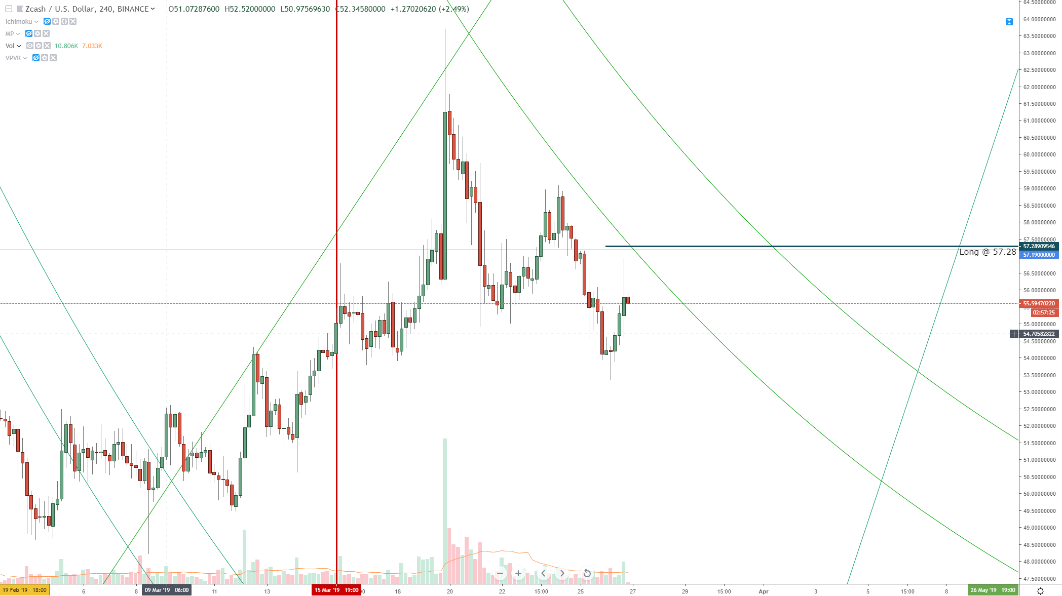 *Last week buy signals were issued for BTC, LTC, BAT, XLM and EOS. We will review those prior signals and then look at some newer buy signals.* Cryptocurrency Buy Signals and Updates Buy Signal Update – Bitcoin (BTC) Last week a trade signal for Bitcoin was announced for an entry at the 3995 target area. The predicted conditions for a buy signal on Bitcoin’s chart was when price broke the 1-hour cloud as well as the 4-hour Kijun Sen. We are trading relatively flat in relation to that entry. Bitcoin is currently trading down -20 bucks from our entry point. Buy Signal Update – Litecoin (LTC) The target area was not hit for an entry (above 60) – no trade initiated. Buy Signal Update – Basic Attention Token (BAT) The entry was when price broke above the 45-degree angle and the 50% Fibonacci arc. Those conditions were met with an entry target of 0.2032. BAT is currently trading around 11% to 12% higher from our entry. Buy Signal Update – Stellar Lumens (XLM) No real changes from the entry point to the current value area – it is almost exactly the same. There was some continued selling pressure over the past 5 days but XLM has regained much of that down move. Buy Signal Update – EOS (EOS) There were two entry targets for EOS; an aggressive entry at 3.69 and a more conservative entry at 4.01. Both of these conditions have been met. From the aggressive entry at 3.69, EOS has gained as much as 13% since the entry. ### Cardano (ADA) Buy Signal  Cardano is the single largest percentage of my cryptocurrency holdings. I’ve been a Cardano bull since their launch. They have also been an extremely fun and profitable trade. It’s hard to understate how powerful the moves ADA has made over the past couple of months. ADA is currently trading at nearly 8-month highs! That’s amazing given the broader market! ADA was one of the most beaten down and abused cryptocurrencies during the bear market, so it makes sense that there is some drastic recovery. The current level Cardano is trading in is the 1/8th Major Harmonic at 0.00001567. This should hold as an extremely powerful support zone. Entry: Any return near the 0.00001567 value area. ### Zcash (ZEC)  Zcash is another very beaten down cryptocurrency. It’s currently the only ‘privacy’ coin offered on Coinbase, but that has not yielded a supportive price action. Currently, ZEC is trading in a bullish continuation pattern called a bull flag. An entry at 57.2989 would put price above the 50% Fibonacci arc and, most importantly, it would break the trend line of the bull flag to see a much larger move higher. Entry: 0.00001567 ### Litecoin (LTC)  The update for the LTC trade from last week yielded a target that was not yet reached. The entry at 61 still appears to be a good zone to tag for a break out above the current congestion as well as a move above the current 45-degree angle. Entry: 61 ### Holochain (HOT)  HOT’s chart has been one of the best performing and outperforming cryptocurrencies since December of 2018. In fact, HOT has moved over +328% from the December 2018 lows. That’s a staggering and powerful sustained move. On the current chart, HOT is displaying some very wide distribution and consolidation. A conservative entry above prior trading highs on the daily chart should yield good results. Entry: 0.0014 ### ICON (ICX)  ICX has had some very bullish moves as well. It has mostly been following the aggregate market in its moves. Like many other crypto charts, the ICX chart is displaying a powerful bull flag. An entry above the most recent high would yield the best results. Entry: 0.000089
