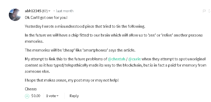 <center><a href='https://d.tube/#!/v/carlgnash/orsc63u4'><img src='https://steemitimages.com/DQmXNRGpsu8J9jciQp2nSNymaJFUPa4i4knKDr7zgAxX77F/The%20Future%20snap3.jpg'></a></center> <hr><a href='https://d.tube/#!/v/carlgnash/orsc63u4'> ▶️ DTube</a><br /><a href='https://ipfs.io/ipfs/QmWiQoJCRbt8893KLjfxD57hjLUq94hGA7t9dbBrFxo5k8'> ▶️ IPFS</a> Steemit collaboration: music by @carlgnash | lyrics by @abh12345 1/2 the SBD payout from this post will be shared with @abh12345  We are entering the home stretch of the Gnash Song Challenge (https://steemit.com/music/@carlgnash/gnash-song-challenge-episode-1-hear-your-words-set-to-music-marvel-at-your-ideas-taking-sonic-flight-wonder-at-the-sheer-beauty) and from here on out we will be entering a brave new frontier of music. The aim is to melt your minds and reassemble as a colony-organism-hive-intelligence. Let me know how it feels in the comments! From the Future Past - @abh12345 reports on the possibility of chips inserted into our brains: <blockquote> Scientists are now confident that in as little as 15 years we will be able to communicate telepathically, delete memories, and install the memories of others on to our own 'Brain-chip'. </blockquote> (https://steemit.com/proofofbrain/@abh12345/proof-of-who-s-brain) Postulating that in such a future, Steem blockchain scammers would plagiarize original thought. @cheetah may have a hard time detecting this, but that is where the communal hive mind we are building today through music comes into play! Once we are hive intelligence such chicanery will be obvious. # The Future - Music by @carlgnash - Lyrics by @abh12345 and @carlgnash In the future we will have a chip Fitted into, into our brain In the future we will have a chip Fitted into, into our brain Which will allow us to "see" Which will allow us to "see" or "relive" another person's memories The memories will be cheap The memories will be cheap It is the selfie culture to the logical extreme The memories will be cheap The memories will be cheap And in the future the @cheetah bot will need your help it will need a lot Is there original thought? Is there original thought in your head? In the future we will have a chip Fitted into, into our brain [repeats] TOP SECRET BONUS VIDEO: This is a different take of the same song, recorded in an alternate future past. This has a little bit more of a hazy late night feel because I was recording and singing at much lower volume, it was 3am and my wife and kids were sleeping :) https://youtu.be/WHJI_oHsU5I # Previous Gnash Song Challenge Entries: #1 - "Analyze My Function" w/@vachemorte https://steemit.com/music/@carlgnash/analyze-my-function-original-music-gnash-song-challenge-song-1-for-vachemorte #2 - "Within Wing's Wind" w/@yahialababidi https://steemit.com/dtube/@carlgnash/1mwk8ljv #3 - "Big Brown Toad" w/@amberyooper https://steemit.com/dtube/@carlgnash/t8q7ooqf #4 - "Ode to my Crawdad" w/@dillemma https://steemit.com/dtube/@carlgnash/uhwe1ioy #5 - "Funk Your Feet" w/@limabeing https://steemit.com/dtube/@carlgnash/12fdogoa #6 - "To Leave a Dying World" w/@calluna https://steemit.com/dtube/@carlgnash/onm3shdx #7 - "Too Many Selfies" w/@geekgirl https://steemit.com/dtube/@carlgnash/4jbw1o0s #8 - "Chimichangas" w/@doctorcrypto https://steemit.com/dtube/@carlgnash/3od0nd5p #9 - "Hot Out of the Oven" w/@diebitch https://steemit.com/music/@carlgnash/hot-out-of-the-oven-3-part-harmony-original-music-gnash-song-challenge-9 Visit the Gnash Song Challenge Episode 1 post to see the lyrics/song titles/song prompts submitted by the rest of the Episode 1 official entrants. I am going to make a song for every commenter who provided song lyrics, a song title or song prompt before the submissions were closed. Episode 1 will have 14 songs when all is sung and done! In no particular order, the remaining awesome participants in the Gnash Song Challenge Episode 1 are: @martinsandersuk @torico @fronttowardenemy @tajmikel Learn more at: https://steemit.com/music/@carlgnash/gnash-song-challenge-episode-1-hear-your-words-set-to-music-marvel-at-your-ideas-taking-sonic-flight-wonder-at-the-sheer-beauty <hr><a href='https://d.tube/#!/v/carlgnash/orsc63u4'> ▶️ DTube</a><br /><a href='https://ipfs.io/ipfs/QmWiQoJCRbt8893KLjfxD57hjLUq94hGA7t9dbBrFxo5k8'> ▶️ IPFS</a>