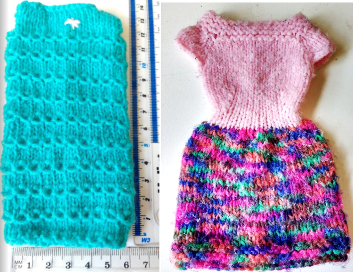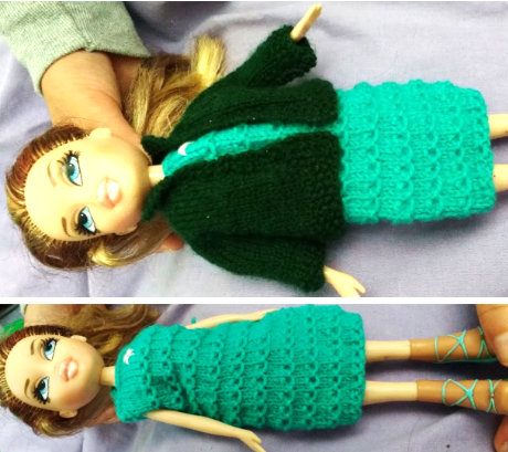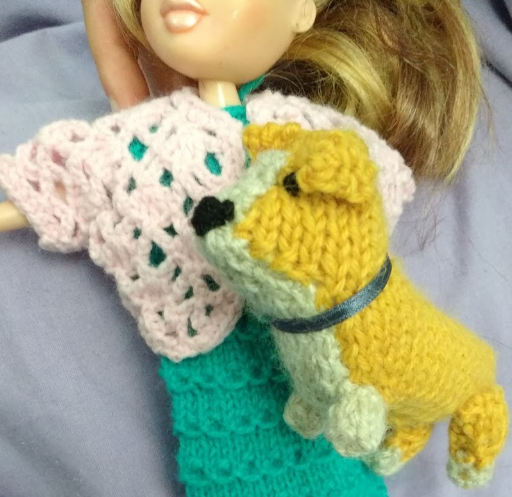 I was reading a very interesting post by @crosheille on an activity using STEM (Science, Technology, Engineering and Mathematics). You can visit her post [here](https://steemit.com/steemstem/@crosheille/barbie-stem-kit-engineering-a-spinning-clothes-rack) for more details. The doll and clothes rack reminded me of my knitting, crocheting and sewing outfits for my (3) daughters’ dolls and teddies. I ~~rescued~~ unearthed some and, fortunately, @jen0revision found one of the surviving dolls.  It's a bit shocking for me to think that these dresses must now be well over 10 years old. I don’t have, therefore, a step by step photo tutorial of how I made them. At the time I tried very hard to find suitable outfits that were easy to use by boisterous children. I also wanted to improve my skills as part of the making process.  I always used 4-ply (thin yarn) and for the raglan sleeve / top down dark green cardigan above I used size 2mm needles (may be size 0 in the US). It was an extremely challenging cardigan to make because of the dark colour I foolishly chose. The pattern was hard to understand too so I realise it's not perfect, but I was proud of my ‘nano’ knitting at the time. I never found small enough buttons to finish it properly, but it was a toy anyway ... The crocheted cardigan that you see in the first photo was made using a size 2 to 2.5mm crochet hook. That was a really fast project that was also ‘top down’. Three things were always great when knitting, crocheting or sewing outfits for dolls : - It was really fast to complete a ‘whole outfit’ - The outfits always fitted the dolls (and no zippers were ever needed) - The children were always grateful to get new things for the dolls. This was always the point too : to encourage their own creativity by seeing me making and measuring things, and finding ways of ‘making do’ with what we had.  I also knitted companions for their dolls. Actually the little dog below is one of the last doll-related things I’ve made - so it is much more recent dating back to 2011 and [here's the pattern](https://www.theguardian.com/lifeandstyle/2011/apr/20/royal-wedding-knitting-pattern-corgi?INTCMP=SRCH).  The dog is supposed to be a Pembroke Welsh corgi, but the ears keep turning forward. Anyhow, thanks to @crosheille for hosting #needleworkmonday ! --- --- _all photos by @cryptocariad_ --- ---