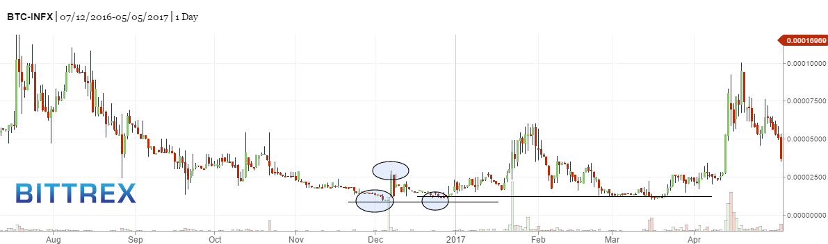 No intro. Part 3. Let's go.  InfluxCoin was kicking it off by a launch dump, kept bleeding and even was speeding up. This big temporary downspike also in this case indicated that something might happen. A nice pump followed. After it dumped back down we found support, retested and formed potential double bottom. We soon broke that support and just dipped one leg below. bounce and retest of same support leading to the next spike. The same pattern occurs here as I analyzed in Evergreen. We also reversed from the area between hardsupport and the 1st potential double bottom support.  Same here again, just not as nice support levels. But also downspike creating hardsupport and a reversal from a point just above that line. followed by the next spike.  That's the next spike included. After that bleed, pullback, more bleed. Quite choppy but more or less exactly what you would expect, so nothing special in here.  Zooming in on the reversal we yet again see a similar structure. We can observe 1st a soft bottom forming, a slight bounce followed by a temporary dip below support and then by a strong severe break of support. After that recovery and reversal from.. ok i have said this enough times already lol.. well .. reversal from area between previous support and, in this case, local hardsupport. The only difference in this scenario, is that the downspike happened after the soft support came in, making it a lot harder to spot it and react in time.  Skipped the ramp up to the major spike, it was sort of turning previous highs into support and actually behaved pretty normal. So after the crazy pump, downtrend, bleed, pullback, bleed, pullback bleed. Notice how the fall became softer and softer? Eventually it made a double bottom (not exactly, but sometimes they act the way it did here aswell, turning around just above) I would have probably entered there if I would have seen it unfold at that time.  So after that it made a pretty solid breakout above the channel, but came back to retest the support. Perfect time to enter at this point. Nothing is better than a double soft bottom.  So that is the way it looks right now, we have started to ramp up, confirm the big trend reversal and most importantly here, parabolic support. I myself bought into it a few weeks ago and just sold it on the current spike. I am looking to reenter soon, and I have eyes on parabolic support level for that. Previous highs might make it bounce aswell, or even reverse, but the probability is too low for me to put buy orders in advance at those levels. The previous high we can however give significance is the earliest one. So my buy limit probably goes on 10.002 sats. Parabolic support acting around that level, previous high aligning with it and also the major number 10k as a good bonus for support strength. All of those factors combined on one level, make me pretty confident in that call. There is a possibility, that if parabolic support holds true and the drop weakens in spead, we might not hit 10k at all, so keep monitoring it and don't get attached to the position. Be flexible :) This was all for now again :) Part 4 comming soon. Feedback welcome! Love you all & happy trading <3