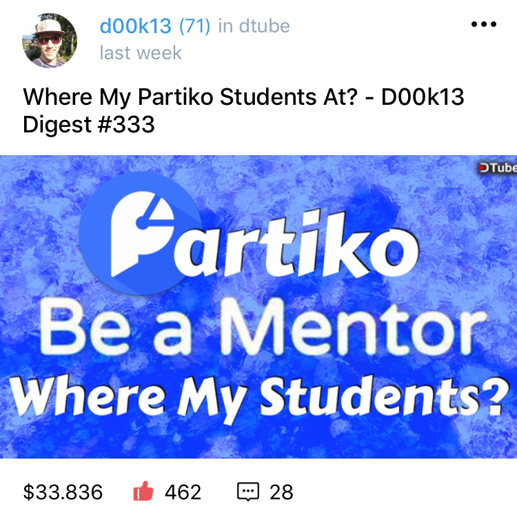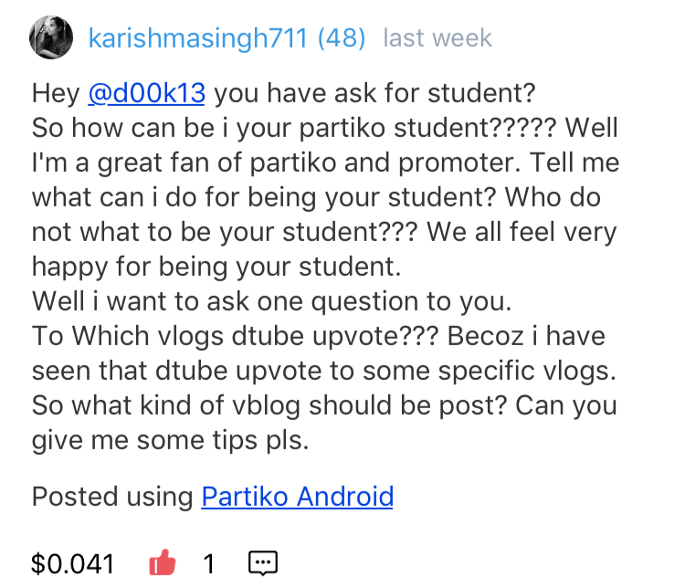 So I took a different tactic, reaching out to the community to see if there would be any response. Some what, not really! It was ghosts except for those whom already stop into my posts. I thought “Meh, you don’t qualify for Mentor Rewards but sure why not I’ll take you on” and the list is as follows. # Students / Partiko Points: 1. [@sarkash7011](https://steemit.com/@sarkash7011) / 11864 2. [@karishmasingh711](https://steemit.com/@karishmasingh711) / 16405 3. [@jeronimorubio](https://steemit.com/@jeronimorubio) / 9218 Now I can’t claim to have lead them to Partiko since becoming a Mentor but I can claim to have encouraged them since taking them on.  # My Support Efforts  1. Delegation, 77SP each Student and 500SP to [@OneLoveSteem](https://steemit.com/@OneLoveSteem) set to vote specifically on our #OneLoveDTube curators and my Students.  1. Signatures, done by [@zord189](https://steemit.com/@zord189) who recently hosted a giveaway which I lead them to investigate. [@Sarkash7011](https://steemit.com/@Sarkash7011) so far is the only one to report back successful. The other two I will purchase a custom one when I hear back about this and they show interest in the signature.  1. Private Discussion via Discord, there was a few good discussions on topics from subject of content and consistency to upvotes and marketing yourself.  1. Shown My Process, [@Sarkash7011](https://steemit.com/@Sarkash7011) has taken full advantage of becoming a student asking many deep questions about my own content creation. [@JeronimoRubio](https://steemit.com/@JeronimoRubio) has also been very eager for my input on several things particularly a collaborative contest. [@Karishmasingh711](https://steemit.com/@Karishmasingh711) has been fairly content continuing on her own.  # Student Update:  [@Sarkash7011](https://steemit.com/@Sarkash7011), has done fairly well though taking a little break which I fully support. I have had to do the same from time to time. He has collected a few point with app use but his journey was towards vlogging so I encouraged him to do both. He had a good response on his videos and seemingly on a few Partiko blog posts. Largely the only help he needed was encouragement and someone to run posting ideas across then a little feedback on post structure.  [@Karishmasingh711](https://steemit.com/@Karishmasingh711), struggling with being over looked for some seriously impressive photography and then also RC restrictions. She has shown skill in her posts and deserving of my support. So far really only needed a little boost in SP to be more functional on Steem. She posts her fabulous photography with Partiko and continuing to do so is about all I could suggest for her. She is a fantastic student, just needed to be enabled!  [@JeronimoRubio](https://steemit.com/@JeronimoRubio), is really his own mentor! He wanted to be my student so “hey, why not” I thought. It inspired a collaboration between himself and [@OneLoveDTube](https://steemit.com/@OneLoveDTube) for his “Awareness and Engagement Contest” 105 Steem up for grabs! He is an excellent supporter of many, engaging, most importantly genuine. I’m proud to consider him a student! Best student ever, he basically told me what he wanted to do and just required a little input and approval to go ahead with his contest!  # Outreach Recap  I have shared posts on twitter and done twitter live streams with no results.  Boosting a post was essentially what caught people’s interest. I did not approach all the newbies, I searched for a market of users that wants support. Some it may just be comments and votes they use the app for but I want to support creation no matter the platform. So my Students, I don’t think qualify but those are my Students anyways.     I learned that we have a fair amount of active welcome wagon bots, they seem intimidating to me. [@Partiko](https://steemit.com/@Partiko) and [@Esteem](https://steemit.com/@Esteem) getting nearly every #introduceyourself post then us Mentors on top of that. We are welcoming sure but new users are immediately presented with conflict between the apps, one bot stating we take no rewards and the other stating we do not use our users to promote our app. It makes both our apps look slimy both on the same posts seemingly calling each other out! I suggest [@Partiko](https://steemit.com/@Partiko) stops the bot comments on new users and instead fully embraces the personal Mentor experience. Empower a few full time Steemians like [@Steemflow](https://steemit.com/@Steemflow) for these positions and we would have a huge leg up on the competition!  Furthermore after we welcome them they fall between the cracks, this is where mentoring is vital! We already have tons of users in those cracks that need support, if we do not create that bridge our students will be there soon enough also! It is a big ocean, focusing only on on-boarding is not my thing I am a supporter of many and my group of students shows that. Rewards or not I found a job that needs to be done, supporting those just over the entry hump but not yet on the hill of success and even one on the hill looking for guidance down the slope. For the sake of this program going forward I would like to see some formal referral tracking, a list I can check to see who has signed up to Partiko under my links so then I can check up on them. As of now that is the big flaw in my tactic, if they do not present themselves directly to me I have no idea if they have followed my links to try the app or if I should check in on them. Personally I am not concerned about receiving rewards for my efforts. I said anything I do receive will be divided evenly and paid to [@SteemBasicIncome](https://steemit.com/@SteemBasicIncome) for shares in votes for life for my Students, I keep my word! I stumbled as always to where I fit the best, I had plans of what I wanted to try but quickly had to rework my plans. I did not receive any response from the few newbies I messaged b
