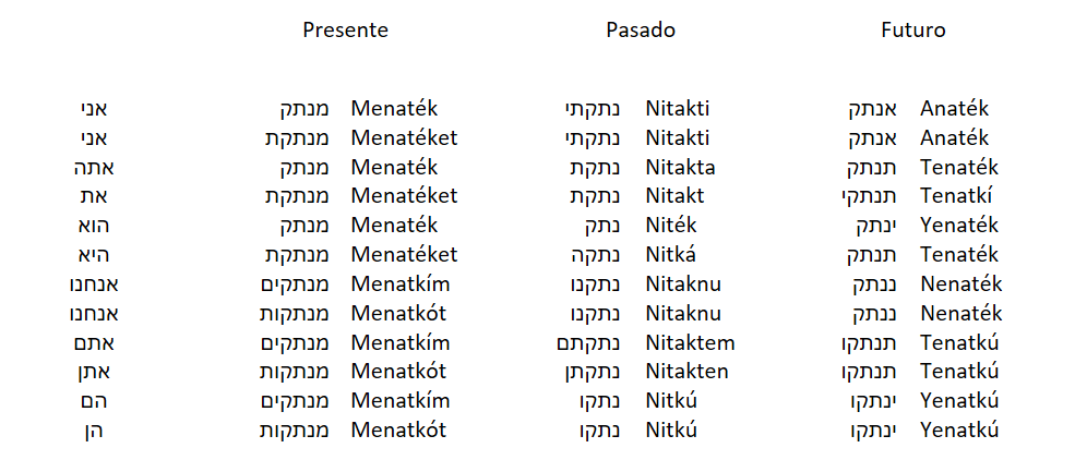 בס"ד  Comenzamos: Este es nuestro último post de la semana y así la despedimos. Les dejo los ejemplos: ?נתקת את הכבל מאריך Nitakta et hakável maaríj? ¿Desconectaste la extensión? אתה תחבר ואני אנתק Atá tenaték vaaní anaték Tú conectarás y yo desconectaré בוא ננתק את המכונה כביסה Bo nenaték et hamejoná kebisá Vamos a desconectar la lavadora
