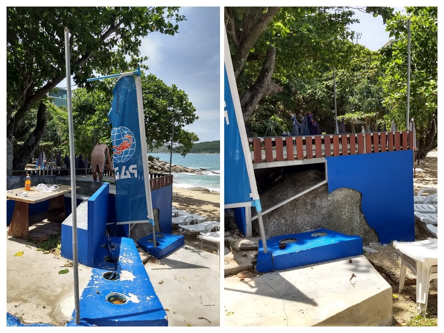 und die beach sieht so aus, als wäre es immer so.  Zwei Tage hatten wir Regen und Sturm und Sturm und Regen. An der AO-Sane, meinem Arbeitsplatz, ist es glimpflich ausgegangen, ein paar Stangen verbogen, etwas Verkleidung abgerissen und überall Äste und Blätter.  Andere hatten nicht so viel Glück. Noch weiss niemand, warum dieser Rohbau kollabiert ist, vielleicht war der Zement noch nicht hart und das herabstürzende Regenwasser hatte zuviel Gewicht, vielleicht war es ein Konstruktionsfehler, jedenfalls hat es einigen Bauarbeitern das Leben oder die Unversehrtheit gekostet.  Ich möchte jetzt nicht in der Haut der Eigentümer stecken, die sich da eingekauft haben oder die schon im Nachbarhaus wohnen, denn es ist ja die selbe Baufirma, die dieses Desaster zu verantworten hat. Das wird auf jeden Fall teuer und wird auch das Sicherheitsgefühl merklich beeinflussen. ### Stürmisch waren auch meine letzten Wochen. Ich bin ja erst seit ein paar Wochen wieder hier und wollte eigentlich ein paar ruhige Tage haben, bevor meine Freunin von den Philippinen zu mir kommt Aber dann habe ich ein Jobangebot in einer nagelneuen Tauchschule auf Sumatra bekommnen mit der Aufgabe neue Divespots zu erkunden. Und welcher Taucher lässt sich so etwas entgehen!! Aber wie das Leben so spielt, ständige Terminänderungen, mal ging es bei mir nicht, mal bei der Tauchschule nicht, immer kurzfristig, so dass ich Flüge wieder stornieren musste, hin und her , bis ich dann abgesagt habe. Denn meine Freundin wollte auch nicht mehr warten und nun ist sie hier.  ### und es wird stürmisch bleiben. Die ersten Tage waren noch Sightseeing angesagt, mit jedem Blödsinn, den man dabei eben macht.  aber danach ging es los mit dem ersten Tauchkurs. Eines habe ich schon gelernt, die eigene Freundin auszubilden kostet unendlich mehr Nerven als den schlimmsten Grobmotoriker. Das fängt schon beim Handy benutzen an. Bei einem Tauchschüler weist Du einfach an, keine Handies beim Kurs, aber versuch das mal mit Deiner Freundin!  Morgen habe ich meinen ersten johannafreien Tag, ich gehe ganz entspant mit einem Freund tauchen. .... ...und übermorgen hoffentlich wieder. <center>  </center>