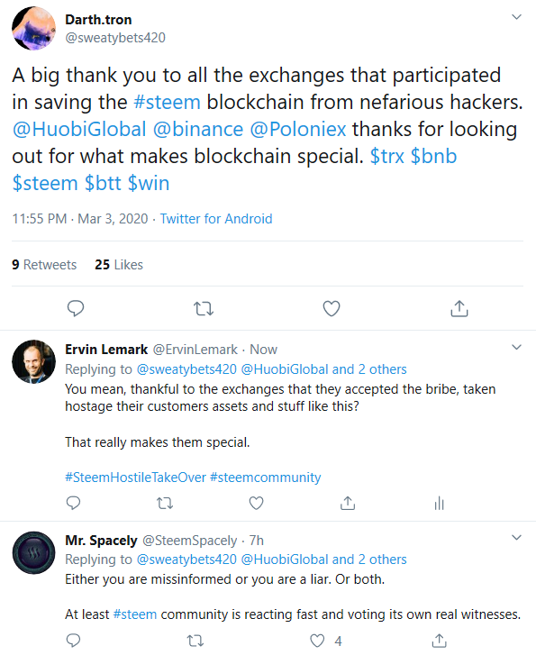 One word # BRAVO FOR THE COMMUNITY Another word # RESPECT Respect for everybody who is participating and fighting hard to keep the platform in the community's hands. Because this is a war with one battle going on for the second day. [](https://steempeak.com/me/witnesses) --- In the meantime, on Twitter... A positive note, @dantheman's excited. <center>[](https://twitter.com/bytemaster7/status/1235027754577362946)</center> A negative note, this guy is not so excited. <center>[](https://twitter.com/sweatybets420/status/1234975737897029632)</center> Eh ... I won't be silent! --- ***Better and better***