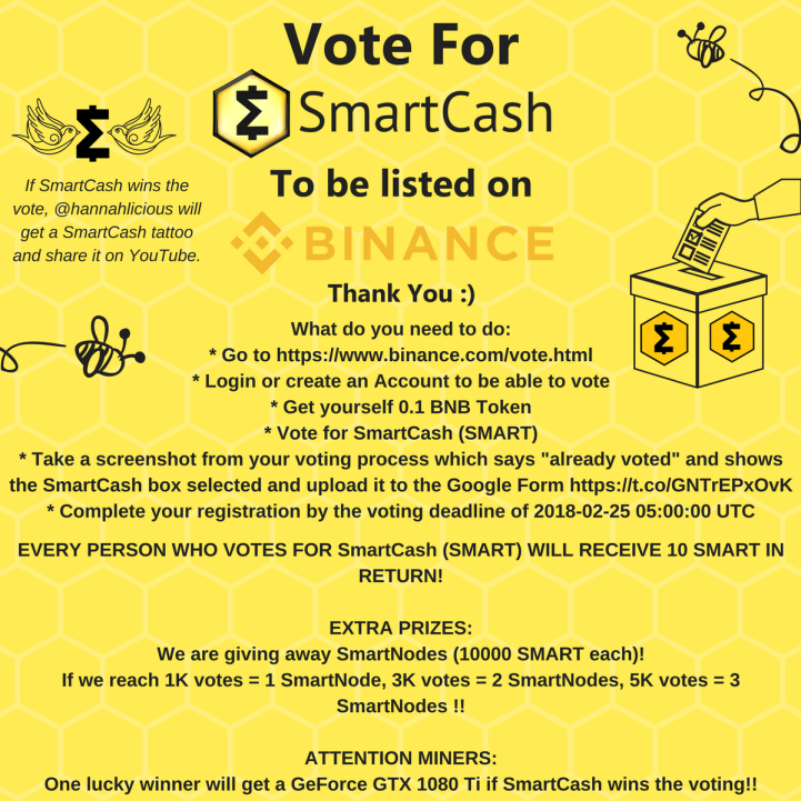 So this is a time that may drastically change the lives of a lot of people that were smart enough to get some SmartCash... why is this? well the coin has the option to get listed on Binance but the community needs # YOUR HELP   If you have a Binance account then we would ask you to vote for the adoption of the coin to that exchange. https://www.binance.com/vote.html just follow the link above and vote for SMARTCASH then you can join them on [Discord ](https://discord.gg/GBgu9PM) The Smartcash community is fair and they have set apart a budget to reimburse the people that are kind enough to vote. So if you are a holder of some SMART then you should really go and vote If you are a steem fan and you have a BINANCE account we kindly ask you to cast your vote for us and the community. Anyone voting and copying a screenshot here in the answers will get a full upvote from me I know its only 0,2 but its more then you had before. If you do not know SMARTCASH then you can read up on it in an amazing post made by @lukestokes as long as 4 months ago and he has been promoting this ever since... And if you really want some another references you can check out the vlogs @broncnutz or @beerbuzzergeek The coin has gone down in value for the moment and this is the time to get enough for a masternode (10000 Smartcash) while its still affordable... I know I have my 10000 and looking into another node so join us and this decentralized community Since January the Smartnodes are up and Staking the coins is as strong as ever...