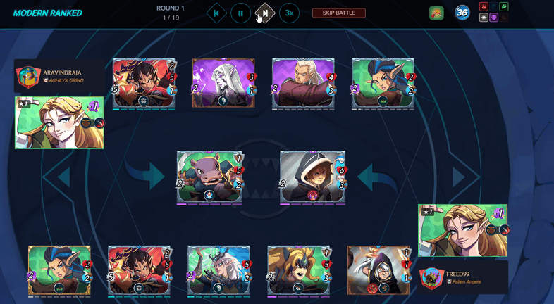 Seleccione mis unidades por tipo de ataque (mágico o cuerpo a cuerpo) y su linaje, permitiéndoles utilizar la habilidad de ejecutar a las unidades con menos de dos puntos de vida. Además, considere dejar una unidad Spellmonger (set Foundation) como señuelo para debilitar a posibles unidades del oponente con ataque cuerpo a cuerpo y la habilidad oportunista.