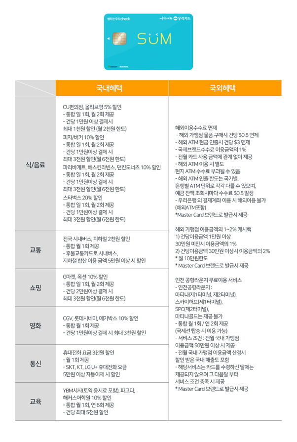 신입사원 재테크 틀 다지기 두 번째 시간~! "지출편"으로 돌아온 굿초보 에디터입니다 : ) 지난 시간에는 급여 통장 선택과 적금 가입, 그리고 여유자금 저장을 통해 소중한 수입이 들어오는 통로를 딱 지정했었죠. 그런데 돈이 들어오면 당연히 나가는 구멍이 있는 법! <center></center> 사회생활을 시작하면 식비, 교통비, 그리고 통신비 등 고정지출 부담이 급격히 늘어납니다. 그뿐만아니라 사야 할 것도, 사고 싶은 것도 굉장히 많아지죠. 저 또한 "이러려고 돈 버는 거지!"하며 참아왔던 소비욕구를 터뜨렸다 매우 후회했던 기억이 있습니다.. 하지만 쓸 땐 쓰더라도 혜택을 따져가며 똑똑한 소비를 한다면 한 푼이라도 아낄 수 있답니다! 바로 **[카드의 다양한 혜택을 활용하는 방법]()**으로 말이죠! --- <br> <h3>1. 체크카드</h3> 각 은행사들은 고객 유치를 위해 카드마다 다양한 혜택을 제공합니다. 때문에 큰 폭을 차지하는 소비 항목에서 할인이나 페이백을 제공하는 카드를 잘 선택하는 것이 중요합니다. 그리고 아직 자신의 소비패턴이 정리되지 않은 사회 초년생이라면 신용카드보단 체크카드를 이용하는 것을 추천합니다 : ) 신용카드를 이용하다 자칫 잘못하면 할부의 늪에 빠질 수도 있고, **[체크카드는 30% 소득공제라는 강력한 이득]()**도 얻을 수 있기 때문이죠. 저는 급여통장 개설을 위해 방문한 은행에서 제 소비패턴과 적합한 체크카드를 추천받았습니다. 바로 "썸 타는 우리 체크카드"입니다. 이 카드는 국내/외로 다양한 혜택을 제공하고 있습니다. <center></center> 정말 혜택이 어마어마하죠!! 전 특히 식비와 커피값, 그리고 교통비에서의 지출이 큰 폭을 차지하는데 해당 항목에서 다양한 할인을 제공하니 꾸준히 이용한다면 쏠쏠한 재미를 볼 수 있을 것 같습니다. 여기서 잠깐만! 할인이나 페이백 같은 혜택 외에도 특이한 혜택을 제공하는 카드가 있다는 것 알고 계세요? <center></center> 바로 **"내미래 신한카드 S20체크"**입니다! 이 카드는 이제 막 사회생활을 시작한 초년생에게 아주 좋은 혜택을 제공합니다. **[적립된 포인트로 학자금 대출 상환이 가능]()**하다는 것이죠. 카드 사용으로 1천 포인트 이상의 적립을 달성한 경우, 매월 한국장학재단으로 통보되고 1포인트에 1원이 자동으로 상환처리됩니다 : ) 포인트를 상환에 이용하지 않는 경우 통장으로 페이백 되어 현금으로 돌아오죠! 저는 이 카드를 약 1년 반 동안 꾸준히 사용해오고 있는데요, 문의 결과 2018년 12월을 기점으로 6천 포인트가 적립되어 앞으로 상환에 이용될 것이라는 이야기를 들었습니다>< 앞으로의 소비 생활에 꾸준히 이용하여 작은 금액이나마 상환에 도움을 주려고 합니다! <br> <h3>2. 신용카드</h3> 그렇다면 사회 초년생 시절엔 무조건 체크카드만 쓰는 것이 답일까요? 그렇지 않습니다! 신용카드의 혜택은 체크카드보다 폭이 더 넓으므로 계획만 잘 세운다면 실질적인 소비금액을 줄일 수 있습니다. 저는 경기도에서 서울로 출퇴근하는 직장인으로서 매월 10만원 이상의 교통비를 지출하는데요, 체크카드의 경우 지출금액에 상관없이 할인 한도가 낮아 아쉬운 마음이 있었습니다. 하지만 신용카드는 이용금액이 클수록 더 큰 할인을 얻을 수 있으니 몇 가지 고정 지출에 대해 신용카드를 활용한다면 정말 좋겠죠! <center> </center> 저는 많은 사람들의 선택을 받는 신용카드 중, 제 소비패턴에 맞는 "씨티클리어카드"와 "삼성카드 taptapO"를 골라보았습니다: ) > 우선, "씨티클리어카드"는 교통과 외식에서 강점을 지니고 있습니다! 체크카드 이용 시 월 10만원의 교통비 지출에 대해 최대 2천 원의 할인을 받았다면 씨티클리어카드를 이용했을 때 [월 1만 원의 청구할인 혜택]()을 얻는 것이 가능합니다! 1년 즉, 연 12회로 따져보았을 때 **[약 9만 6천 원의 이득]()**을 더 얻을 수 있는 것이죠! 또한 연회비가 5천 원으로 매우 저렴하고, 전월 실적 기준이 15만 원으로 타사의 신용카드보다 저렴해 지출 폭이 크지 않은 사회 초년생에게 적합하다고 할 수 있죠. > "삼성카드 taptapO"는 연회비 1만 원, 전월실적 30만 원으로 씨티클리어카드보단 높지만 그만큼 강력한 혜택을 제공합니다. > 특이한 점은 자신의 라이프 스타일에 따라 **[할인 패키지를 선택]()**해 원하는 항목에서 더 큰 할인을 받는 것이 가능하다는 것입니다! 저는 커피전문점 중 스타벅스를 가장 좋아하고, ZARA에서 주로 쇼핑하므로 패키지3을 선택했습니다 : ) 이 외에도 **[영화 5천 원 할인, 이동통신요금 10% 할인]()** 등 다양한 혜택을 제공하니 관심 있는 분들이라면 꼭 놓치지 마시길 바랍니다~ <br> <h3>+하이브리드카드</h3> '아 나는 체크카드, 신용카드 따로 쓰기 너무 귀찮아! 그냥 하나만 할래~' 하시는 분들! 여기 **하이브리드카드**가 있습니다! 하이브리드카드는 신용카드와 체크카드 두 가지의 기능을 합친 카드로 단 한 장으로 양방향의 혜택을 모두 얻을 수 있으니 정말 꿀같은 존재죠>< 카드사마다 공통으로 적용되는 세 가지 사항(2개사까지 이용 가능, 통합 한도 30만 원, 할부 결제 및 해외 이용 불가)를 제외하곤 결제 방식이 매우 다양하니 자신의 소비 패턴에 적합한 카드를 선택해