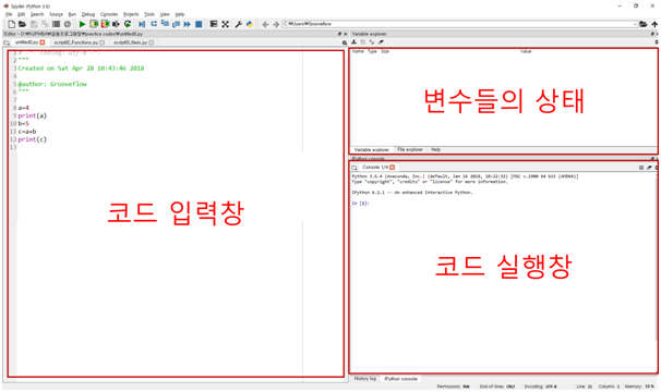 왼쪽은 script editor(코드입력창), 오른쪽상단은 variable explorer(변수들의 상태창), 오른쪽 하단은 ipython console(코드를 실행하는 창)입니다.