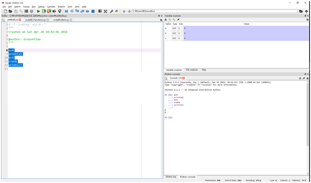 입력한 코드들을 실행하기 위해서는 F9키 등을 이용해서 실행하거나 Ipython console에 직접 입력해서 실행합니다. 여기서 실행하는 동안 사용한 변수들의 그때그때 값은 variable explorer에 표시됩니다.