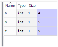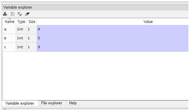 a,b,c라는 변수가 있고 타입은 int, 사이즈는 1, 그리고 값(Value)은 4,5,9가 입력되어 있음을 보여줍니다. Int는 아직 뭔지 모르니 일단 그런게 있구나 하고 넘어갑니다. 지금 찾아봤자 머리에 안들어옵니다. 나중에 알게되겠죠. 뭐.