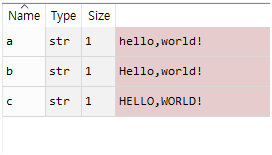 다른 변수들은 그대로 인데 변수a는 type이 str 즉 문자열로 바뀌고 value도 hello,world! 로 바뀐 것을 볼 수 있습니다.