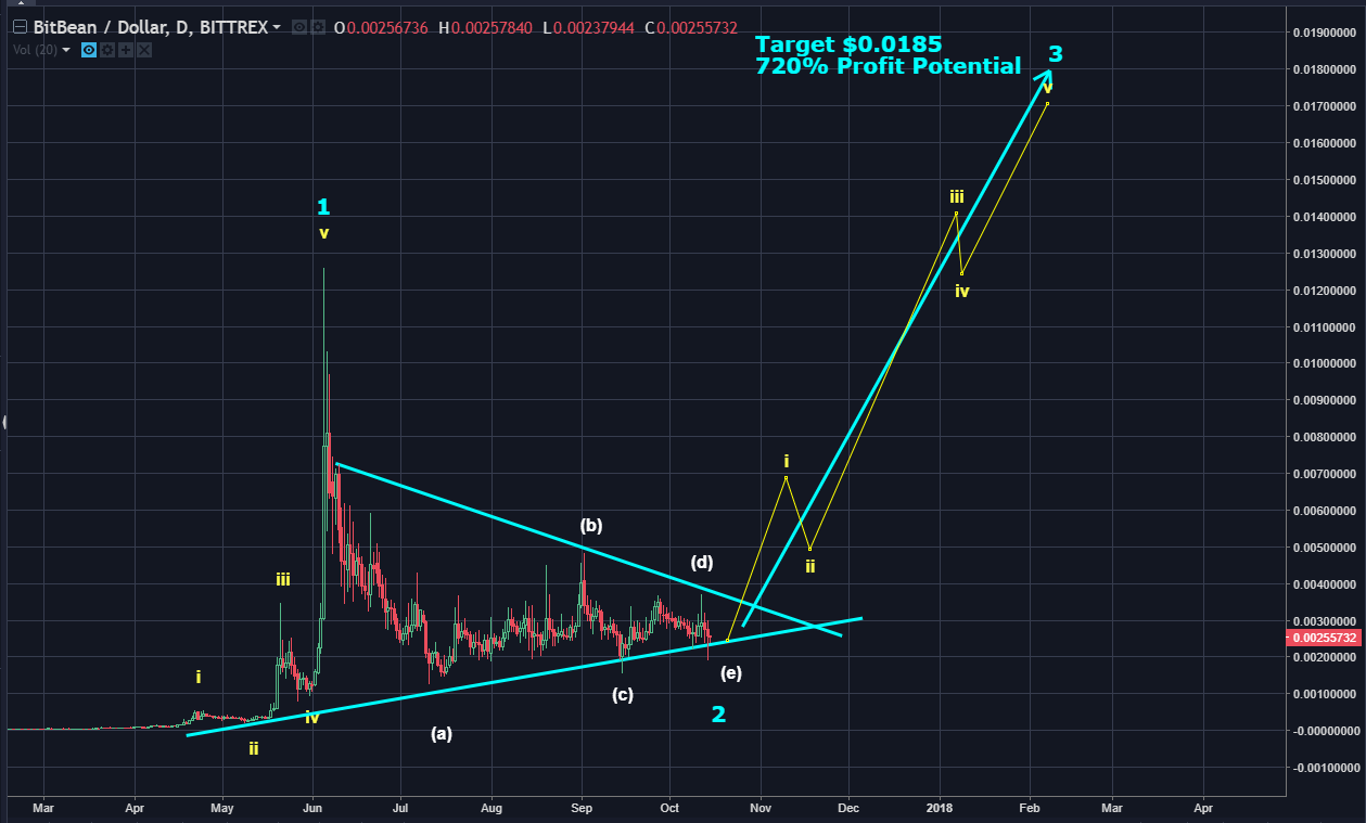 <center></center> -- **SUMMARY** BITBEAN (BITB) is analyzed using Elliott Waves and Chart Pattern Recognition. The below chart shows that BITB completed an impulse set of five waves (i,ii,iii,iv,v white). Elliott Waves states that after a five wave impulse, there is a requisite three wave correction. There are three types of corrections, a zig zag a,b,c; a flat a,b,c, and a triangle. I believe BITB is completing a triangle a,b,c,d,e type of correction and if correct, prices could surge. The first set of five waves (i,ii,iii,iv,v white) are sub waves of a higher degree wave 1 (blue) and the a,b,c,d,e triangle waves (red) are sub waves to a higher degree wave 2 (blue). After any wave 2 in an impulse is a wave 3 (blue). In an impulse, wave 3 is never lesser than wave 1, therefore at about 1.618 the length of wave 1 (blue); wave 3 (blue) would target $0.0185 or so. I storngly recommend you view the video analysis as it contains tons of details with good Elliott Wave introduction and other price pathway possibilities.  https://youtu.be/cIKdVyVVPqY -- -- https://steemitimages.com/0x0/http://i.imgur.com/40YQWVI.gif If this blog post has entertained or helped you to profit, please follow, upvote, resteem and/or consider buying me a beer: BTC Wallet - 19gHMJc9wi9KkP47wokz8y4cFNgz1kAAUE ETH Wallet - 0xf83641dbf1a53498eae6d0d568c969790da48a36 LTC Wallet - LU1mEw1LHvffoWf9VDEVdP7Day4jv6VLqu EOS Wallet - 0xf83641dbf1a53498eae6d0d568c969790da48a36</center> <center>https://steemitimages.com/0x0/https://s1.postimg.org/231h83mh7z/U5drx_NFe_Q4_Nn_YGEb9rq2_V47_X6_Yk_AQsm.gif</center> **Legal Mumbo Jumbo**: This is only my opinion, make of it what you wish. What does this mean? It means it's not advice nor recommendation to either buy or sell anything! It's only meant for use as informative or entertainment purposes.** </center>
