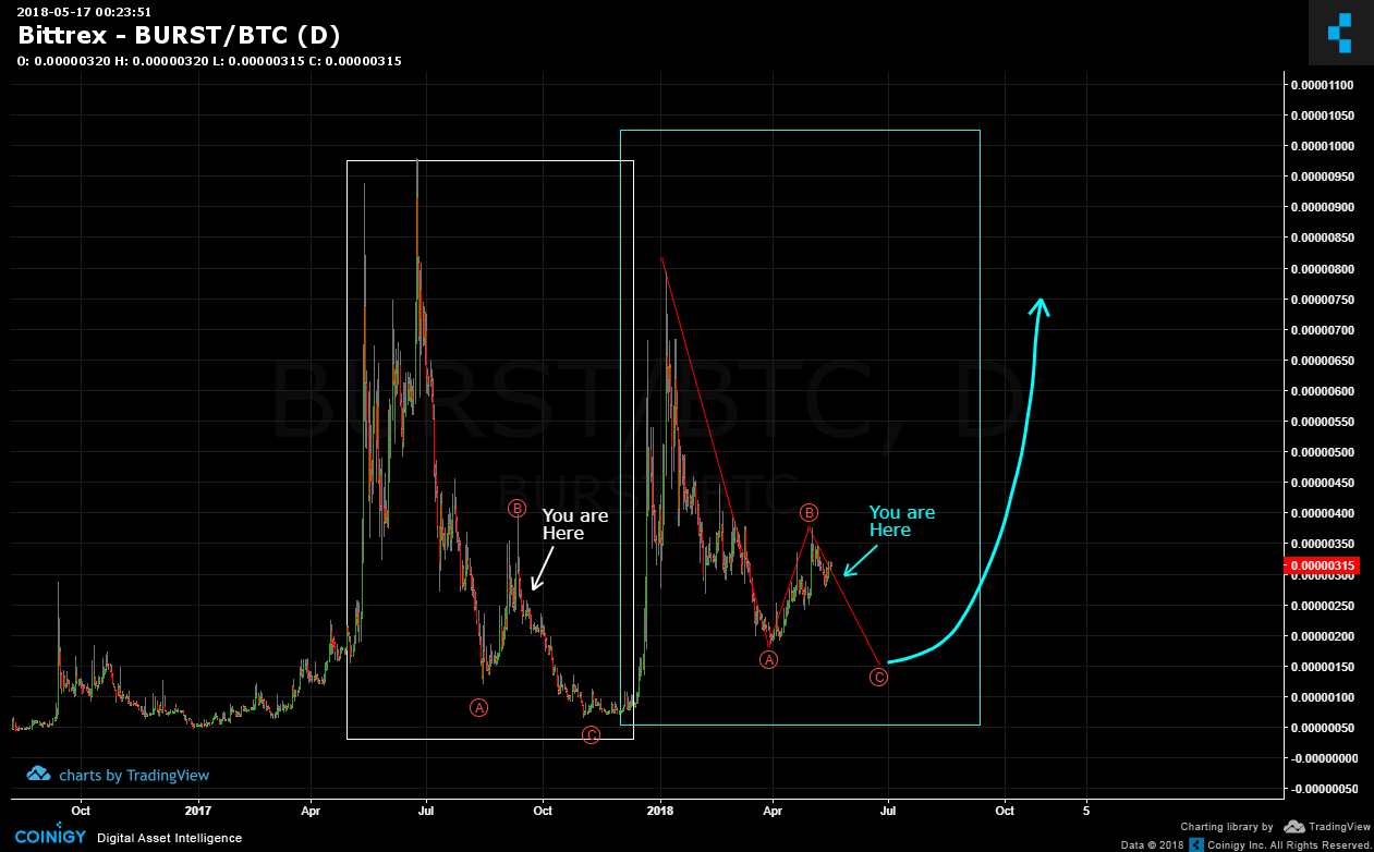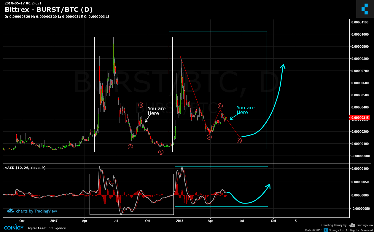 <center></center> -- **SUMMARY** BURST Coin (BURST/BTC) is working to complete the second fractal (blue) as shown in below chart. The white fractal contains an ABC correction and the blue fractal contains almost peak to peak similarity. The "You ar Here" marker shows approximate correlation. IF this is correct, then the red C wave of the blue fractal should lead to a lower low before a sizable trend reversal (blue arrow).  It's pretty interesting to see how the white fractal is also reflected in the MACD. The MACD blue fractal is quite similar. I believe it's a matter of the red wave C reaching its target and have the trend reversal supported by the MACD upswing.  **Legal Disclaimer**: I am not a financial advisor nor is any content in this article presented as financial advice. The information provided in this blog post and any other posts that I make and any accompanying material is for informational purposes only. It should not be considered financial or investment advice of any kind. One should consult with a financial or investment professional to determine what may be best for your individual needs. Plain English: This is only my opinion, make of it what you wish. What does this mean? It means it's not advice nor recommendation to either buy or sell anything! It's only meant for use as informative or entertainment purposes. </center> Please consider reviewing these Tutorials on: [Elliott Wave Counting Tutorial #1](https://steemit.com/bitcoin/@haejin/elliott-wave-tutorial-1-by-haejin) [Elliott Wave Counting Tutorial #2](https://steemit.com/bitcoin/@haejin/elliott-wave-tutorial-video-2-zig-zag-and-flat-corrections-how-to-recognize-and-label-corrective-waves) [Elliott Wave Counting Tutorial #3](https://steemit.com/bitcoin/@haejin/elliott-wave-tutorial-iii-how-to-label-and-apply-triangle-price-corrections) [Laddering](https://steemit.com/bitcoin/@haejin/an-effective-buying-and-selling-strategy-laddering-a-tutorial-on-to-cast-a-ladder) and [Buy/Sell Setups](https://steemit.com/bitcoin/@haejin/when-to-buy-and-sell-using-elliott-waves-a-tutorial). [Laddering Example with EOS](https://steemit.com/bitcoin/@haejin/eos-target-usd3-22-analysis-update-live-real-time-laddering-example-you-don-t-want-to-miss-this) [Tutorial on the use of Fibonacci & Elliott Waves](https://steemit.com/bitcoin/@haejin/tutorial-on-the-use-of-fibonacci-ratio-and-elliott-waves) [@haejin's Trading Nuggets](https://steemit.com/bitcoin/@haejin/haejin-s-trading-nuggets-all-learned-through-tonnages-of-failure-experiences) [Essay: Is Technical Analysis a Quantum Event?](https://steemit.com/bitcoin/@haejin/essay-is-technical-analysis-a-quantum-event) Follow me on [Twitter](https://twitter.com/Haejin_Crypto) for Real Time Alerts!! Follow me on [StockTwits](https://stocktwits.com/HaejinCrypto) for UpDates!! -- -- <center>https://steemitimages.com/DQmWpisRXDF56mV3DgzzPUxb3R2ozseR48YVr2YKtwtrBcV/DQmWpisRXDF56mV3DgzzPUxb3R2ozseR48YVr2YKtwtrBcV.gif <center>https://steemitimages.com/0x0/https://s1.postimg.org/231h83mh7z/U5drx_NFe_Q4_Nn_YGEb9rq2_V47_X6_Yk_AQsm.gif</center>