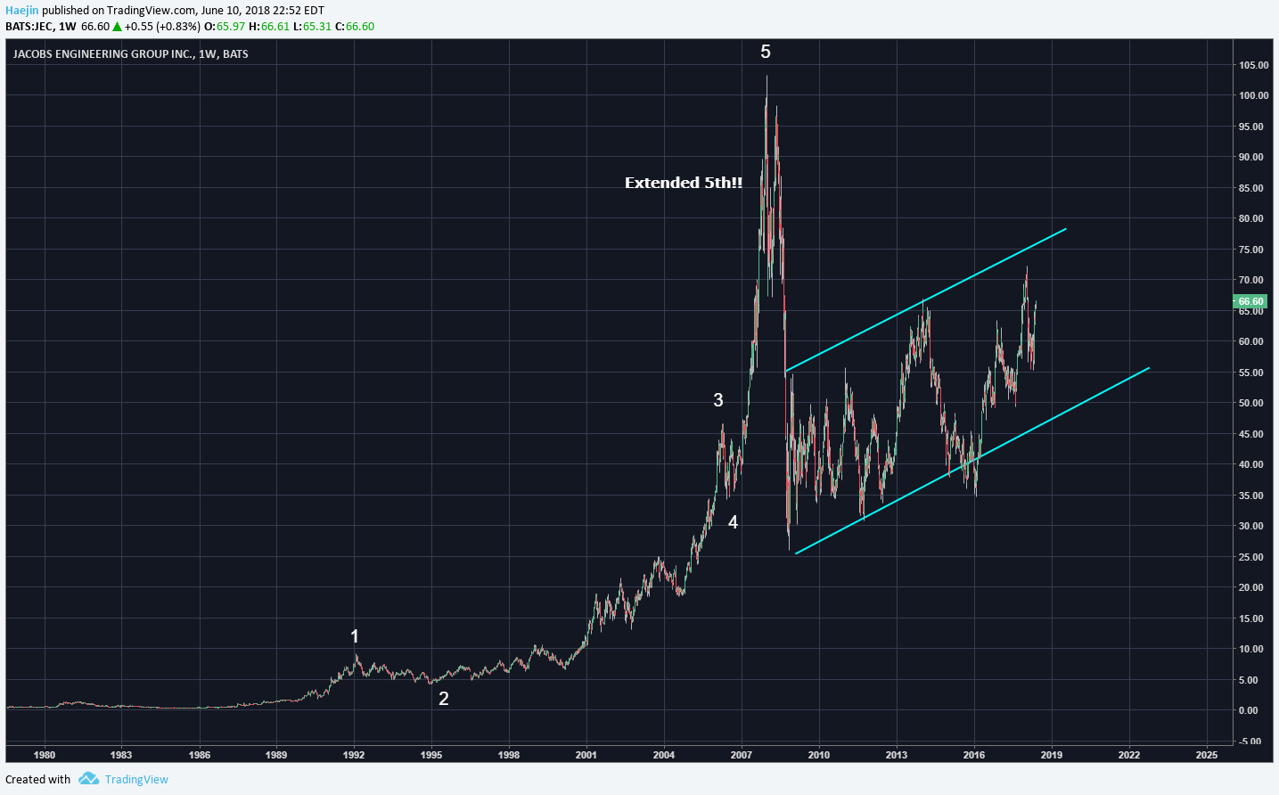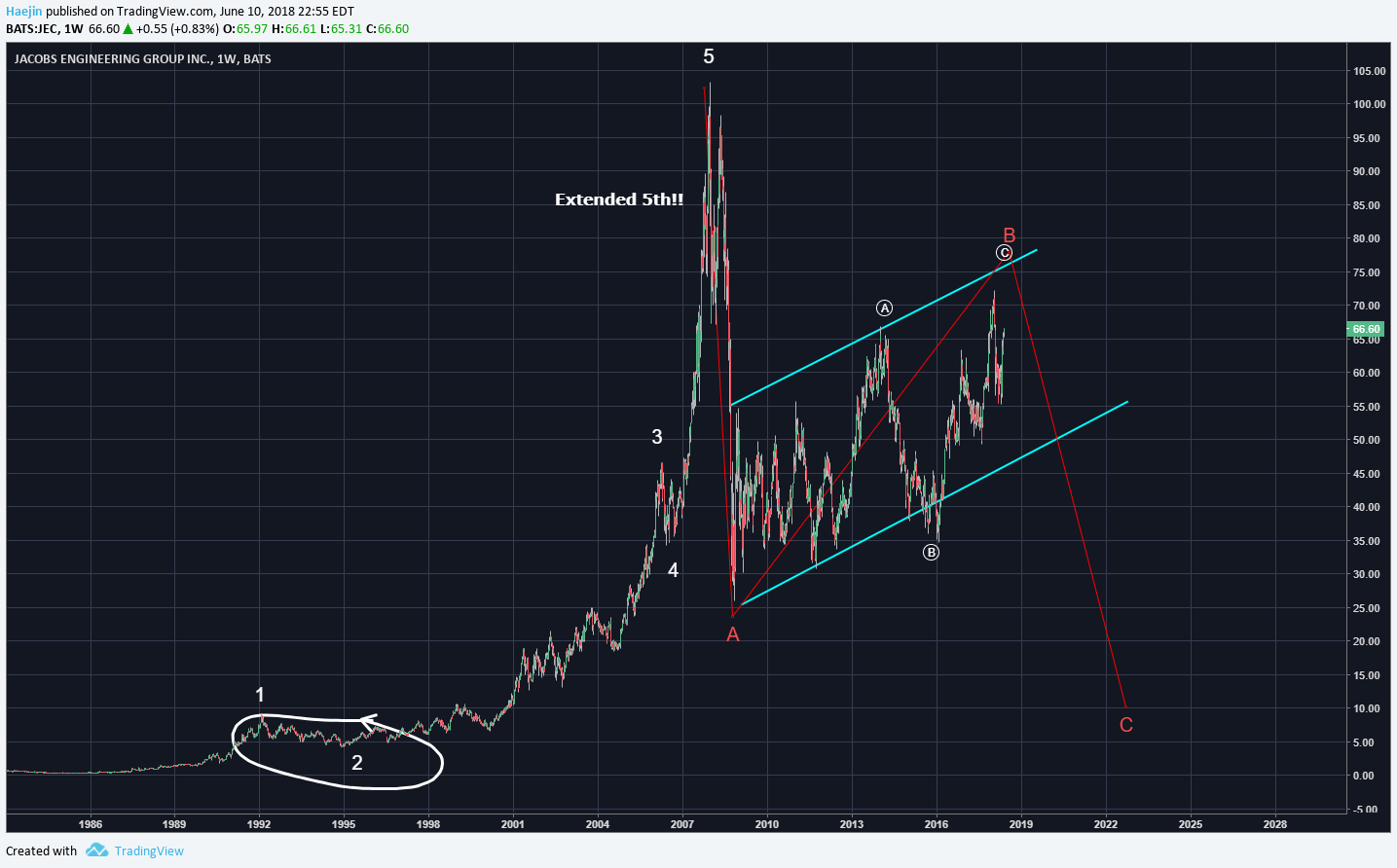 <center></center> -- **SUMMARY** Look at the extended 5th wave on this chart of Jacobs Engineering Group (JEC). That's probably why JEC hasn't reached all time new highs because its correction has not yet complete. The blue upward pointing flag is not bullish! How low does an extended 5th correction go?  When you see an extended 5th, consider running and not walking. JEC hasn't finished its correction and is likely to decline to a new lower low towards the prior wave 2 zone (white circle). The bear flag also is completing and once done, the onse of red C could be scary to many unsuspecting bulls.  **Legal Disclaimer**: I am not a financial advisor nor is any content in this article presented as financial advice. The information provided in this blog post and any other posts that I make and any accompanying material is for informational purposes only. It should not be considered financial or investment advice of any kind. One should consult with a financial or investment professional to determine what may be best for your individual needs. Plain English: This is only my opinion, make of it what you wish. What does this mean? It means it's not advice nor recommendation to either buy or sell anything! It's only meant for use as informative or entertainment purposes. </center> -- -- <center>https://steemitimages.com/DQmWpisRXDF56mV3DgzzPUxb3R2ozseR48YVr2YKtwtrBcV/DQmWpisRXDF56mV3DgzzPUxb3R2ozseR48YVr2YKtwtrBcV.gif <center>https://steemitimages.com/0x0/https://s1.postimg.org/231h83mh7z/U5drx_NFe_Q4_Nn_YGEb9rq2_V47_X6_Yk_AQsm.gif</center> __