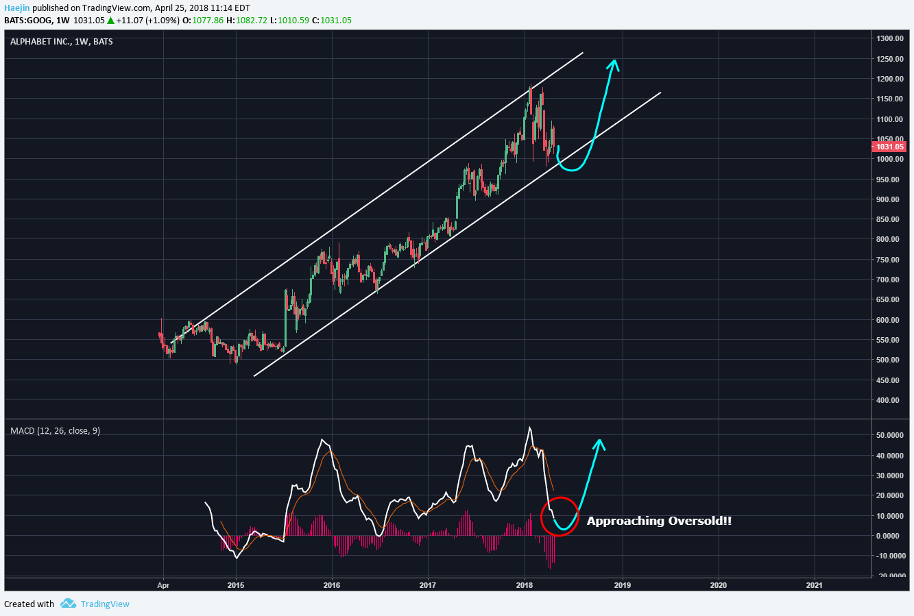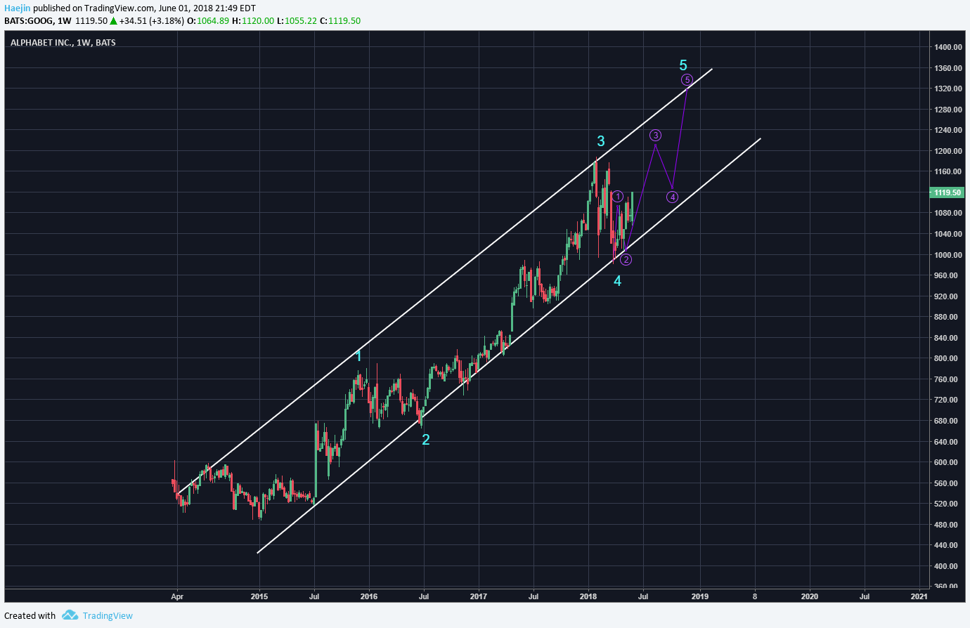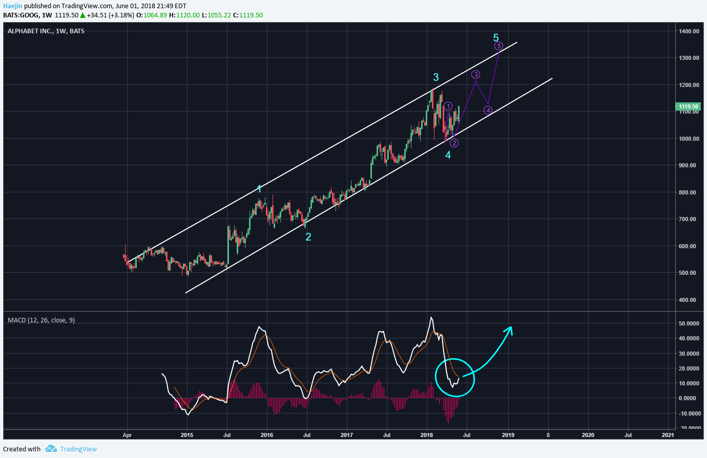 <center></center> -- **SUMMARY** **Note: For anyone who missed the BitcoinLive Information Webinar, here is the replay link: [https://www.youtube.com/watch?v=32l40SNYOp4](https://www.youtube.com/watch?v=32l40SNYOp4)** **As of June 4, ALL Crypto Analysis will be posted on the [BitcoinLive](https://get.bitcoin.live/haejin/) channel and Steemit will be dedicated for Equity, Commodity and Options Analysis. To Signup for the [BitcoinLive](https://get.bitcoin.live/haejin/) limited Founding Membership slots, use this link: [https://get.bitcoin.live/haejin/](https://get.bitcoin.live/haejin/)** __ Back on April 25, I had posted the below analysis of Alphabet (GOOG). Price had been moving in a channel since its genesis and that it wasn't likely for that to change in the short term. The MACD was also approaching oversold conditions. The projection was that price would turn up as shown by the blue arrow.  Since then, price has climbed 8.5% and for equities, that is a huge gain in such a short time frame of just over a month. I've also added the Elliott Waves. The blue wave 5 could be in progress and the purple waves are its subwaves. This means that higher highs are likely.  The MACD is curling up and soon a buy signal should be triggered (blue circle) and rise to support the impulse subwaves of blue 5.  **Legal Disclaimer**: I am not a financial advisor nor is any content in this article presented as financial advice. The information provided in this blog post and any other posts that I make and any accompanying material is for informational purposes only. It should not be considered financial or investment advice of any kind. One should consult with a financial or investment professional to determine what may be best for your individual needs. Plain English: This is only my opinion, make of it what you wish. What does this mean? It means it's not advice nor recommendation to either buy or sell anything! It's only meant for use as informative or entertainment purposes. </center> Please consider reviewing these Tutorials on: [Elliott Wave Counting Tutorial #1](https://steemit.com/bitcoin/@haejin/elliott-wave-tutorial-1-by-haejin) [Elliott Wave Counting Tutorial #2](https://steemit.com/bitcoin/@haejin/elliott-wave-tutorial-video-2-zig-zag-and-flat-corrections-how-to-recognize-and-label-corrective-waves) [Elliott Wave Counting Tutorial #3](https://steemit.com/bitcoin/@haejin/elliott-wave-tutorial-iii-how-to-label-and-apply-triangle-price-corrections) [Laddering](https://steemit.com/bitcoin/@haejin/an-effective-buying-and-selling-strategy-laddering-a-tutorial-on-to-cast-a-ladder) and [Buy/Sell Setups](https://steemit.com/bitcoin/@haejin/when-to-buy-and-sell-using-elliott-waves-a-tutorial). [Laddering Example with EOS](https://steemit.com/bitcoin/@haejin/eos-target-usd3-22-analysis-update-live-real-time-laddering-example-you-don-t-want-to-miss-this) [Tutorial on the use of Fibonacci & Elliott Waves](https://steemit.com/bitcoin/@haejin/tutorial-on-the-use-of-fibonacci-ratio-and-elliott-waves) [@haejin's Trading Nuggets](https://steemit.com/bitcoin/@haejin/haejin-s-trading-nuggets-all-learned-through-tonnages-of-failure-experiences) [Essay: Is Technical Analysis a Quantum Event?](https://steemit.com/bitcoin/@haejin/essay-is-technical-analysis-a-quantum-event) Follow me on [Twitter](https://twitter.com/Haejin_Crypto) for Real Time Alerts!! Follow me on [StockTwits](https://stocktwits.com/HaejinCrypto) for UpDates!! -- -- <center>https://steemitimages.com/DQmWpisRXDF56mV3DgzzPUxb3R2ozseR48YVr2YKtwtrBcV/DQmWpisRXDF56mV3DgzzPUxb3R2ozseR48YVr2YKtwtrBcV.gif <center>https://steemitimages.com/0x0/https://s1.postimg.org/231h83mh7z/U5drx_NFe_Q4_Nn_YGEb9rq2_V47_X6_Yk_AQsm.gif</center>