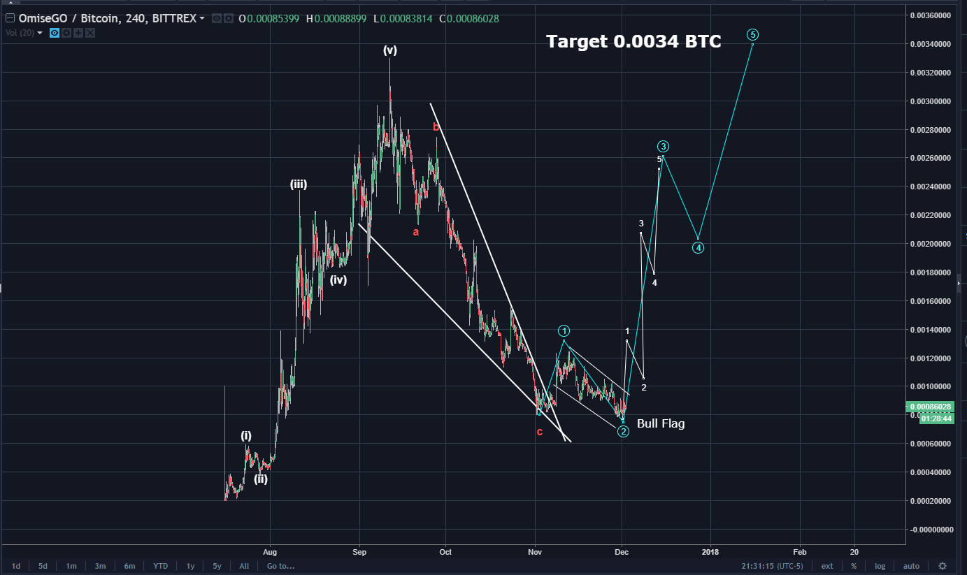 <center>)</center> -- **SUMMARY** OmiseGo (OMG) had a flash crash on November 29th. Prior to that, I had projected $15 price target. So, when taking into account the flash crash, the below chart shows an update on the a,b,c corrective waves. I maintain the $15 target but for wave 3 and now project wave 5 to target $19.21 or so. The destination remains unchanged as there are multiple price pathways to it. What causes flash crashes? Sentiment. Is it foreseeable? Sometimes. Should you always use limit stops? YES!  Below is the OMG/BTC looking quite bullish. A bull flag has formed and is nearly complete. Price needs to breach out of the upper white resistance line and start the onset of blue wave 3. Target remains unchanged at 0.00034 BTC.  Please consider reviewing these Tutorials on: [Elliott Wave Counting Tutorial #1](https://steemit.com/bitcoin/@haejin/elliott-wave-tutorial-1-by-haejin) [Elliott Wave Counting Tutorial #2](https://steemit.com/bitcoin/@haejin/elliott-wave-tutorial-video-2-zig-zag-and-flat-corrections-how-to-recognize-and-label-corrective-waves) [Elliott Wave Counting Tutorial #3](https://steemit.com/bitcoin/@haejin/elliott-wave-tutorial-iii-how-to-label-and-apply-triangle-price-corrections) [Laddering](https://steemit.com/bitcoin/@haejin/an-effective-buying-and-selling-strategy-laddering-a-tutorial-on-to-cast-a-ladder) and [Buy/Sell Setups](https://steemit.com/bitcoin/@haejin/when-to-buy-and-sell-using-elliott-waves-a-tutorial). [Laddering Example with EOS](https://steemit.com/bitcoin/@haejin/eos-target-usd3-22-analysis-update-live-real-time-laddering-example-you-don-t-want-to-miss-this) [Tutorial on the use of Fibonacci & Elliott Waves](https://steemit.com/bitcoin/@haejin/tutorial-on-the-use-of-fibonacci-ratio-and-elliott-waves) These Technical Analysis Books: [Elliott Wave Priniciple & Technical Analysis of Stock Trends](https://steemit.com/bitcoin/@haejin/n98sk-haejin-s-ta-book-recommendations-for-elliott-wave-and-chart-pattern-recognition) are highly recommended [@haejin's Trading Nuggets](https://steemit.com/bitcoin/@haejin/haejin-s-trading-nuggets-all-learned-through-tonnages-of-failure-experiences) [Essay: Is Technical Analysis a Quantum Event?](https://steemit.com/bitcoin/@haejin/essay-is-technical-analysis-a-quantum-event) Follow me on [Twitter](https://twitter.com/Haejin_Crypto) for Real Time Alerts!! -- -- <center>https://steemitimages.com/DQmWpisRXDF56mV3DgzzPUxb3R2ozseR48YVr2YKtwtrBcV/DQmWpisRXDF56mV3DgzzPUxb3R2ozseR48YVr2YKtwtrBcV.gif If this blog post has entertained or helped you to profit, please follow, upvote, resteem and/or consider buying me a beer: BTS Wallet - haejin1970 BTC Wallet - 1HMFpq4tC7a2acpjD45hCT4WqPNHXcqpof ETH Wallet - 0x1Ab87962dD59BBfFe33819772C950F0B38554030 LTC Wallet - LecCNCzkt4vjVq2i3bgYiebmr9GbYo6FQf <center>https://steemitimages.com/0x0/https://s1.postimg.org/231h83mh7z/U5drx_NFe_Q4_Nn_YGEb9rq2_V47_X6_Yk_AQsm.gif</center> **Legal Mumbo Jumbo**: This is only my opinion, make of it what you wish. What does this mean? It means it's not advice nor recommendation to either buy or sell anything! It's only meant for use as informative or entertainment purposes.** </center>