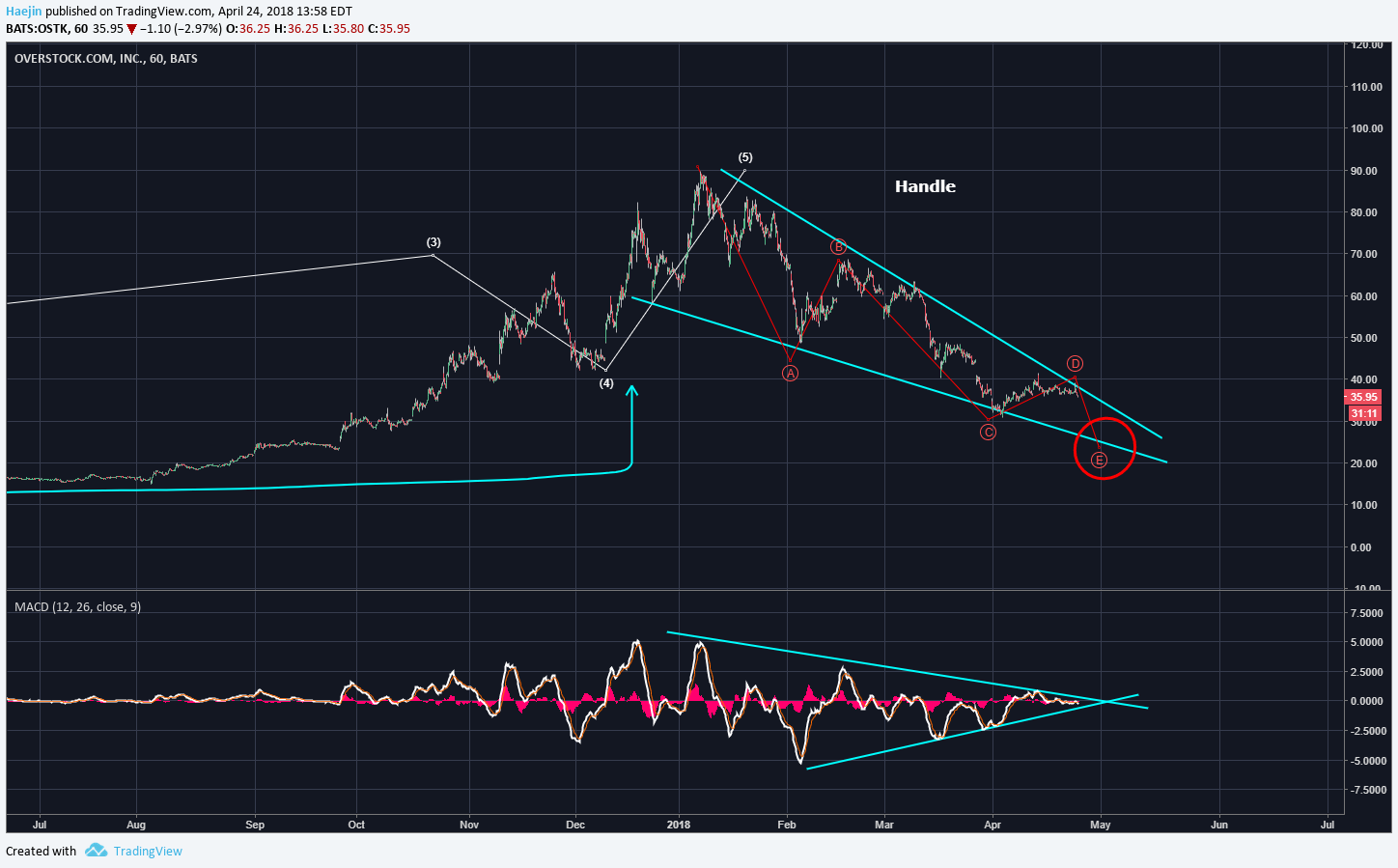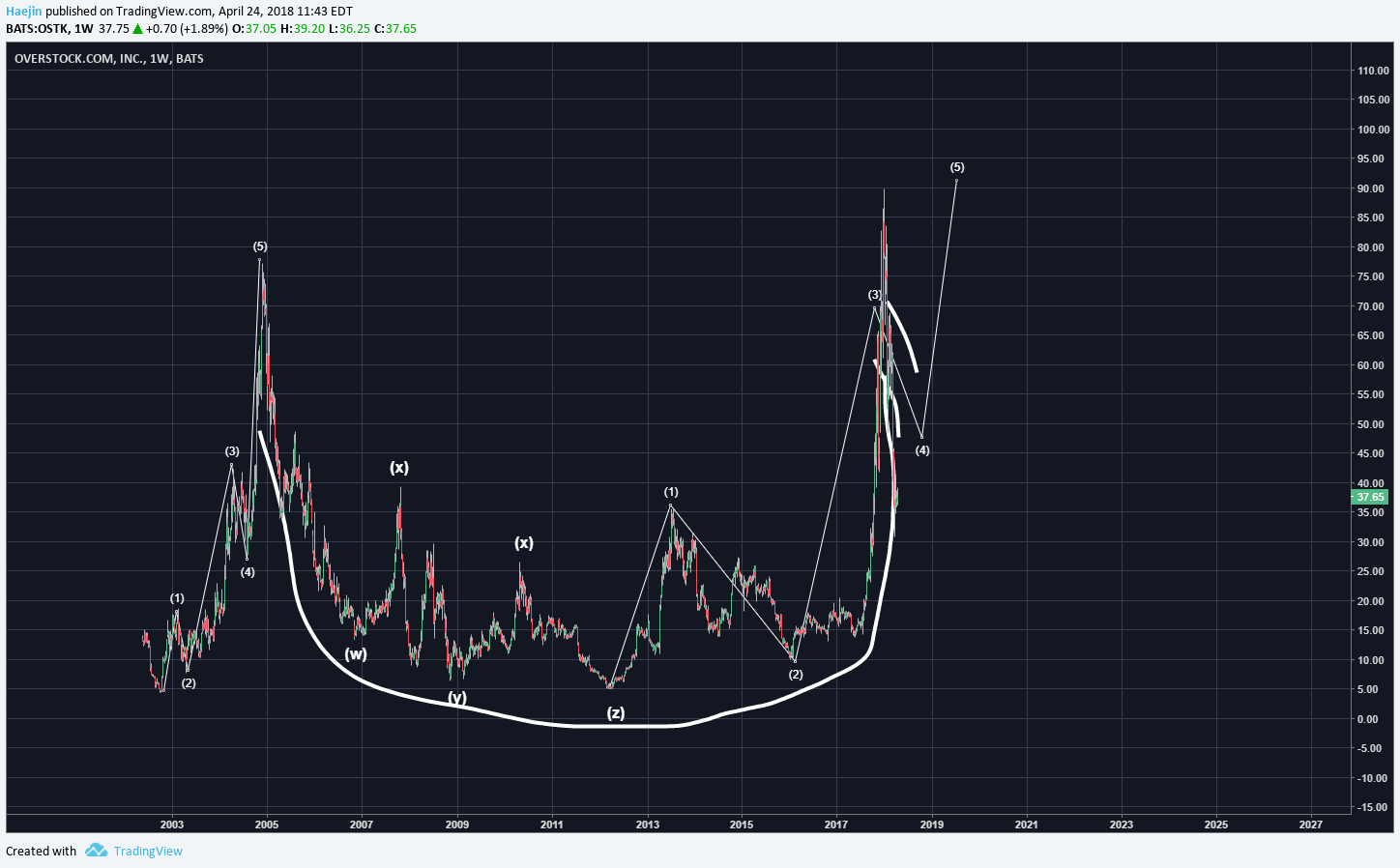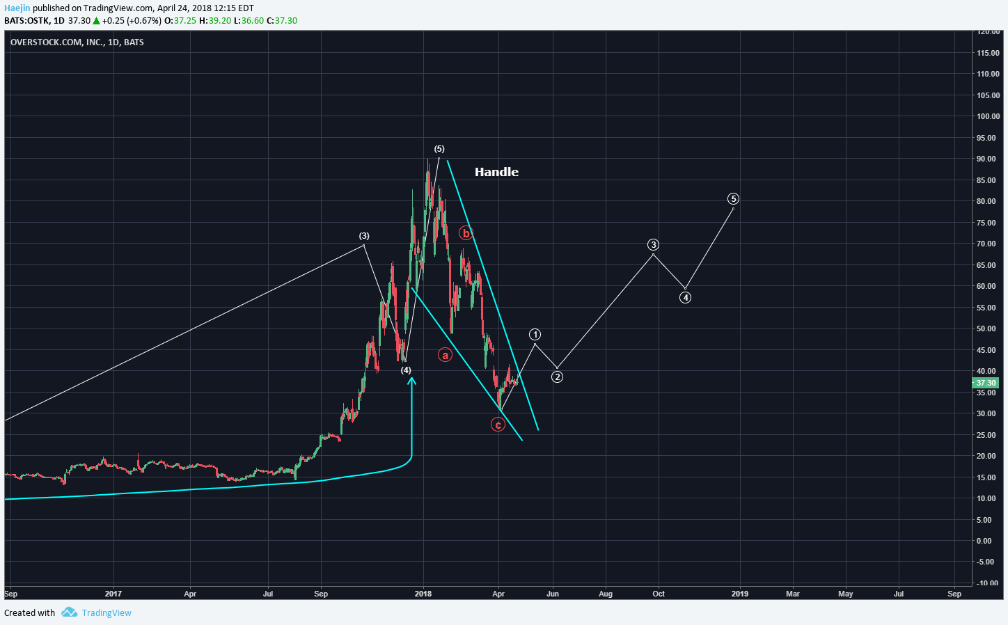 <center></center> -- **SUMMARY** The below weekly chart of Overstock (OSTK) is one I had provided to a client early in the year and most of it has it true except for a shift in time frame. I've always found time projection to be extremely difficult since it's not a reflection of sentiment, like price.  I've updated the weekly chart to reflect better the Cup formation which is massive in size and time. The near vertical ascent has to be corrected and this correction is likely generate the handle. Once the handle is complete; a bull run like never seen before should take place for OSTK.  A higher resolution daily chart shows that the red ABC corrective waves could be, if not already, complete! IF price can breach the blue top line of the handle formation, it could spark some BIG moves!  Here is an alternate count for an ABCDE scenario:  **Legal Disclaimer**: I am not a financial advisor nor is any content in this article presented as financial advice. The information provided in this blog post and any other posts that I make and any accompanying material is for informational purposes only. It should not be considered financial or investment advice of any kind. One should consult with a financial or investment professional to determine what may be best for your individual needs. Plain English: This is only my opinion, make of it what you wish. What does this mean? It means it's not advice nor recommendation to either buy or sell anything! It's only meant for use as informative or entertainment purposes. </center> Please consider reviewing these Tutorials on: [Elliott Wave Counting Tutorial #1](https://steemit.com/bitcoin/@haejin/elliott-wave-tutorial-1-by-haejin) [Elliott Wave Counting Tutorial #2](https://steemit.com/bitcoin/@haejin/elliott-wave-tutorial-video-2-zig-zag-and-flat-corrections-how-to-recognize-and-label-corrective-waves) [Elliott Wave Counting Tutorial #3](https://steemit.com/bitcoin/@haejin/elliott-wave-tutorial-iii-how-to-label-and-apply-triangle-price-corrections) [Laddering](https://steemit.com/bitcoin/@haejin/an-effective-buying-and-selling-strategy-laddering-a-tutorial-on-to-cast-a-ladder) and [Buy/Sell Setups](https://steemit.com/bitcoin/@haejin/when-to-buy-and-sell-using-elliott-waves-a-tutorial). [Laddering Example with EOS](https://steemit.com/bitcoin/@haejin/eos-target-usd3-22-analysis-update-live-real-time-laddering-example-you-don-t-want-to-miss-this) [Tutorial on the use of Fibonacci & Elliott Waves](https://steemit.com/bitcoin/@haejin/tutorial-on-the-use-of-fibonacci-ratio-and-elliott-waves) [@haejin's Trading Nuggets](https://steemit.com/bitcoin/@haejin/haejin-s-trading-nuggets-all-learned-through-tonnages-of-failure-experiences) [Essay: Is Technical Analysis a Quantum Event?](https://steemit.com/bitcoin/@haejin/essay-is-technical-analysis-a-quantum-event) Follow me on [Twitter](https://twitter.com/Haejin_Crypto) for Real Time Alerts!! Follow me on [StockTwits](https://stocktwits.com/HaejinCrypto) for UpDates!! -- -- <center>https://steemitimages.com/DQmWpisRXDF56mV3DgzzPUxb3R2ozseR48YVr2YKtwtrBcV/DQmWpisRXDF56mV3DgzzPUxb3R2ozseR48YVr2YKtwtrBcV.gif <center>https://steemitimages.com/0x0/https://s1.postimg.org/231h83mh7z/U5drx_NFe_Q4_Nn_YGEb9rq2_V47_X6_Yk_AQsm.gif</center>
