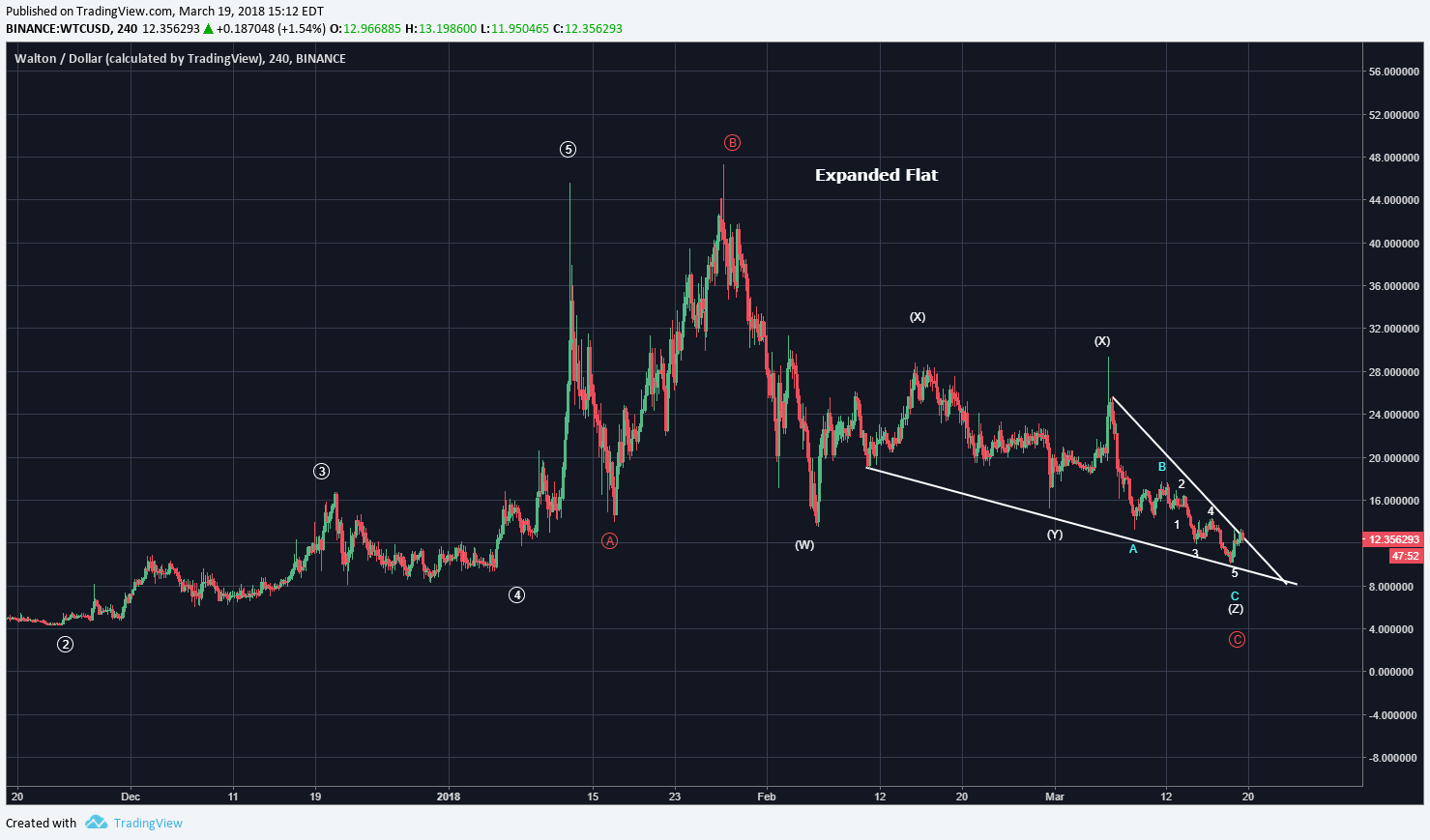 <center></center> -- **SUMMARY** Walton Chain (WTC) is about complete, if not already, with an expanded flat. This is an ABC correction, except the B wave is higher than the origin of A. As you can see in the below chart, the B wave is higher that prior white circled wave 5, which is the same as the start of the red A. The C wave has morphed into a downward wedge, which is the second most common pattern in cryptos.  The subdivision of wave C has several ways and I've selected the wxyxz. All waves seem and look complete. However, price still remains within the confines of the downward wedge boundaries.  Drilling even deeper confirms the probabilit of this ABC being complete as being high. Let's see how the next few days' price action pan out. The alternate is that price continue its sideways action.  **Legal Disclaimer**: I am not a financial advisor nor is any content in this article presented as financial advice. The information provided in this blog post and any other posts that I make and any accompanying material is for informational purposes only. It should not be considered financial or investment advice of any kind. One should consult with a financial or investment professional to determine what may be best for your individual needs. Plain English: This is only my opinion, make of it what you wish. What does this mean? It means it's not advice nor recommendation to either buy or sell anything! It's only meant for use as informative or entertainment purposes. </center> Please consider reviewing these Tutorials on: [Elliott Wave Counting Tutorial #1](https://steemit.com/bitcoin/@haejin/elliott-wave-tutorial-1-by-haejin) [Elliott Wave Counting Tutorial #2](https://steemit.com/bitcoin/@haejin/elliott-wave-tutorial-video-2-zig-zag-and-flat-corrections-how-to-recognize-and-label-corrective-waves) [Elliott Wave Counting Tutorial #3](https://steemit.com/bitcoin/@haejin/elliott-wave-tutorial-iii-how-to-label-and-apply-triangle-price-corrections) [Laddering](https://steemit.com/bitcoin/@haejin/an-effective-buying-and-selling-strategy-laddering-a-tutorial-on-to-cast-a-ladder) and [Buy/Sell Setups](https://steemit.com/bitcoin/@haejin/when-to-buy-and-sell-using-elliott-waves-a-tutorial). [Laddering Example with EOS](https://steemit.com/bitcoin/@haejin/eos-target-usd3-22-analysis-update-live-real-time-laddering-example-you-don-t-want-to-miss-this) [Tutorial on the use of Fibonacci & Elliott Waves](https://steemit.com/bitcoin/@haejin/tutorial-on-the-use-of-fibonacci-ratio-and-elliott-waves) [@haejin's Trading Nuggets](https://steemit.com/bitcoin/@haejin/haejin-s-trading-nuggets-all-learned-through-tonnages-of-failure-experiences) [Essay: Is Technical Analysis a Quantum Event?](https://steemit.com/bitcoin/@haejin/essay-is-technical-analysis-a-quantum-event) Follow me on [Twitter](https://twitter.com/Haejin_Crypto) for Real Time Alerts!! Follow me on [StockTwits](https://stocktwits.com/HaejinCrypto) for UpDates!! -- -- <center>https://steemitimages.com/DQmWpisRXDF56mV3DgzzPUxb3R2ozseR48YVr2YKtwtrBcV/DQmWpisRXDF56mV3DgzzPUxb3R2ozseR48YVr2YKtwtrBcV.gif <center>https://steemitimages.com/0x0/https://s1.postimg.org/231h83mh7z/U5drx_NFe_Q4_Nn_YGEb9rq2_V47_X6_Yk_AQsm.gif</center>